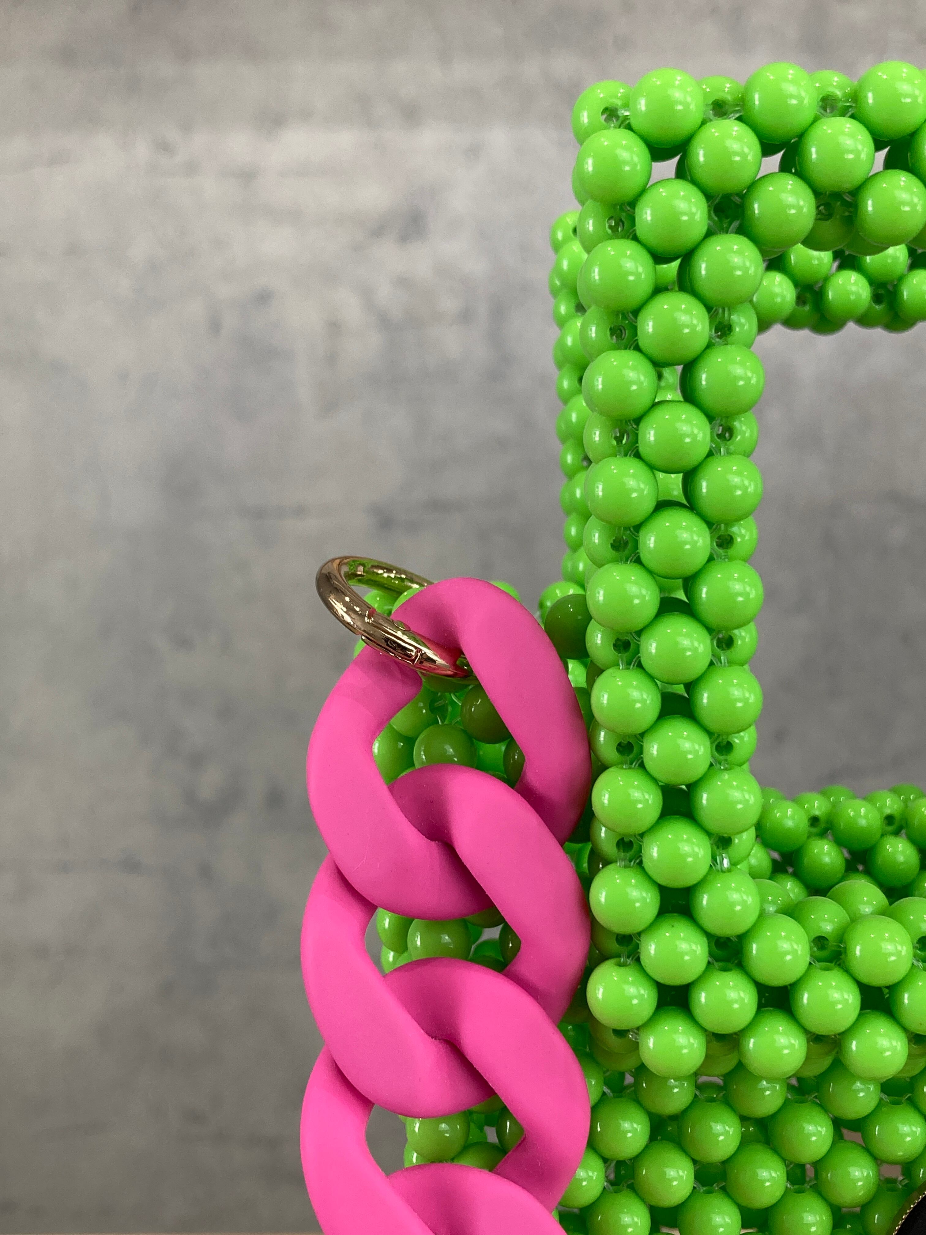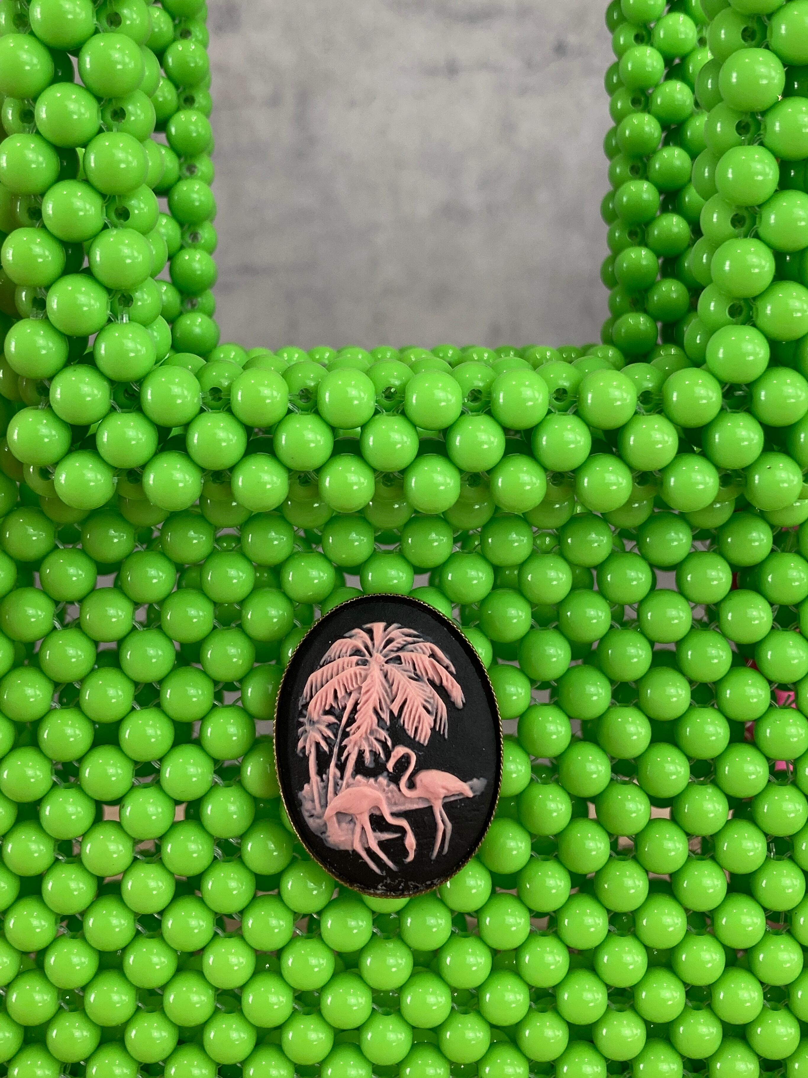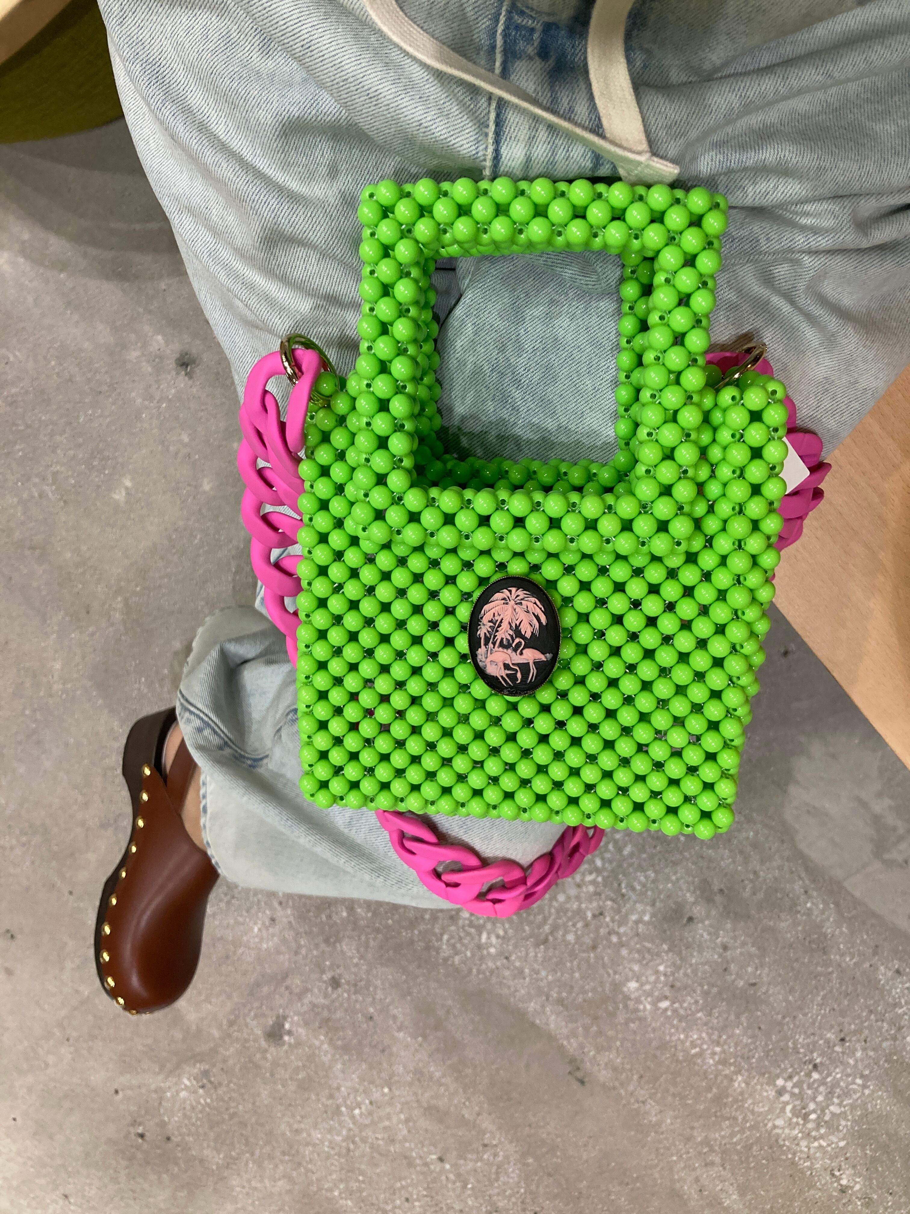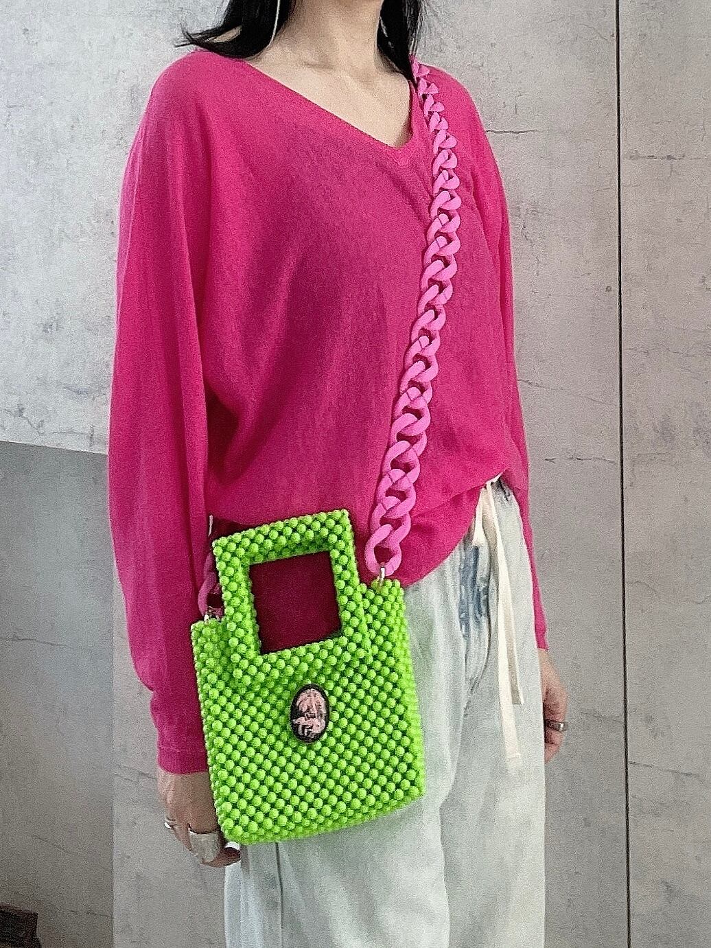 ポップなカラーと、マットなチェーン、フランスらしいカメオのピン使いがクラシックとポップな融合がパリらしいビーズBAG。