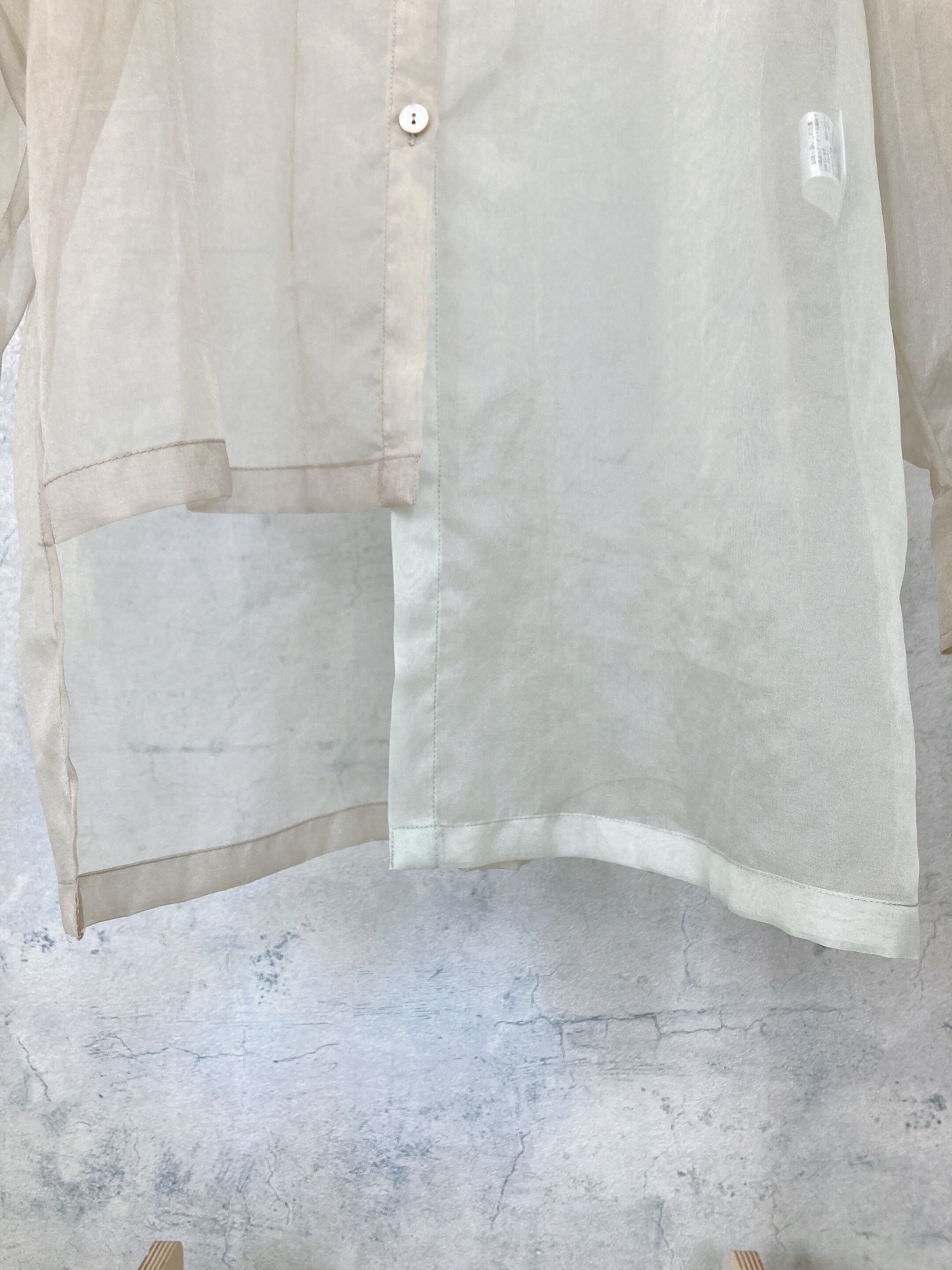 軽やかでパウダリーなナイロンオーガンジーブラウス。フロントのカラーはさり気なくbeige/iceの2トーンになっている事もヨーロッパらしい色合い。