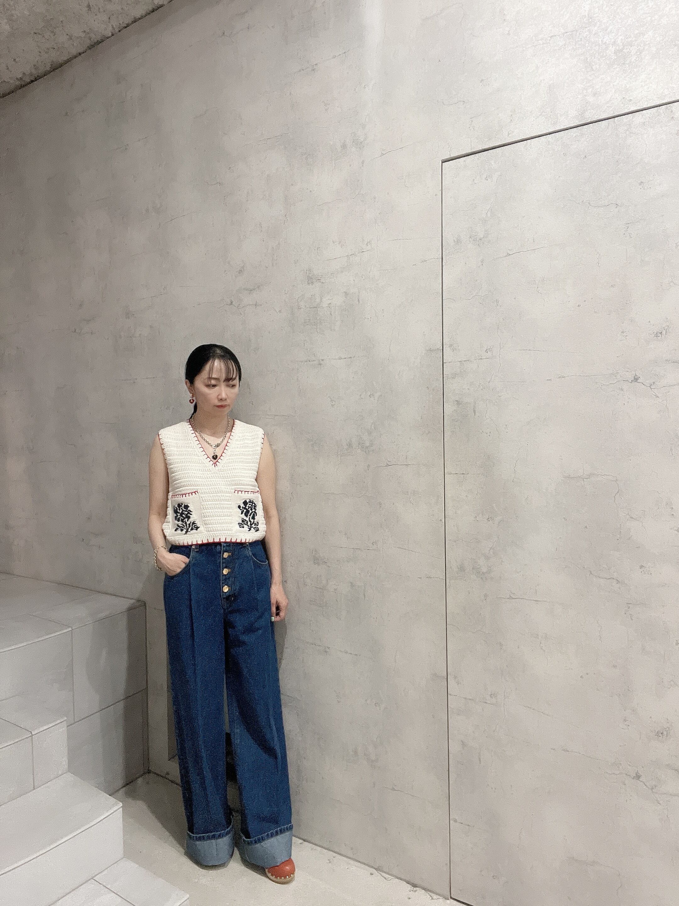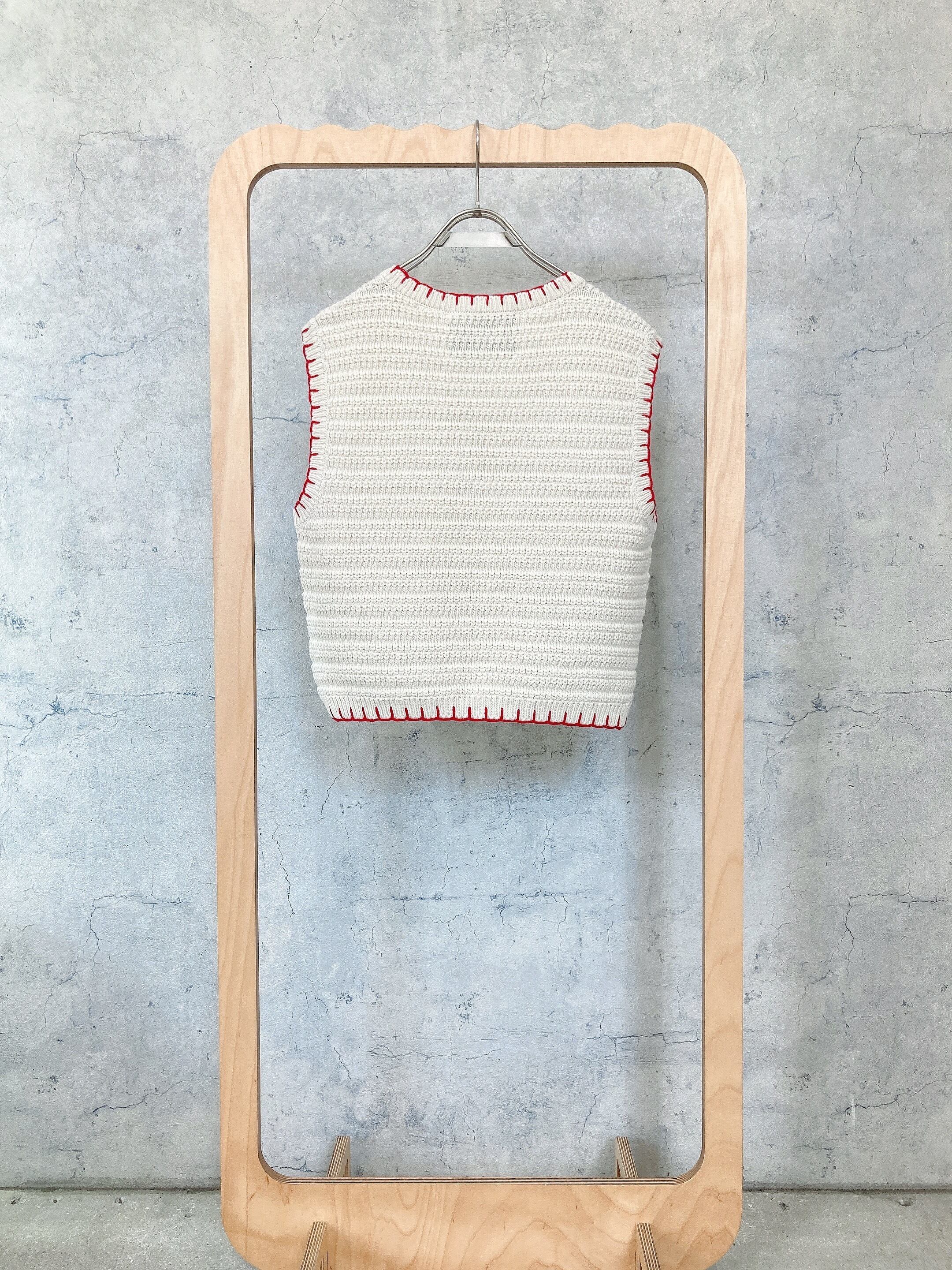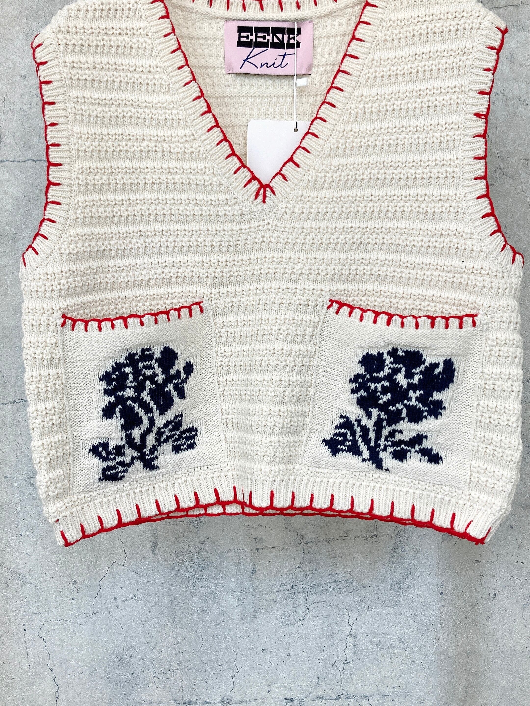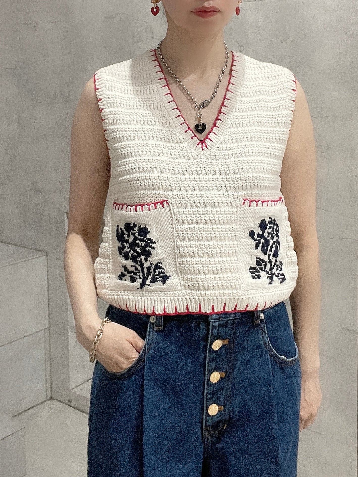 ローゲージのコットンウールベスト。RedのステッチとネイビーのRoseのエンブロイダリーがレトロトレンドなスタイル。1枚で着用しても、シャツやカットソーにレイヤードしてもポイントになってくれる1枚。