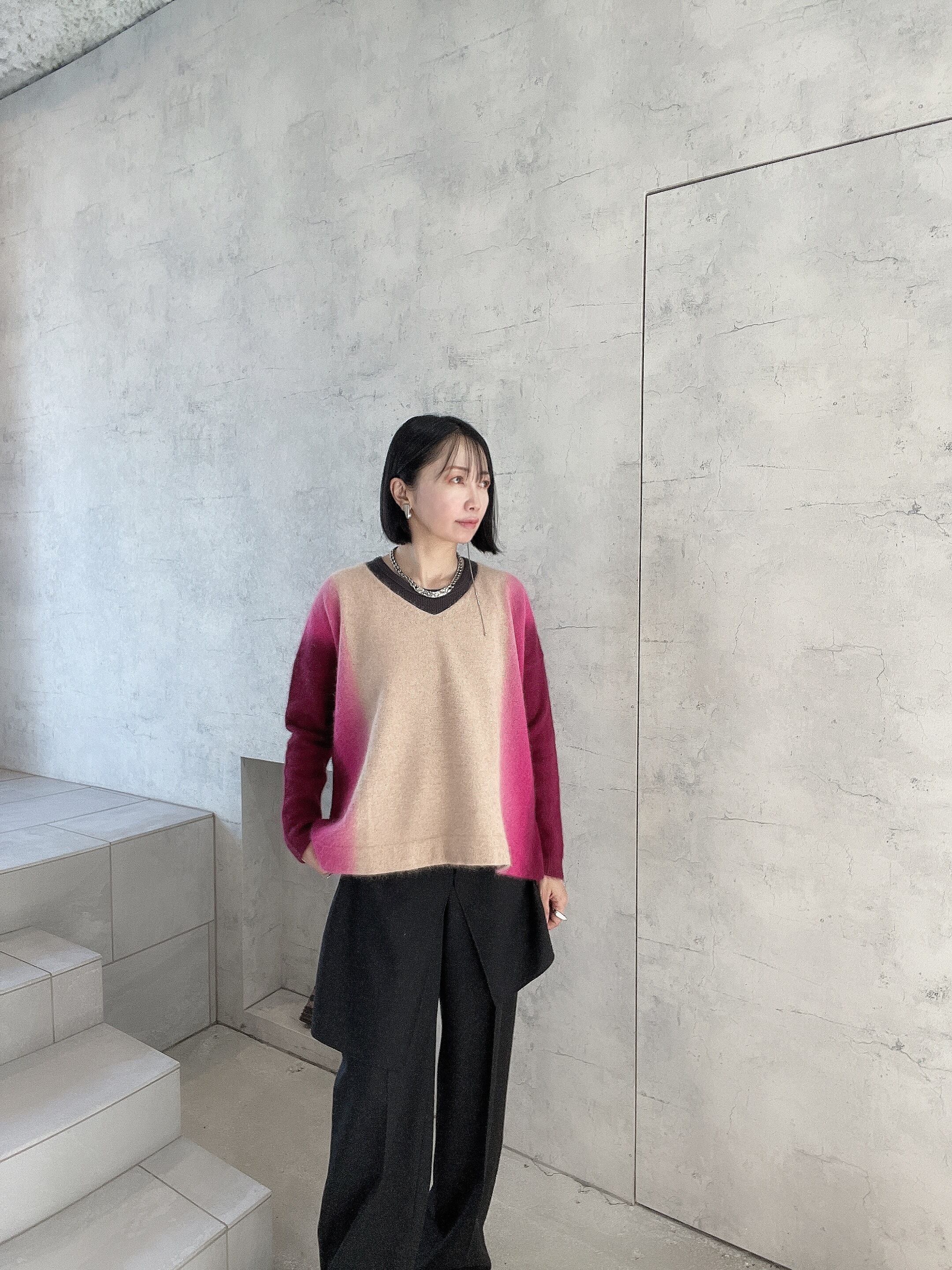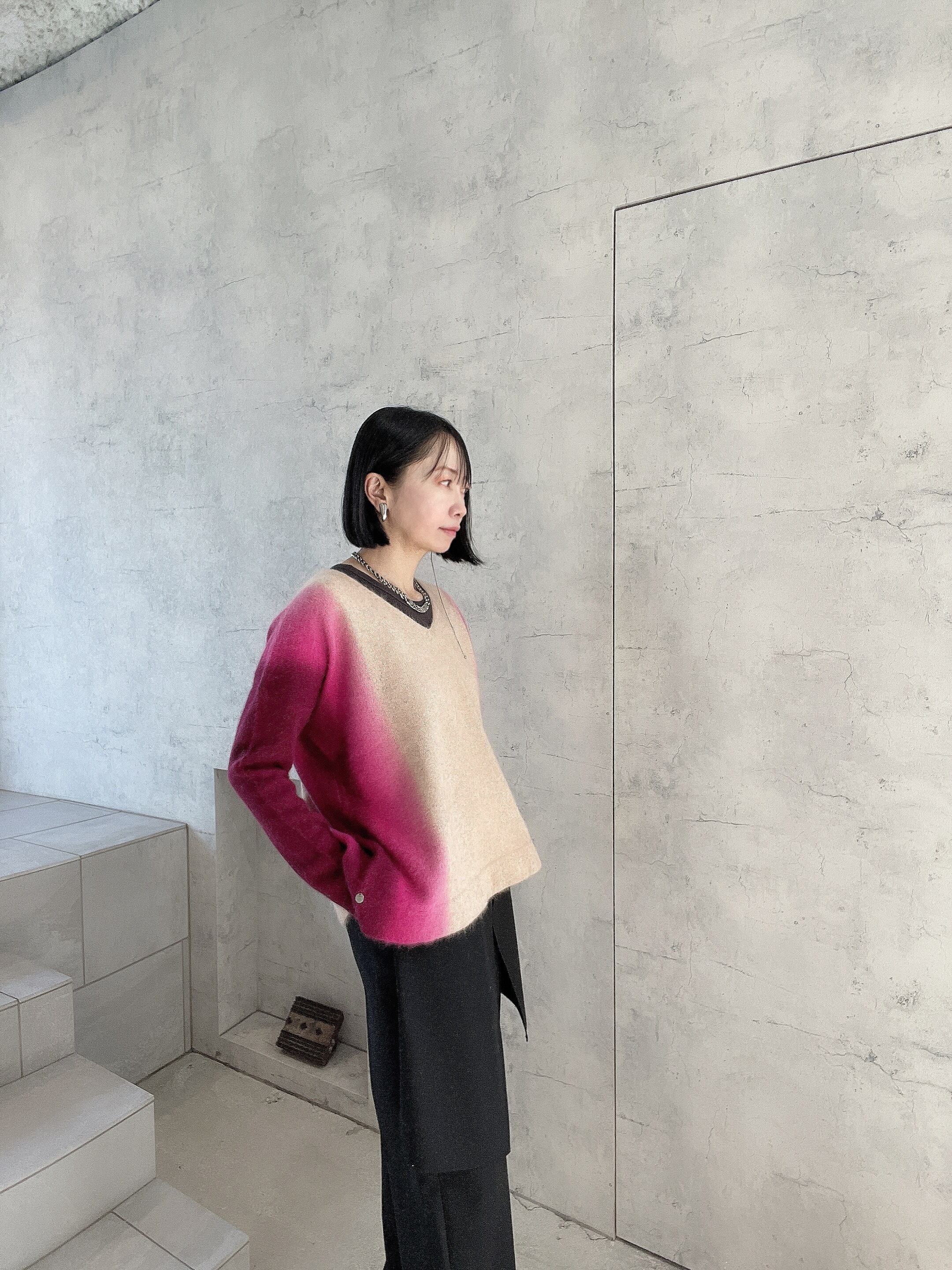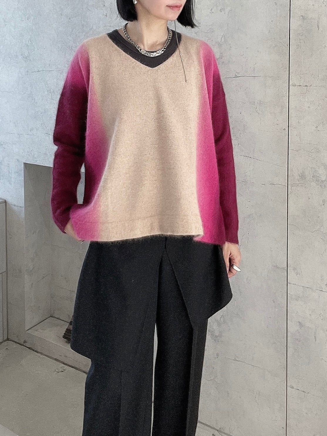 Naturalカラーな柔らかなbeigeにRoseピンク、ヒューシャピンクへと高い技術でセンスの良いグラデーションカラー。Vネックでスッキリしたスタイルに。
