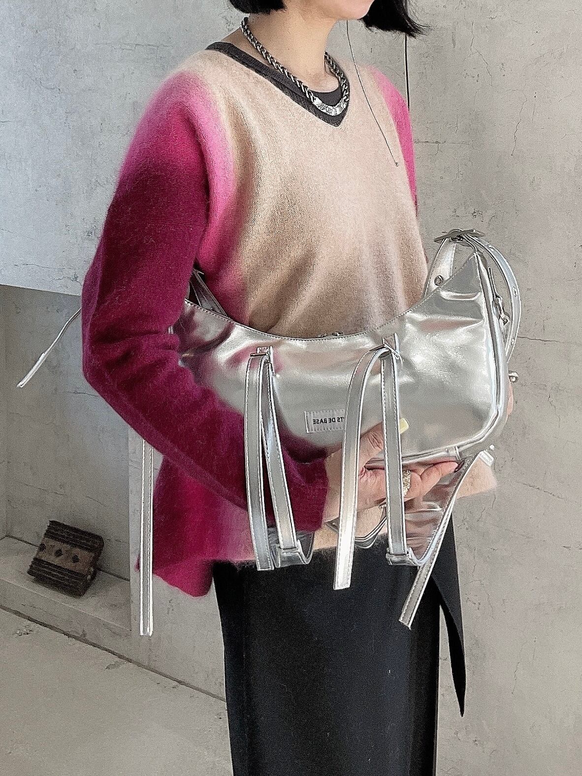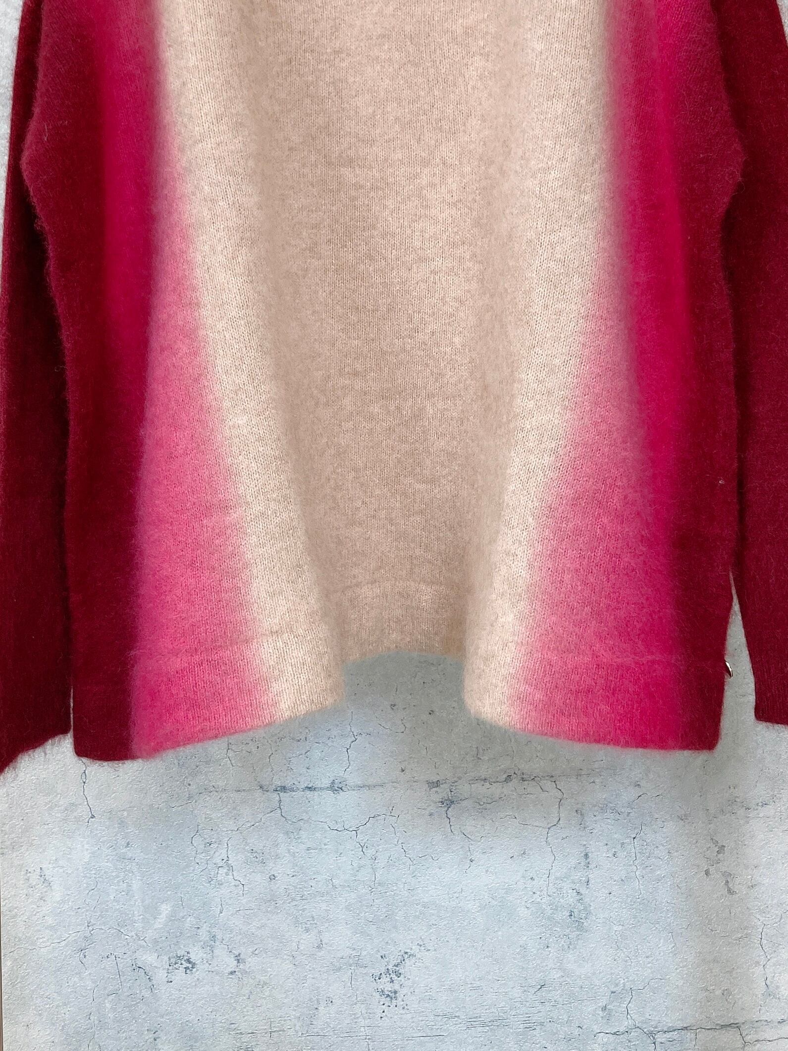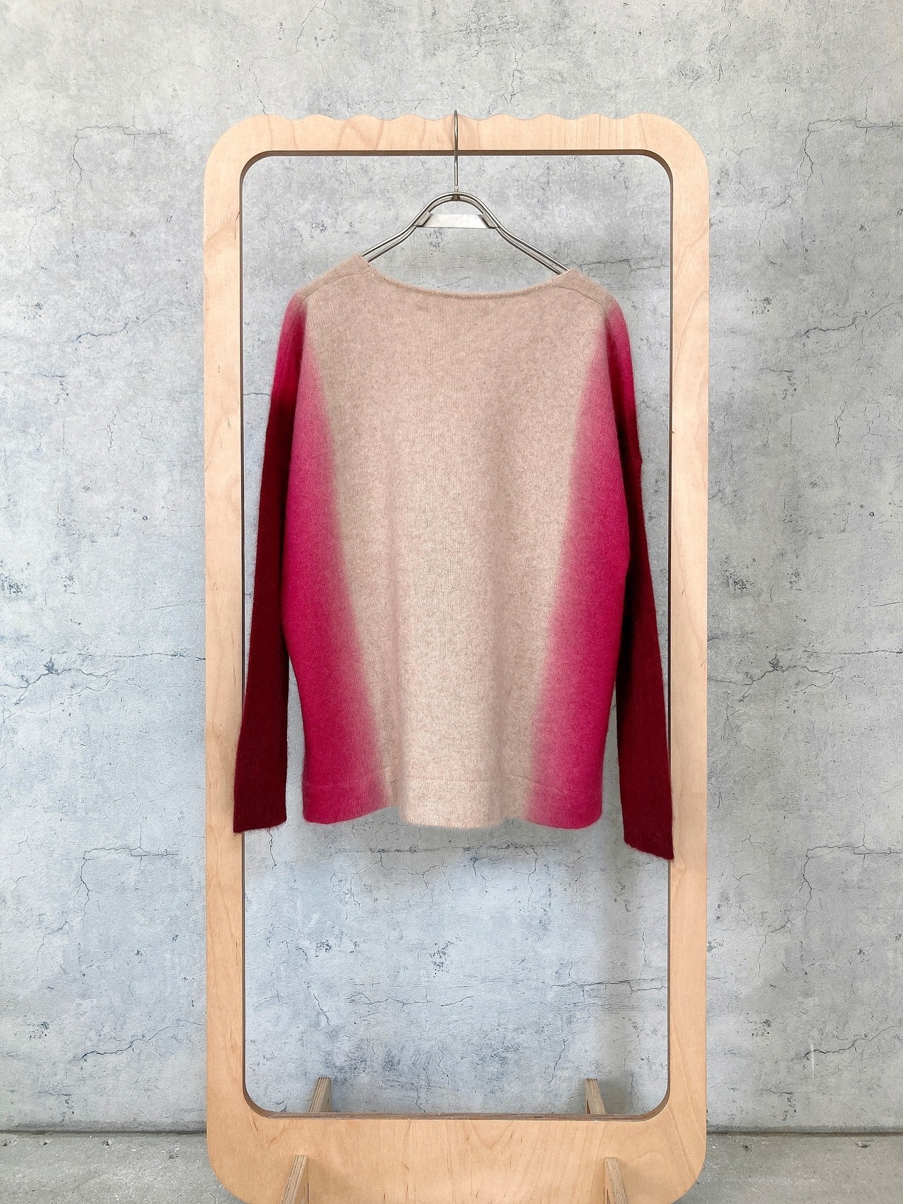 Naturalカラーな柔らかなbeigeにRoseピンク、ヒューシャピンクへと高い技術でセンスの良いグラデーションカラー。Vネックでスッキリしたスタイルに。