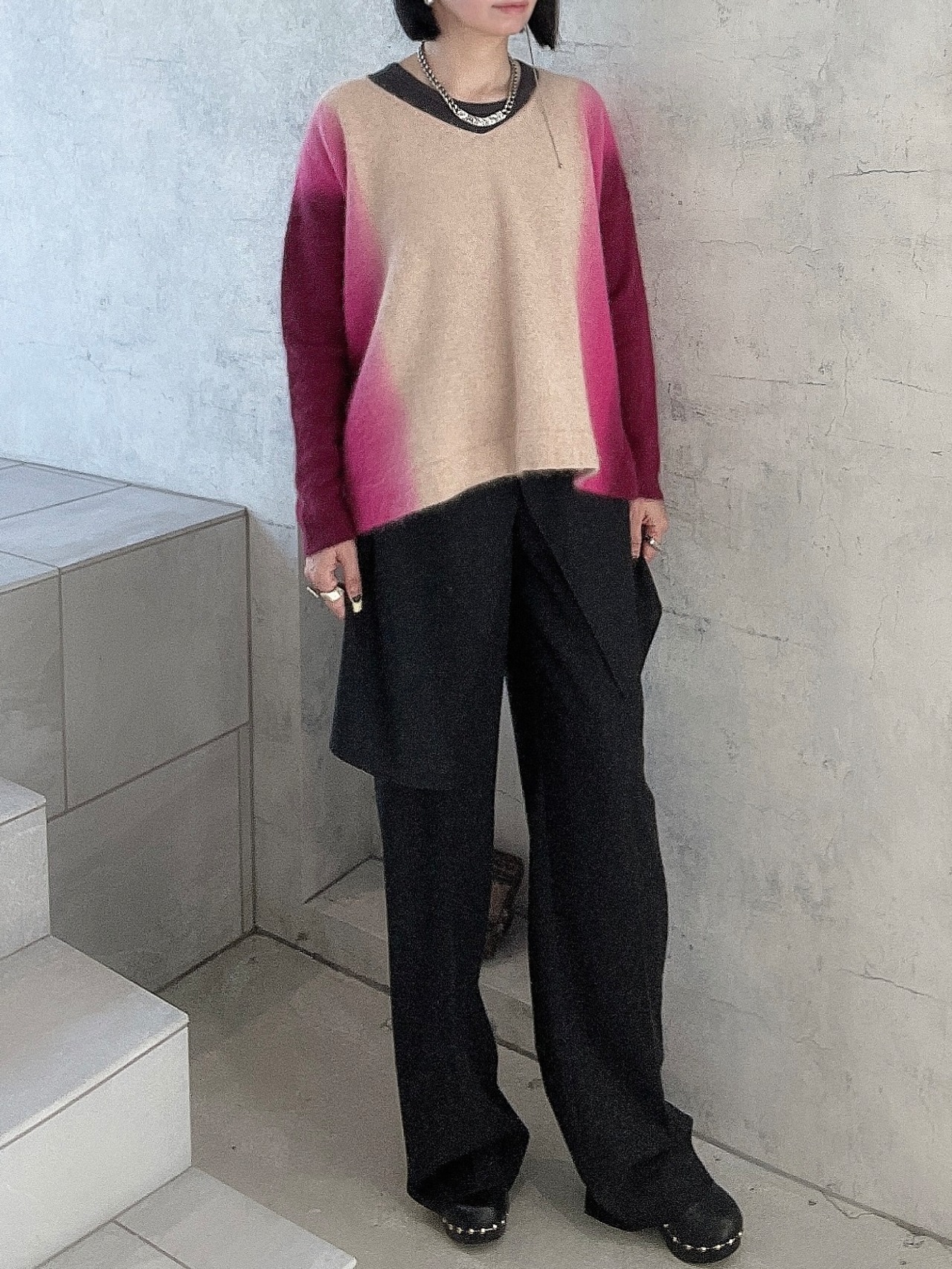 縦ラインに入ったグラデーションと可愛くなりすぎないpinkグラデーションがモードなスタイルに。