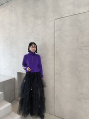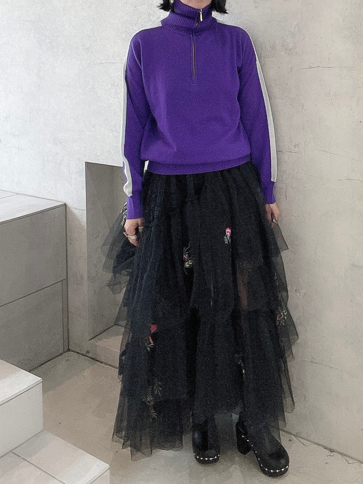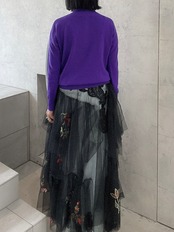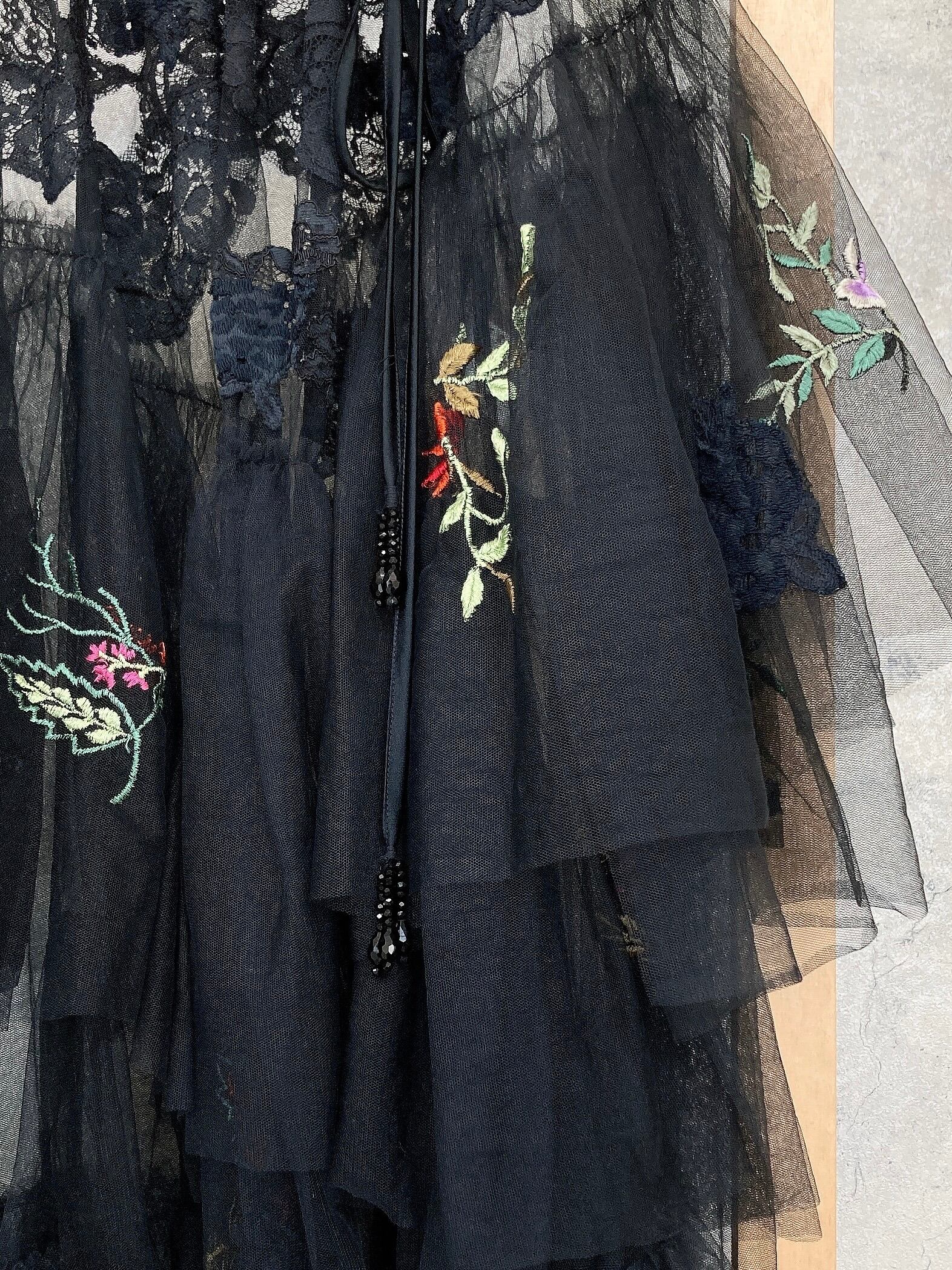 ウエストやチュール部ににレース、エンブロイダリーを贅沢にあしらったチュールスカート。一般的なティアードスカートと違い匠なパターンテクニックでチュールティアードだが広がらずスッキリと見せながらスタイルアップしてくれる珍しい一枚。