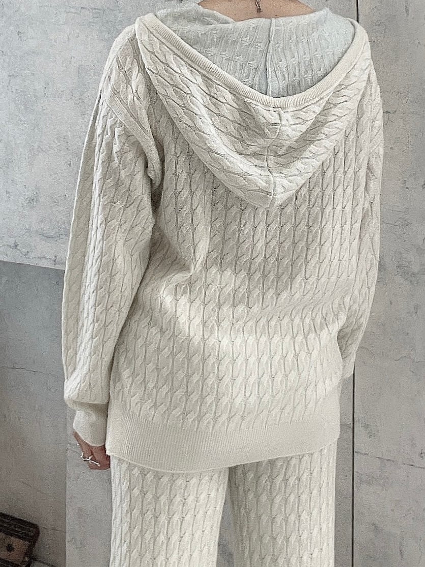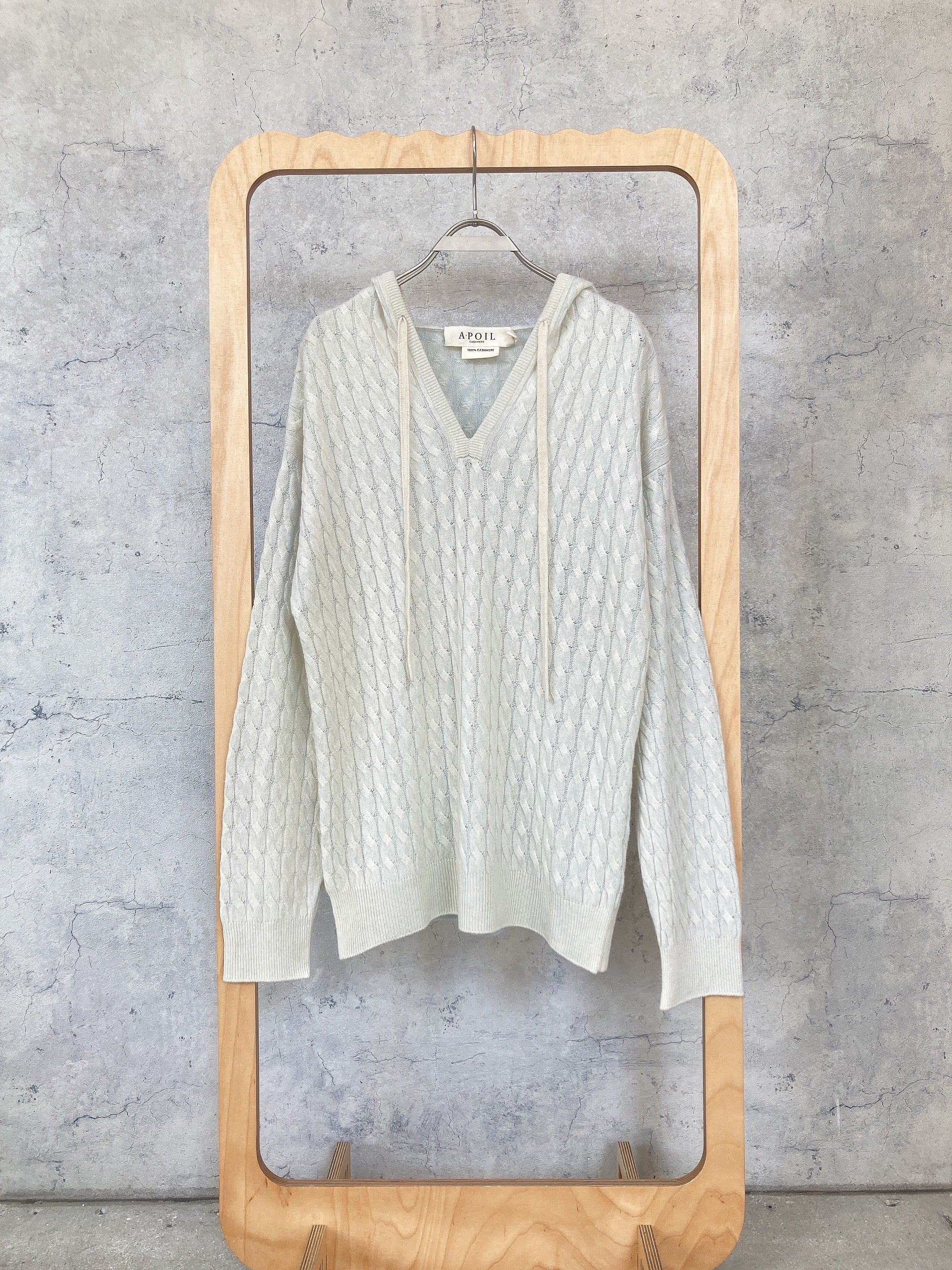 CIRCULATION送料無料【A・POIL アーポワル/フランス】リバーシブルニット ケーブルVネックカシミヤフーディーニット カシミヤ100% リバーシブル ケーブル編み ブルー NO: AP HYPOTHERMIE / COL A(Natural Ecru/Print:Spray)