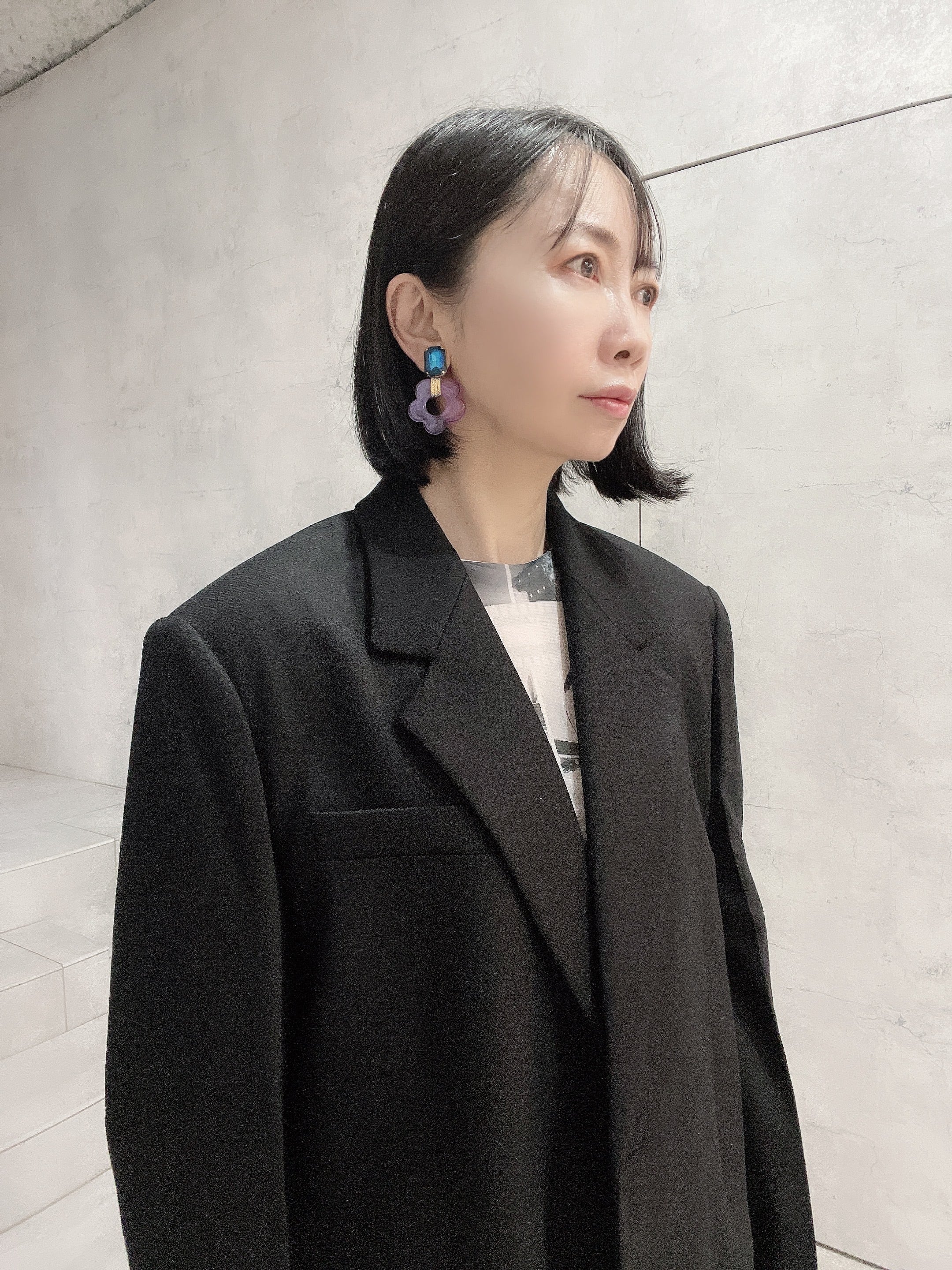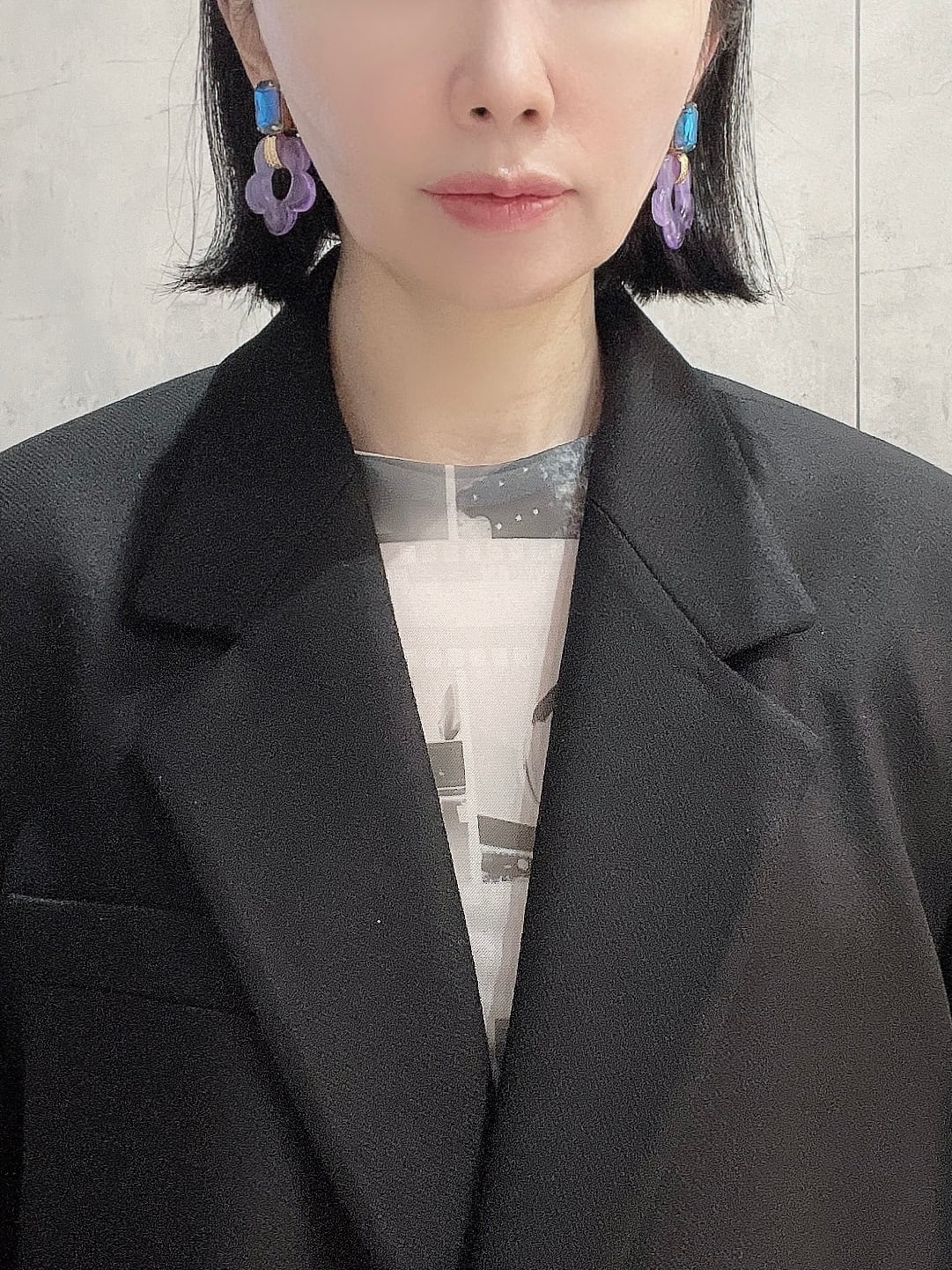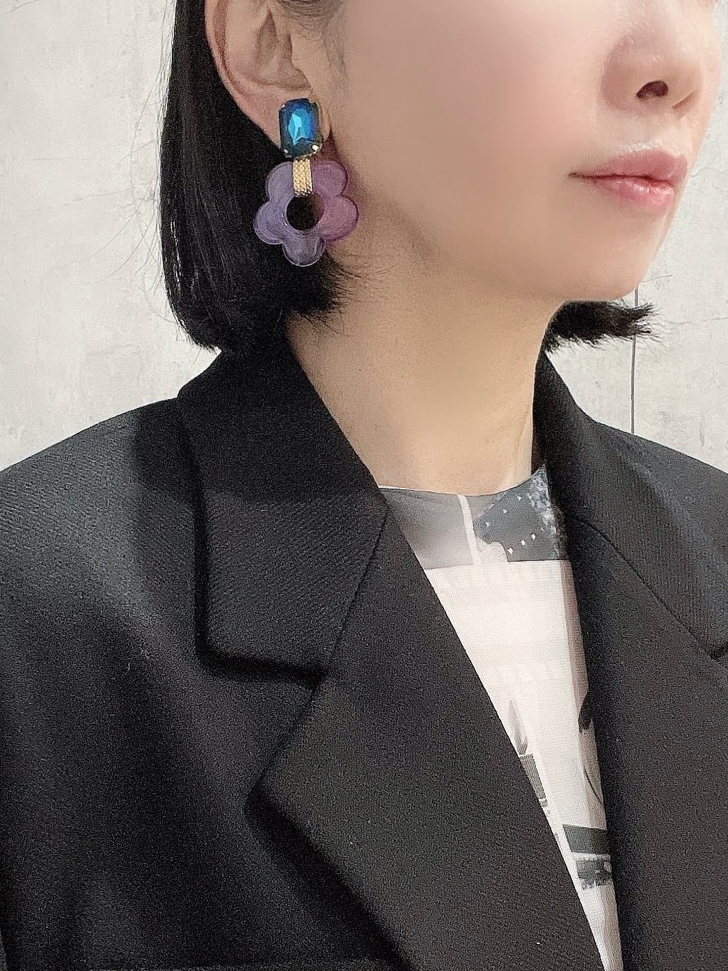 パーツが非常に綺麗でパリポップな大人のアクセサリーがシンプルなスタイルのポイントにも。