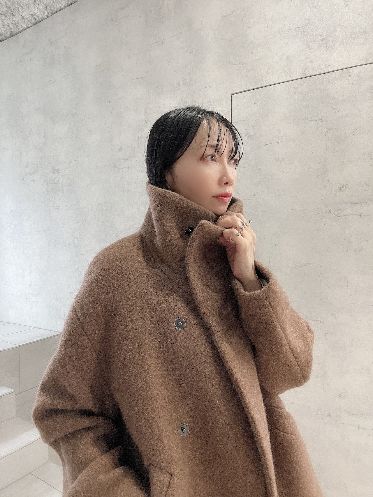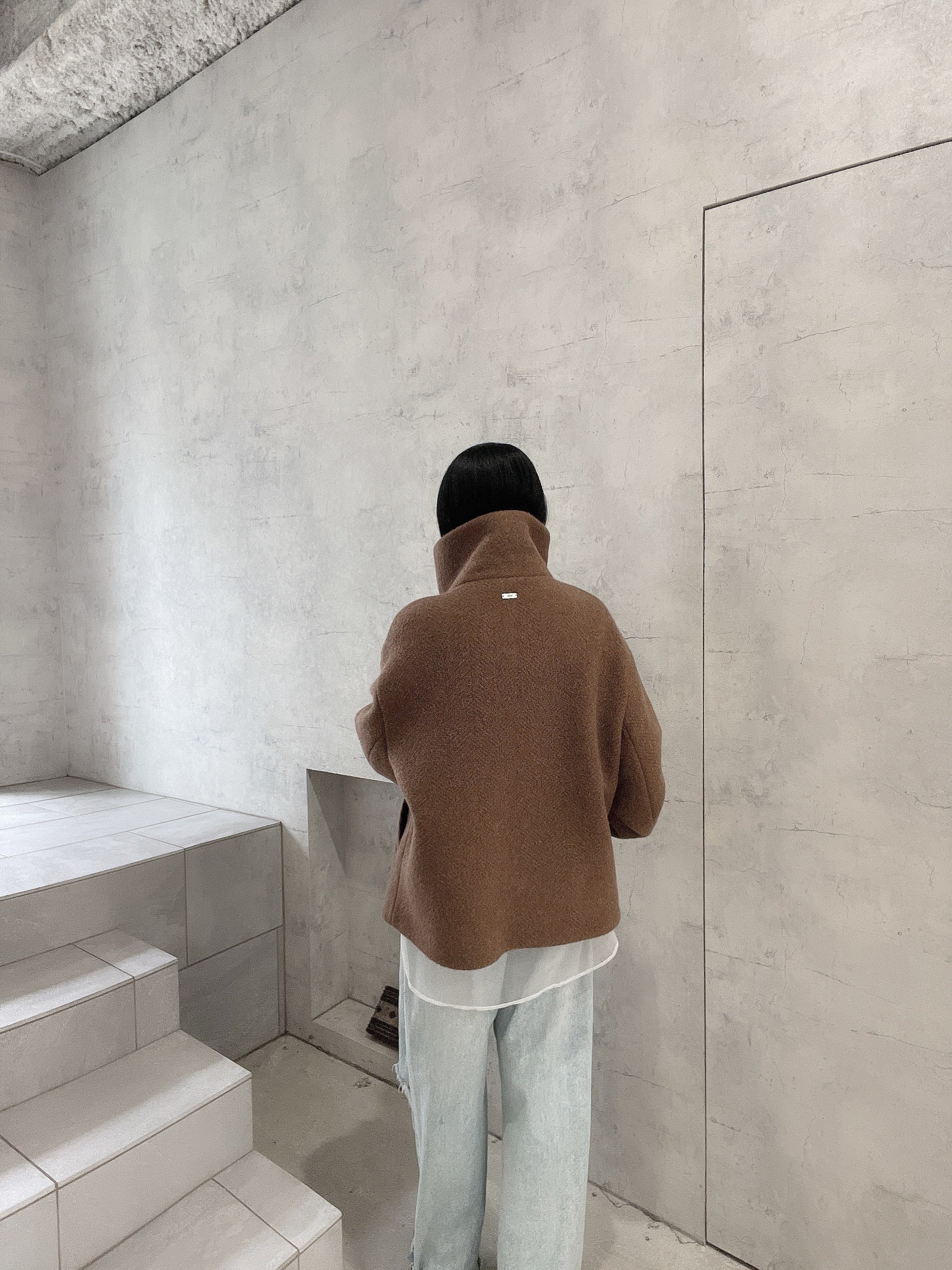 スタンドカラー着用時も襟が前下がりに美しくパターンが取られており、顎がすっぽり入って暖かく、小顔効果も。