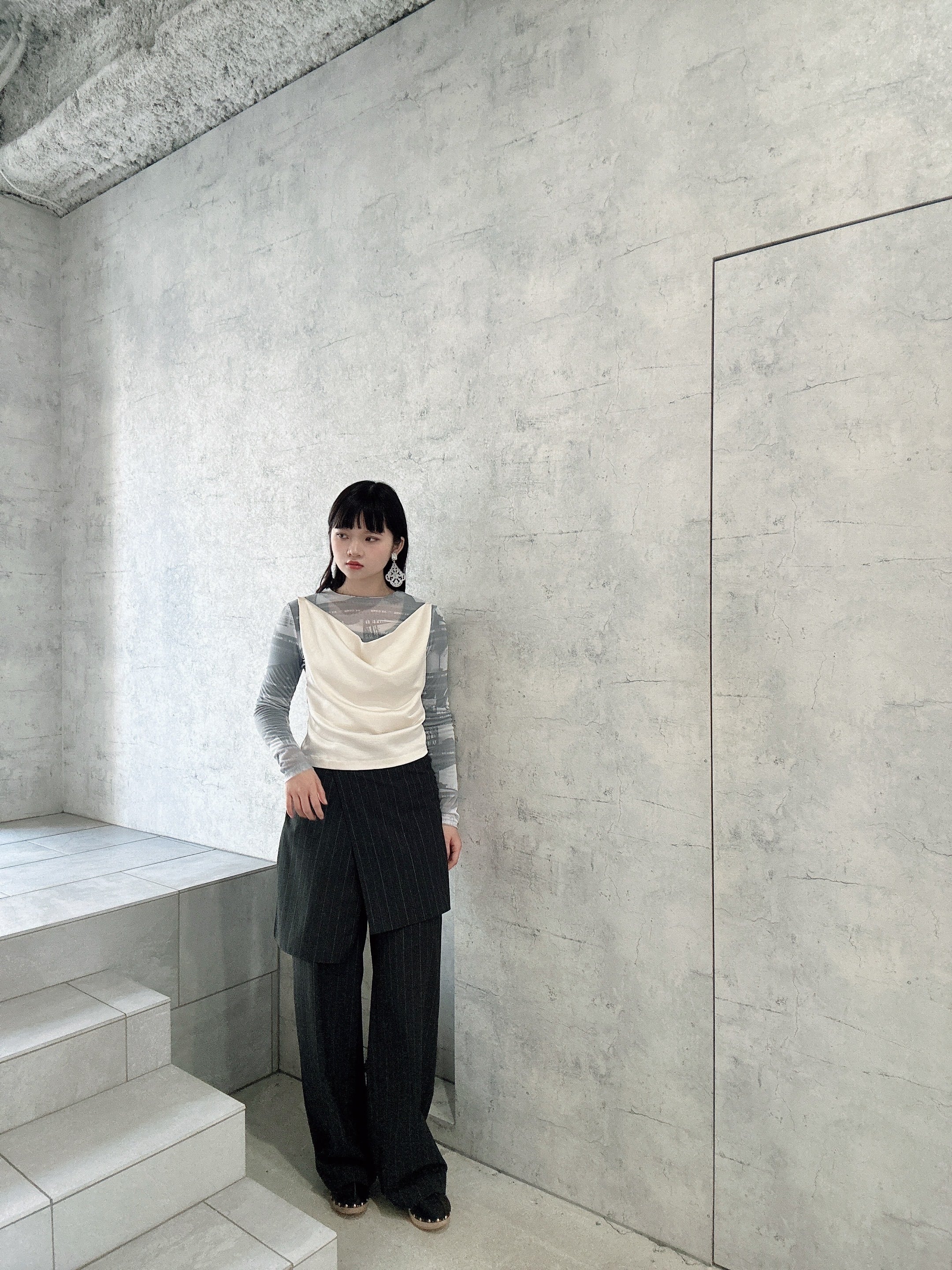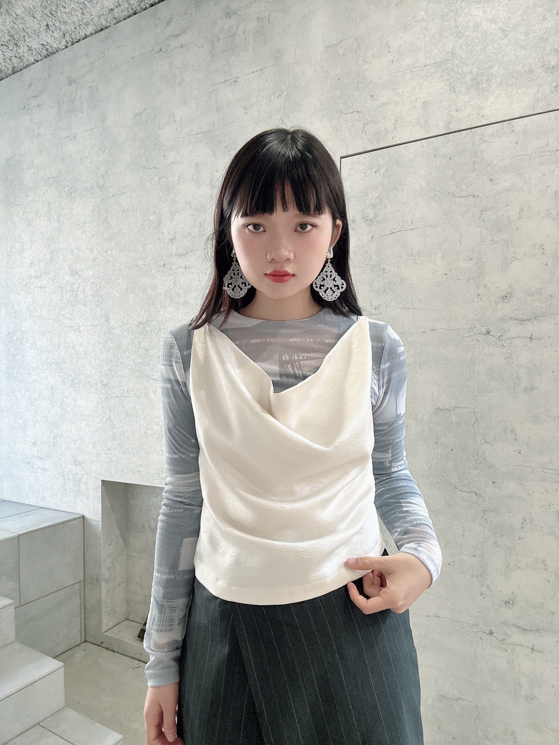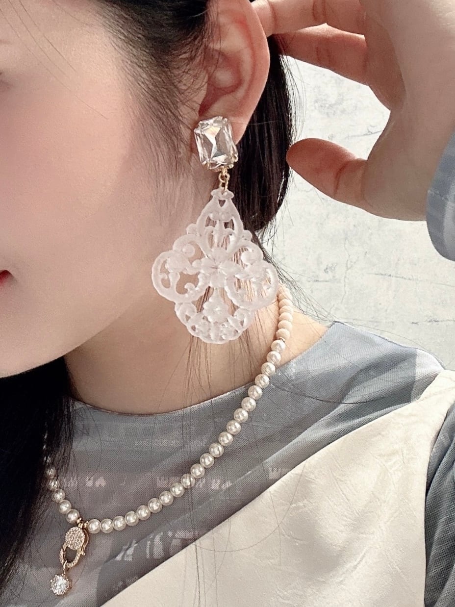 トップはシャイニー、シャンデリアモチーフはマットというバランスの良さがアクセントになりつつも光過ぎずスタイリングに馴染みやすいアクセサリー。