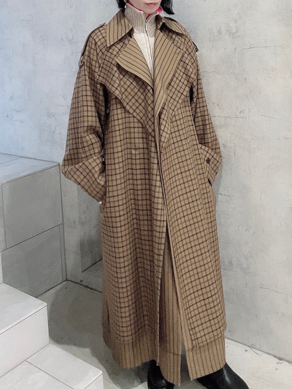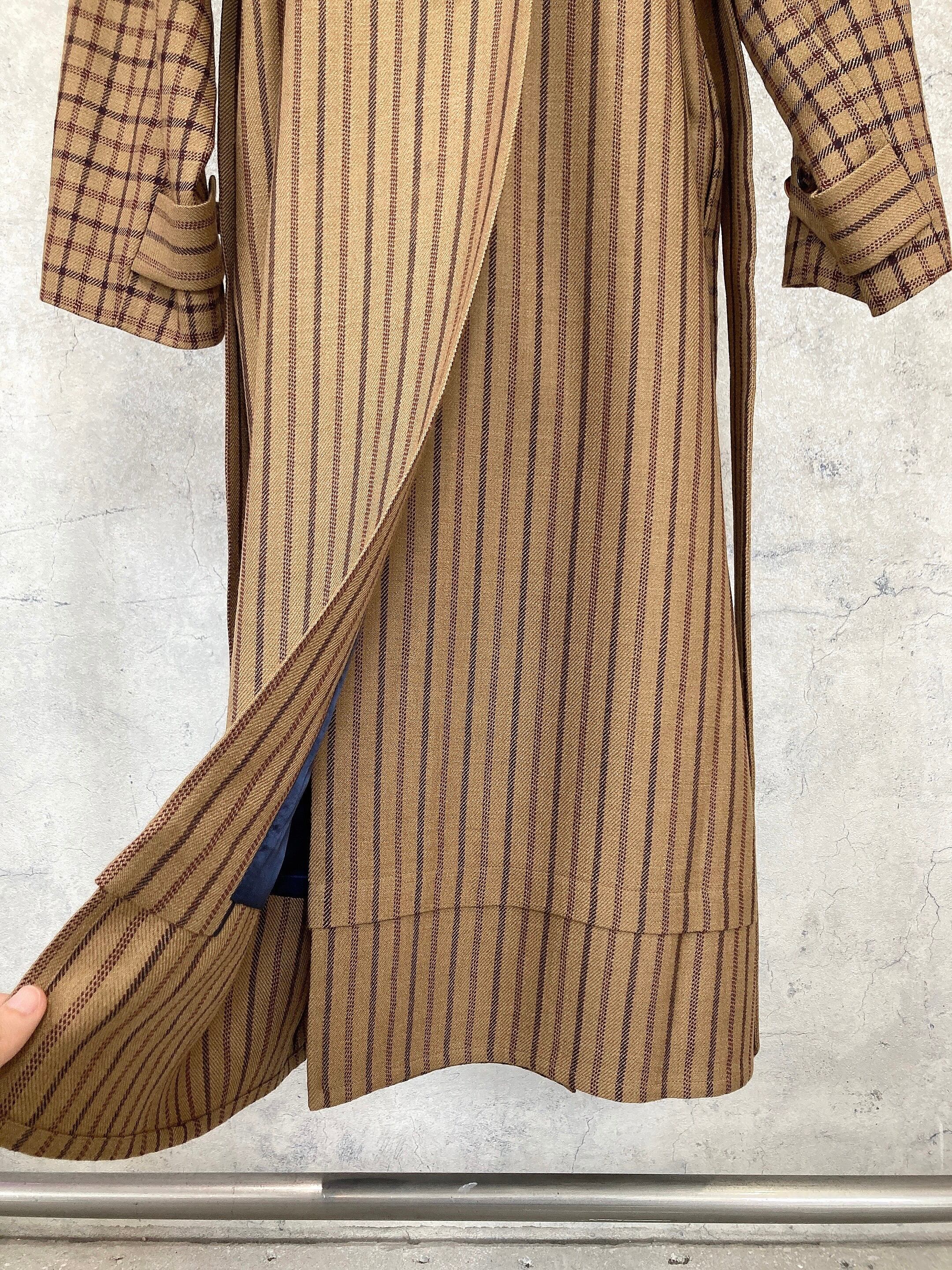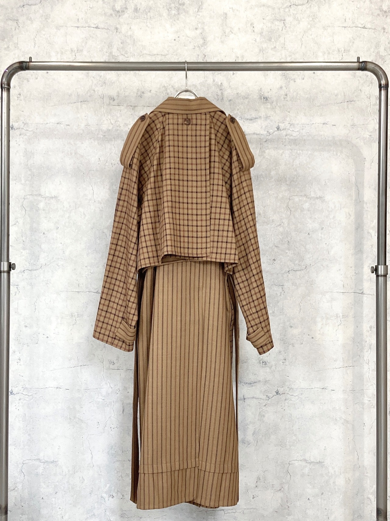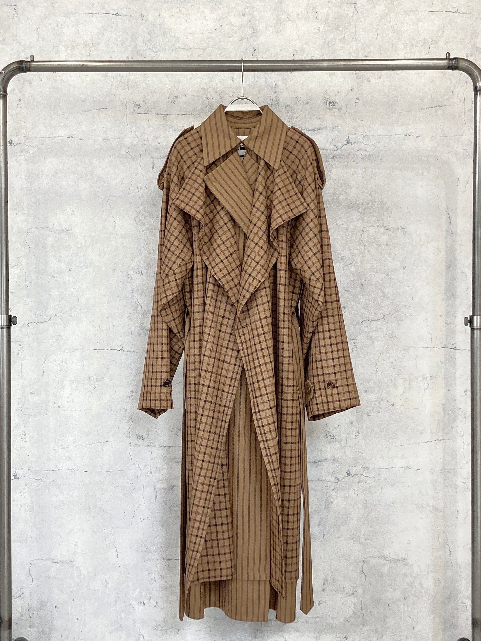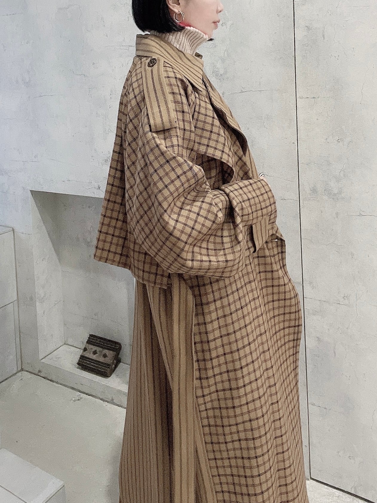 チェックとストライプの布地を匠なディテールでミックスしたトレンチコート。