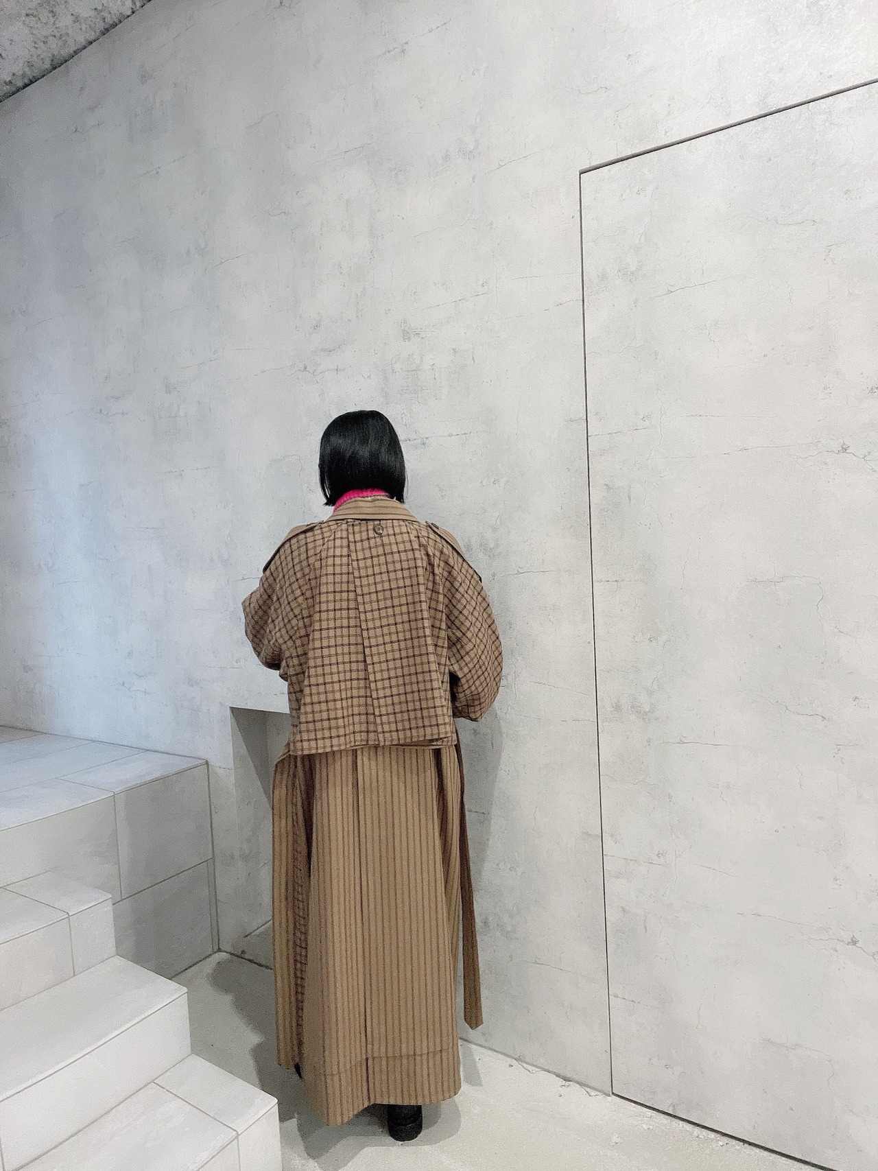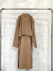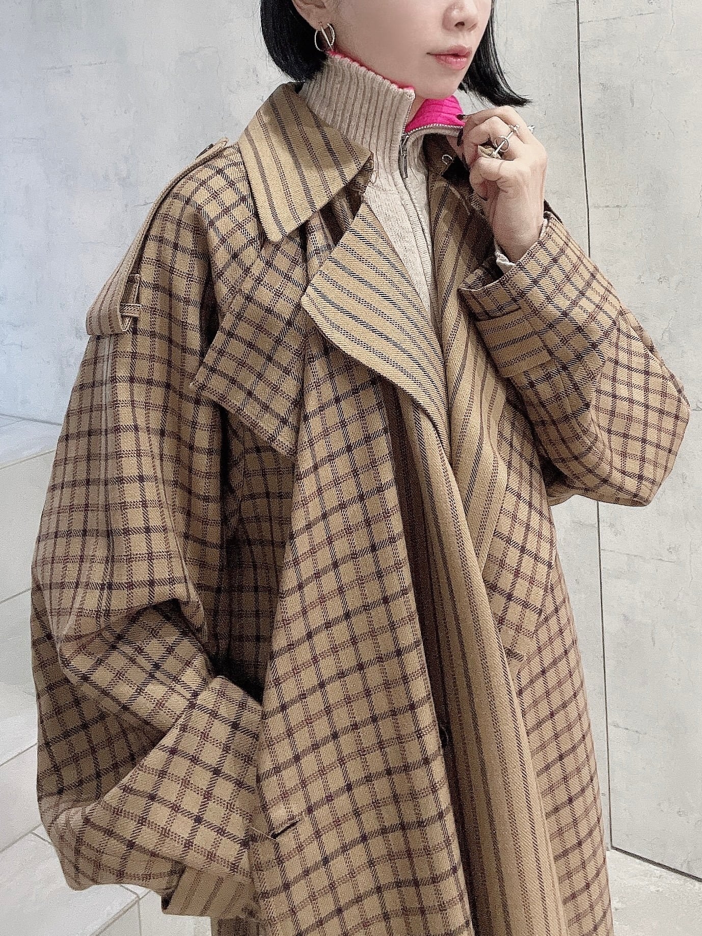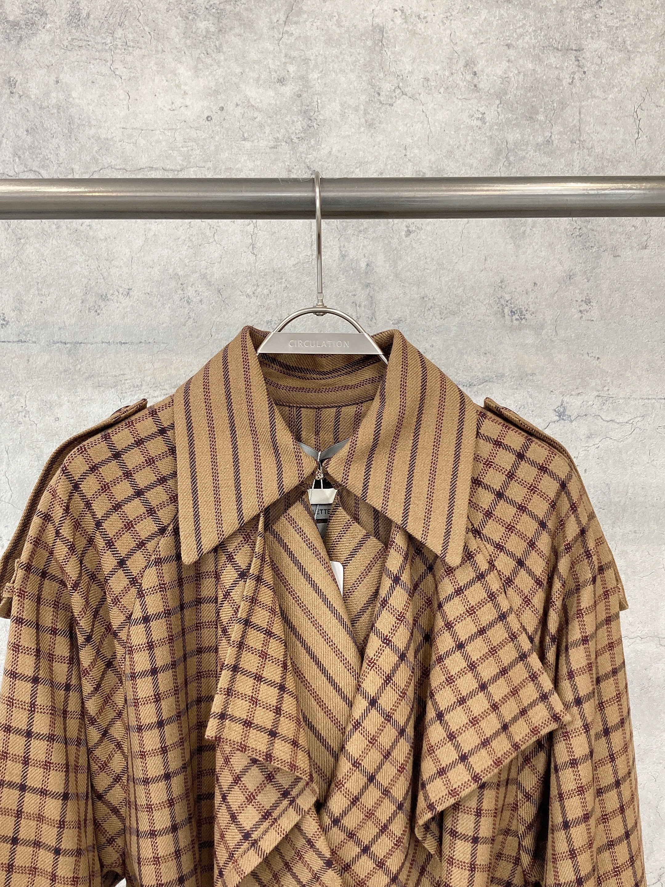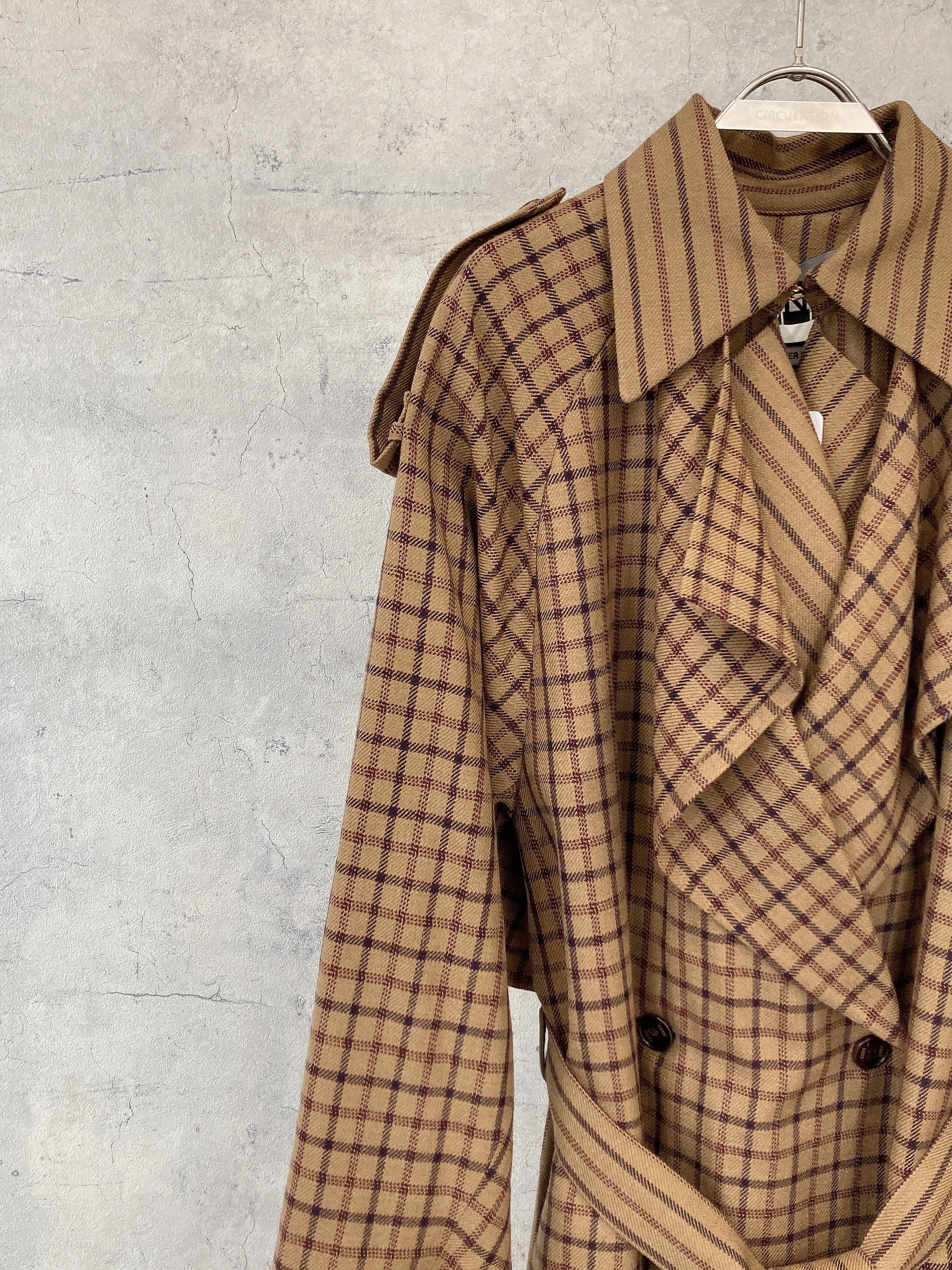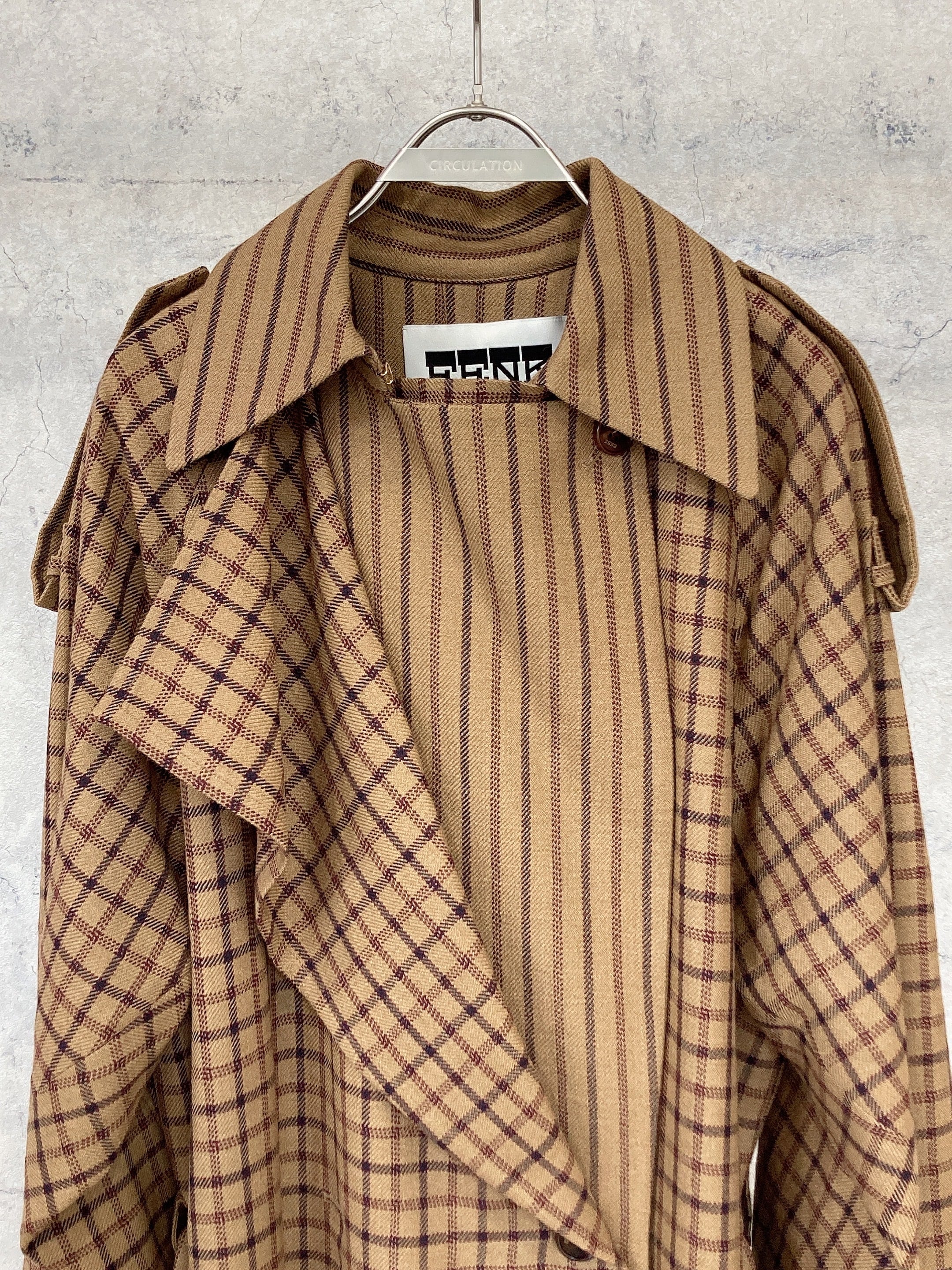 チェックとストライプの布地を匠なディテールでミックスしたトレンチコート。