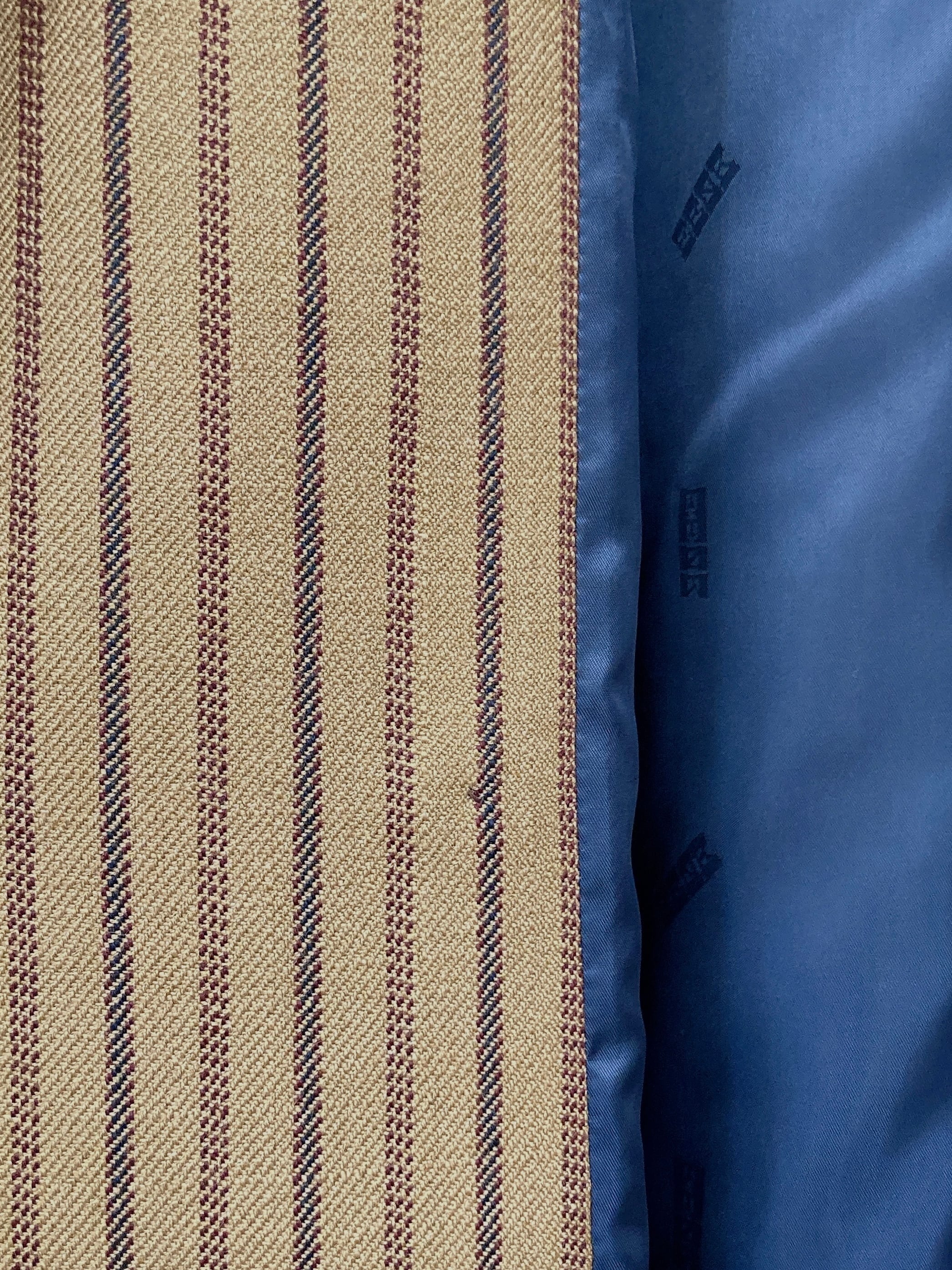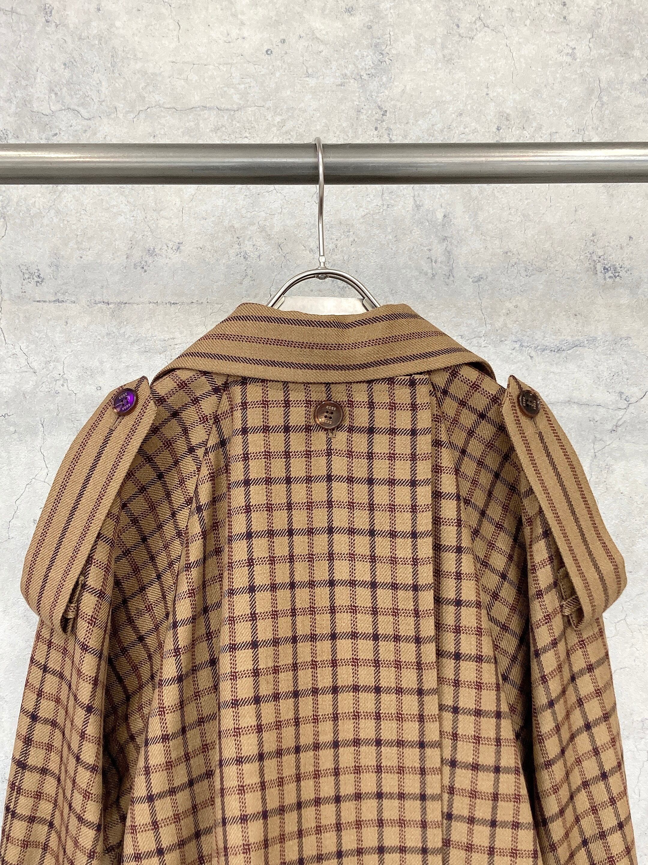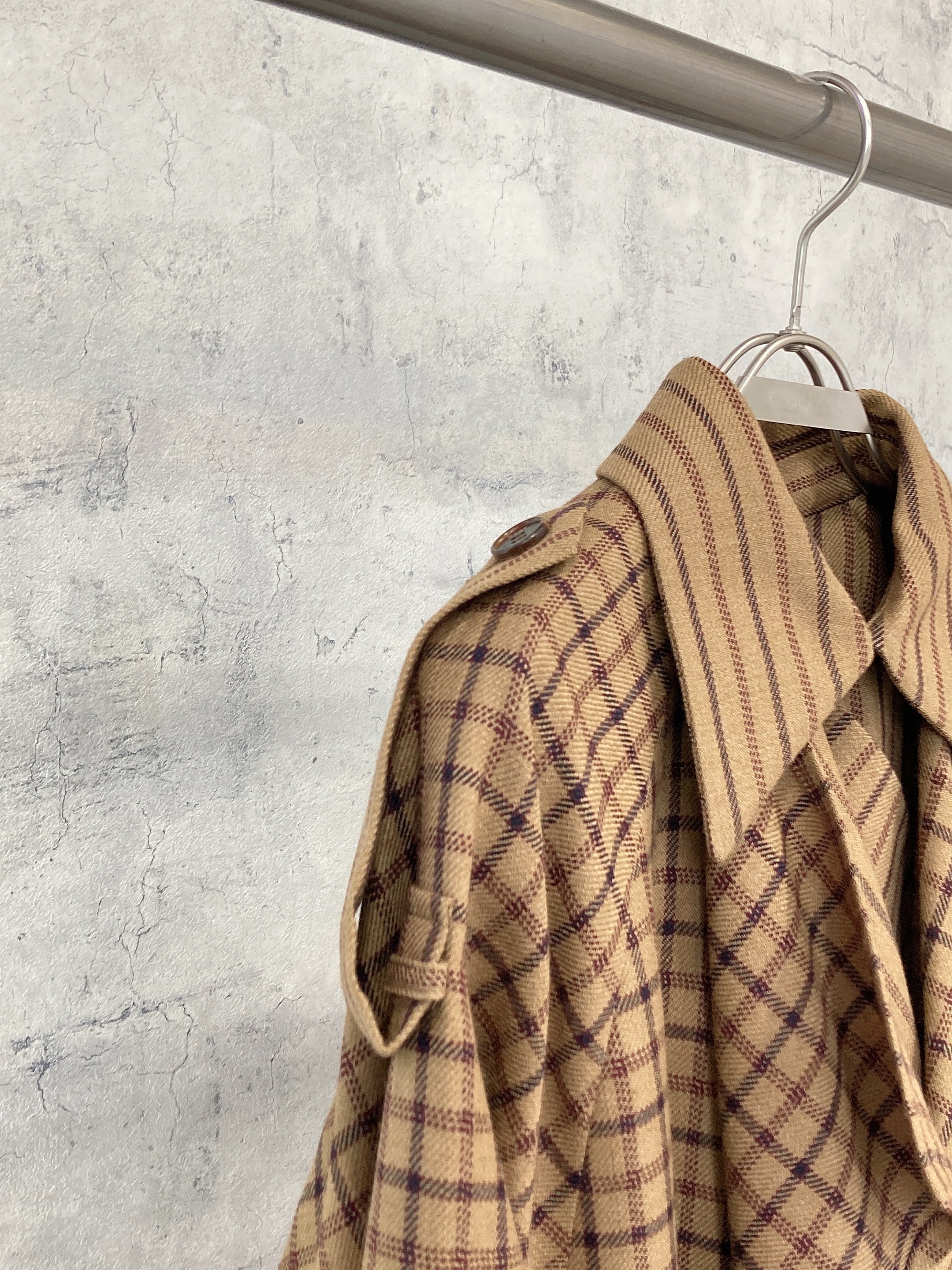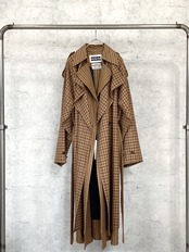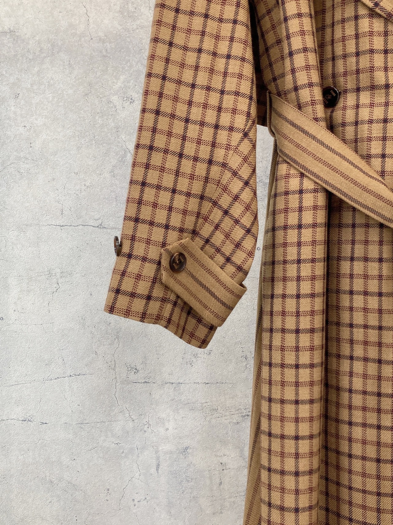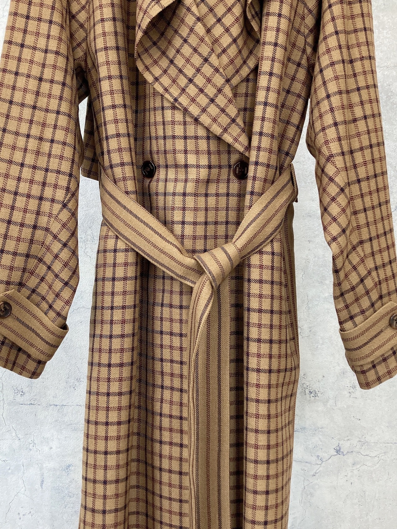 チェックとストライプの布地を匠なディテールでミックスしたトレンチコート。