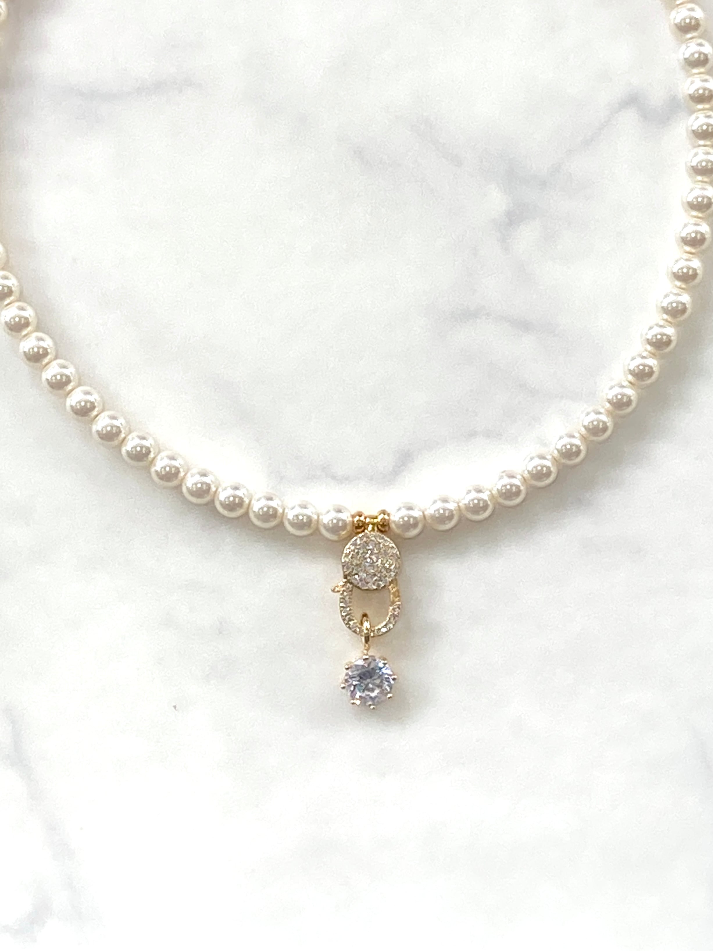 フックデザインに非常に綺麗なクリスタルチャームの付いたパールネックレスはトラデショナルになりがちなパールネックレスをフランスらしい遊びのあるデザインに。