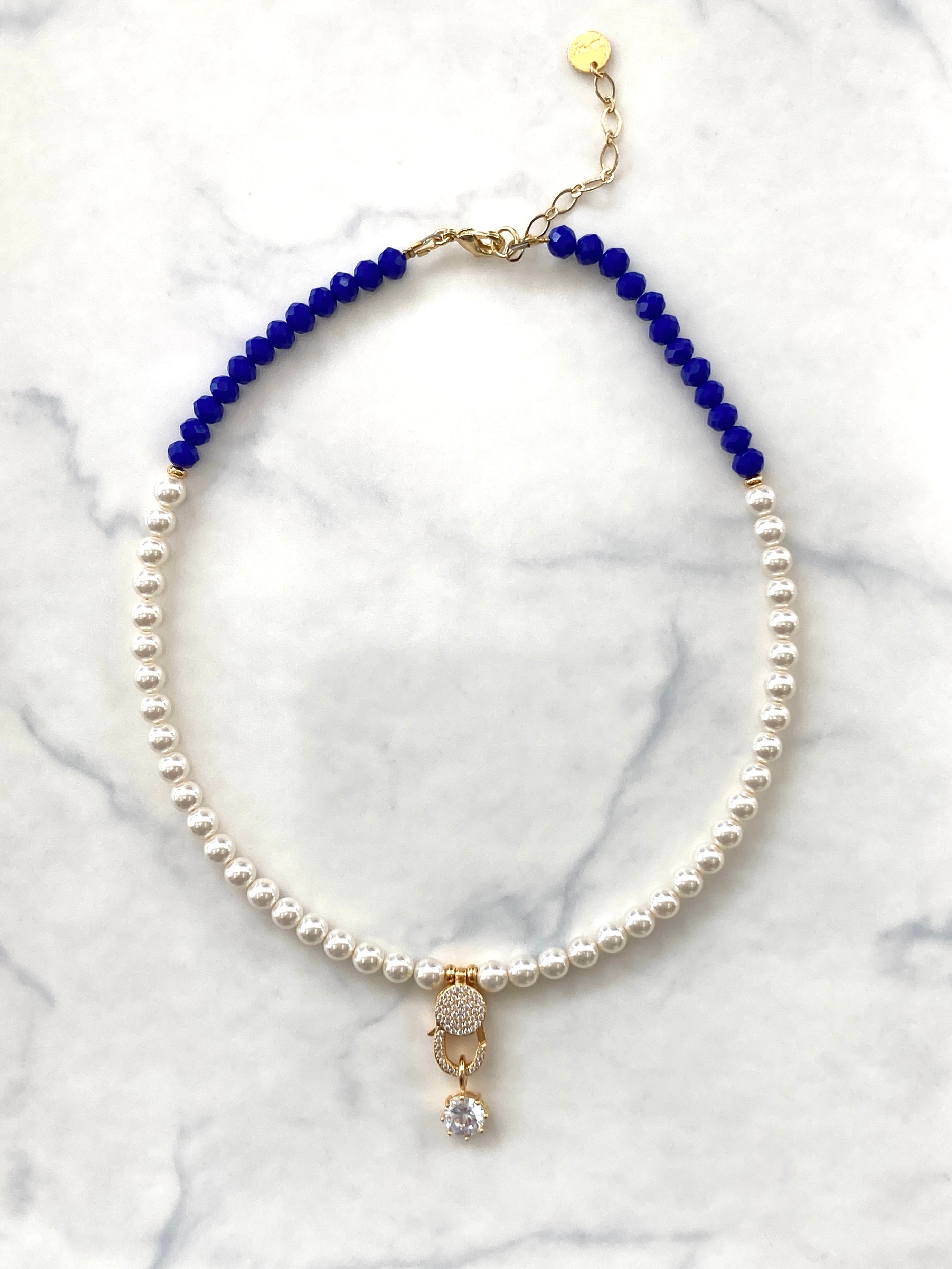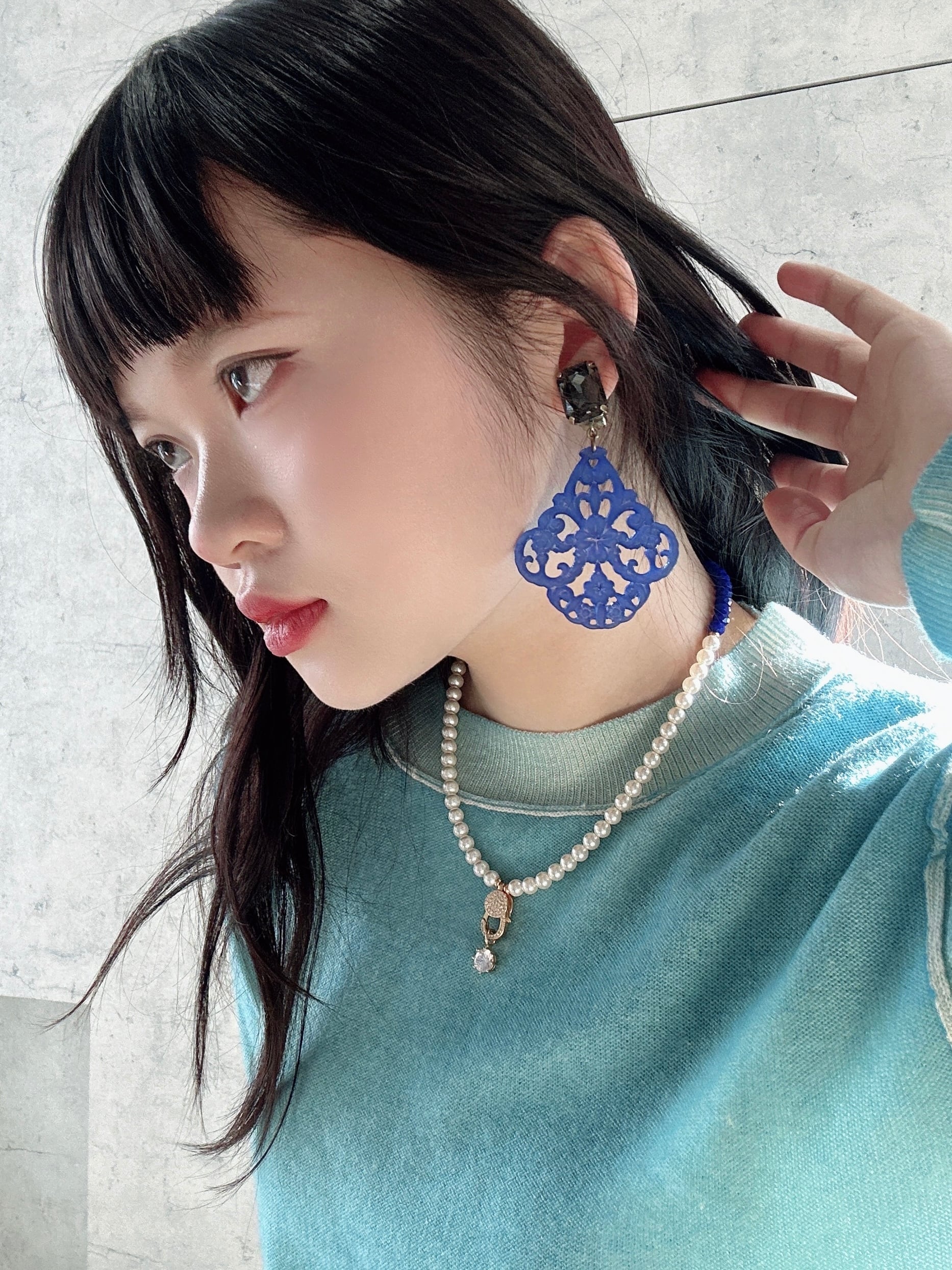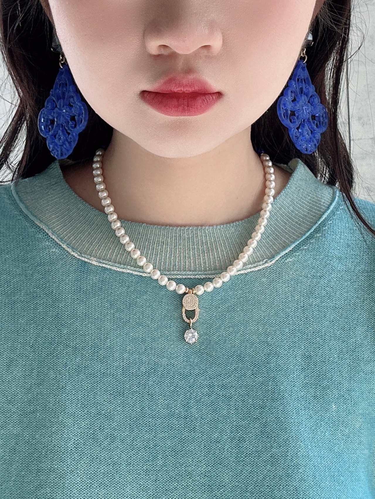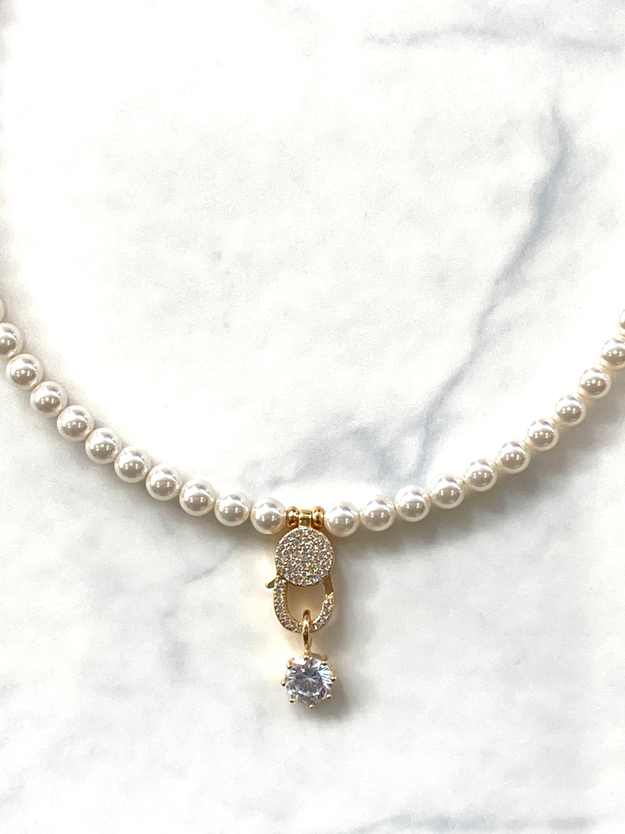 フックデザインに非常に綺麗なクリスタルチャームの付いたパールネックレスはトラデショナルになりがちなパールネックレスをフランスらしい遊びのあるデザインに。
