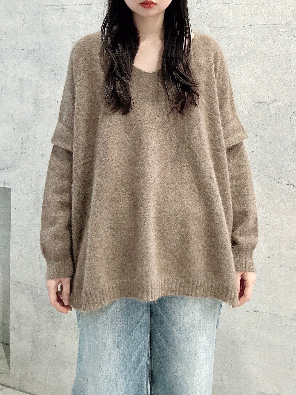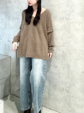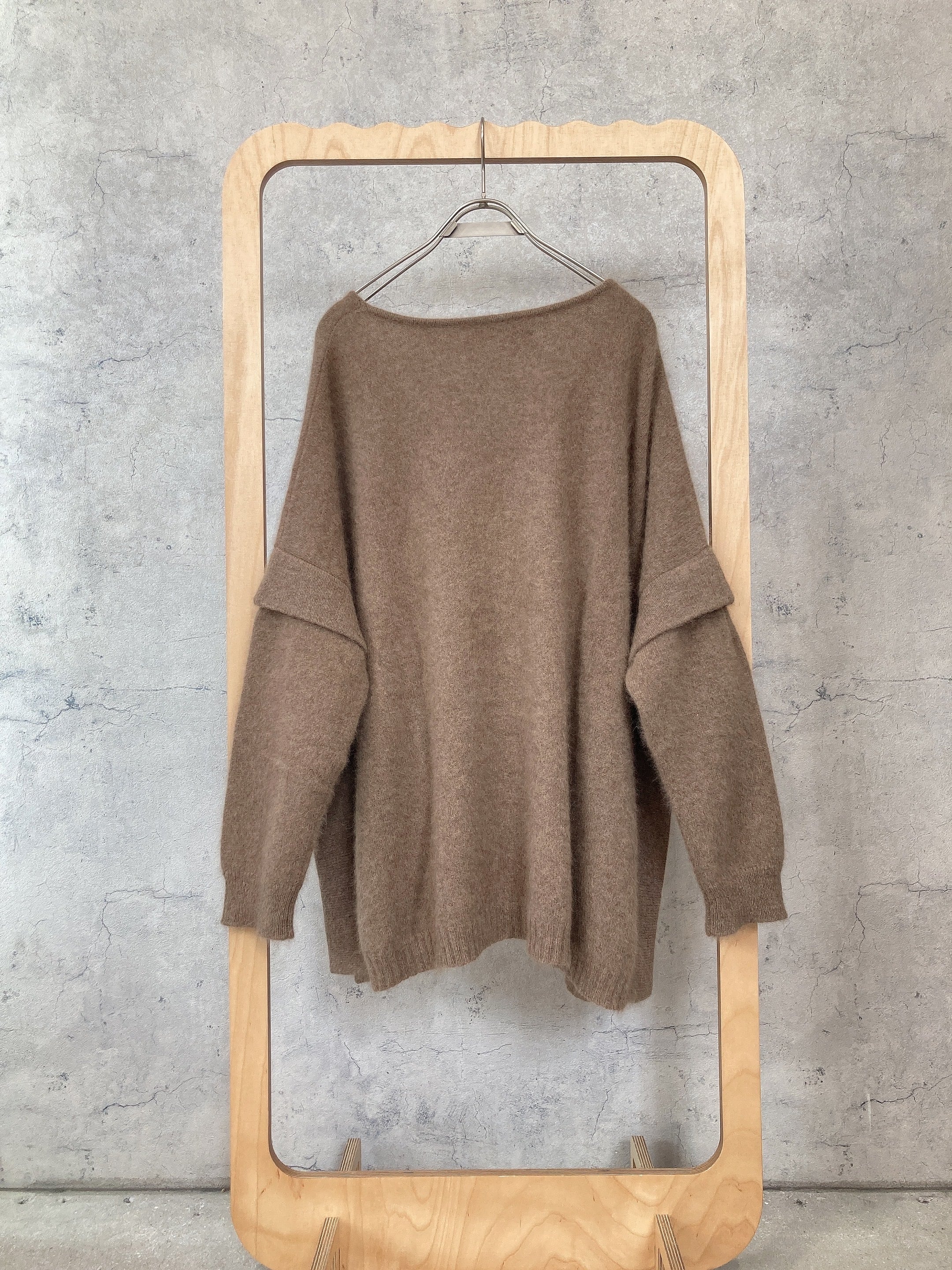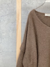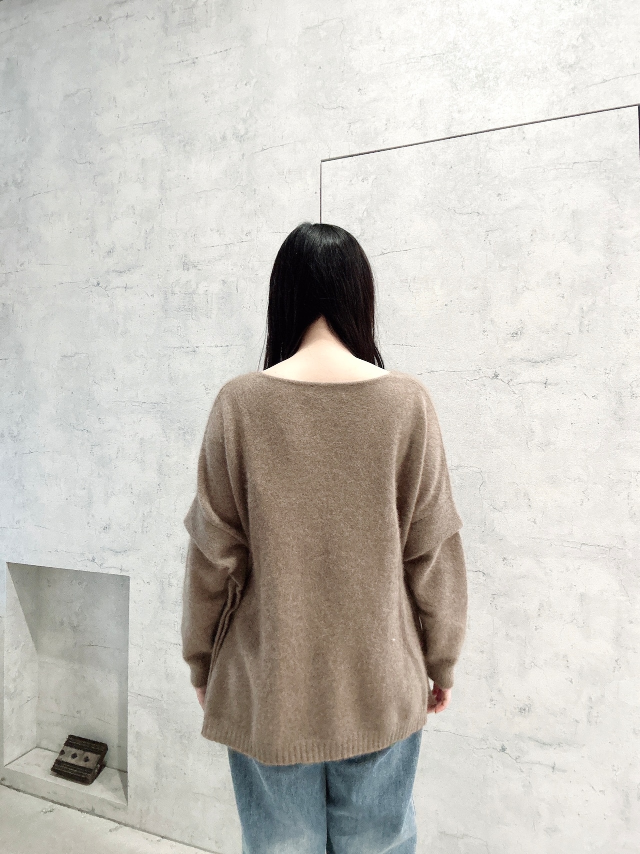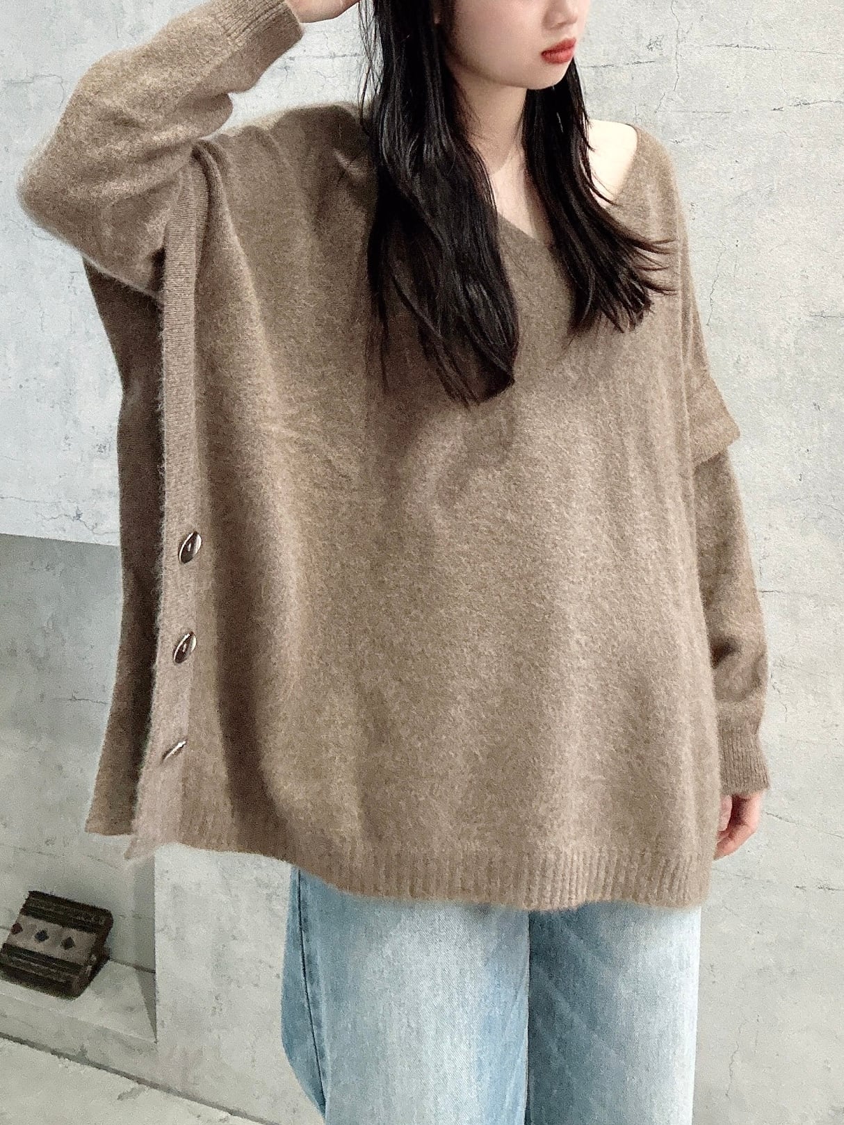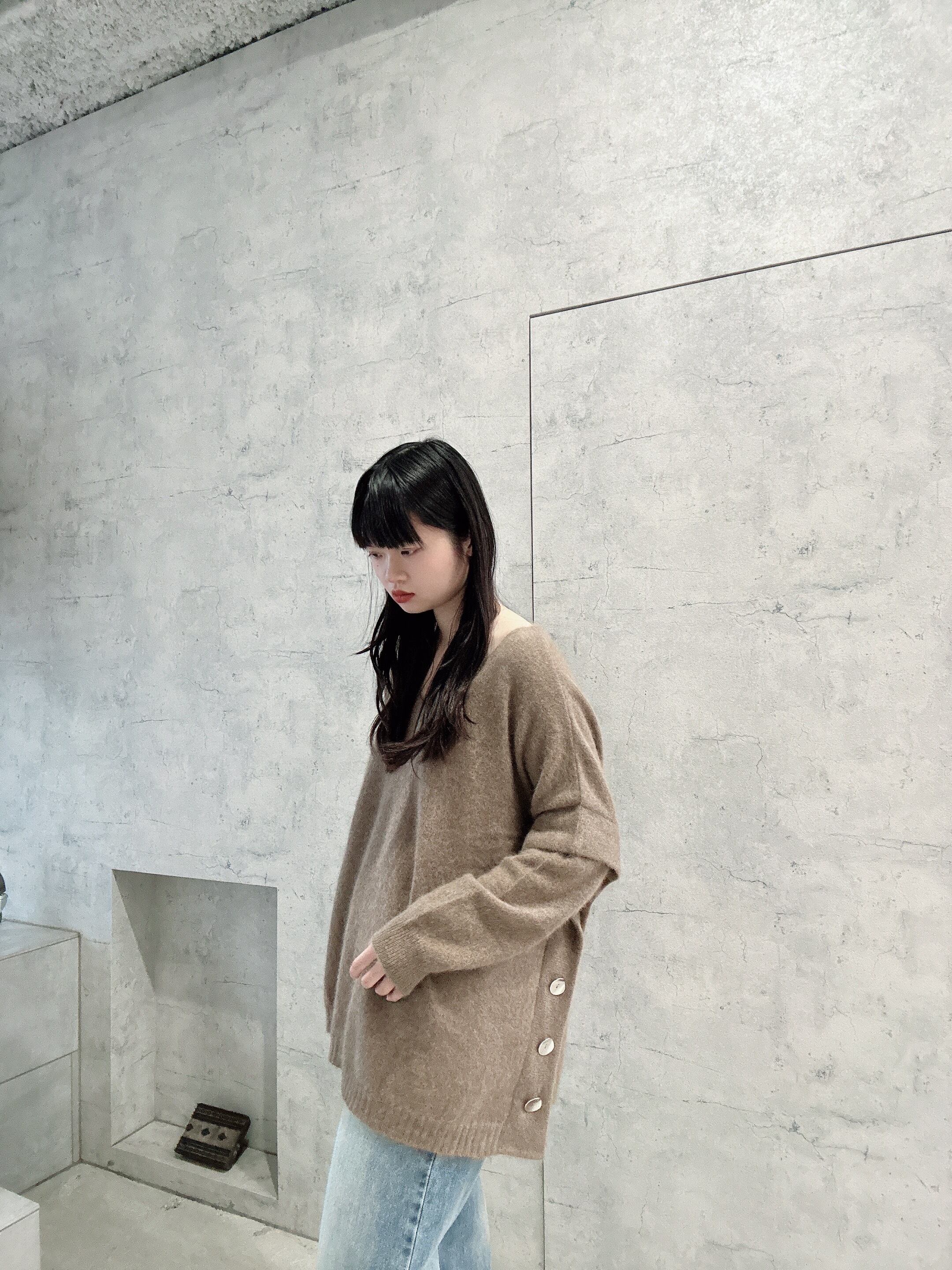 サイドにはビンテージテイストに過去したマットでいびつなシルバーボタンがついておりフォルムも動くたびに表情のあるニットはカジュアルなデニムスタイルもサマになります。
