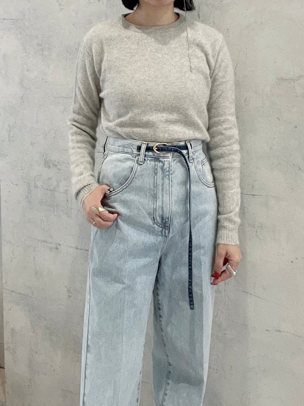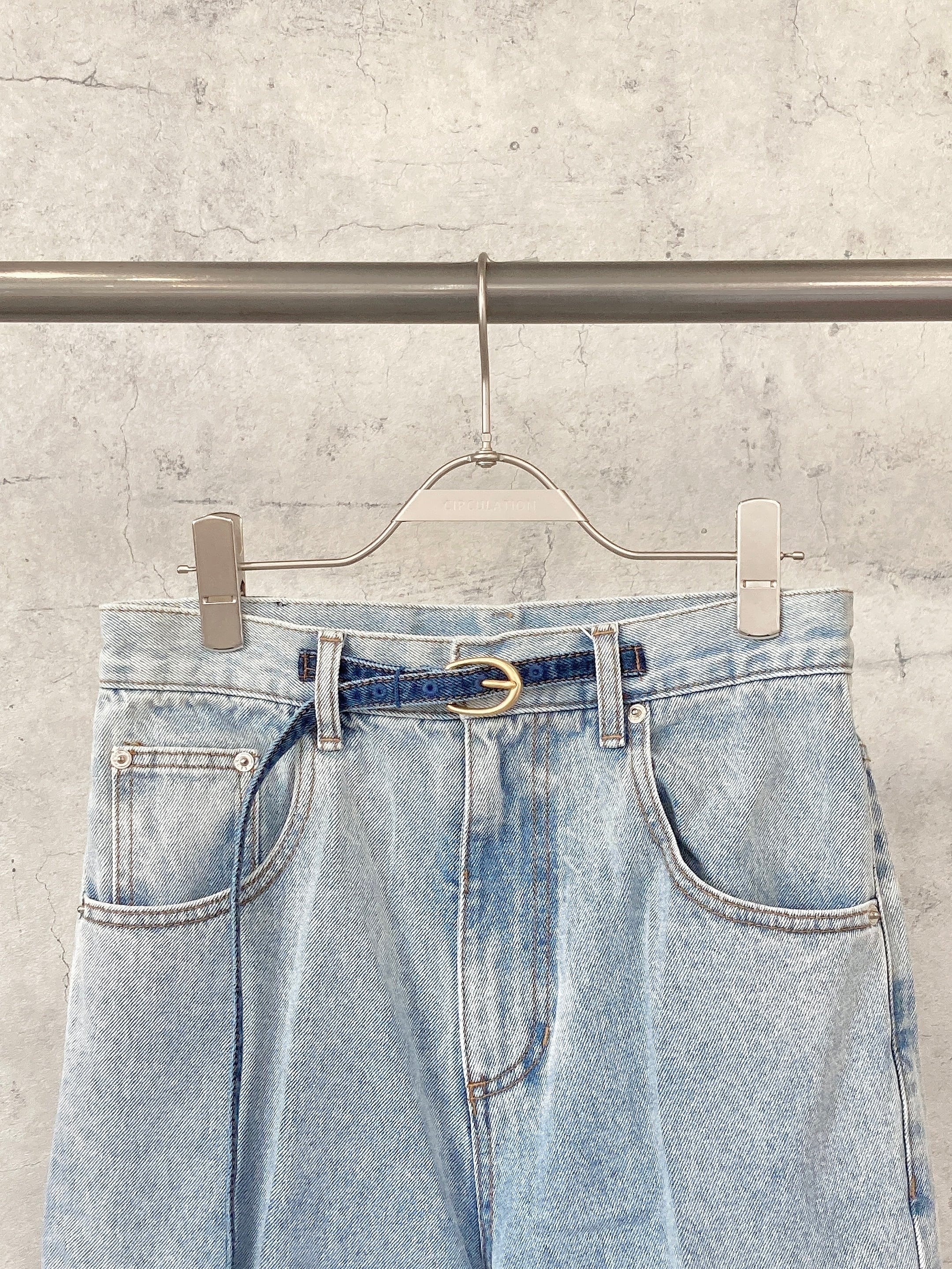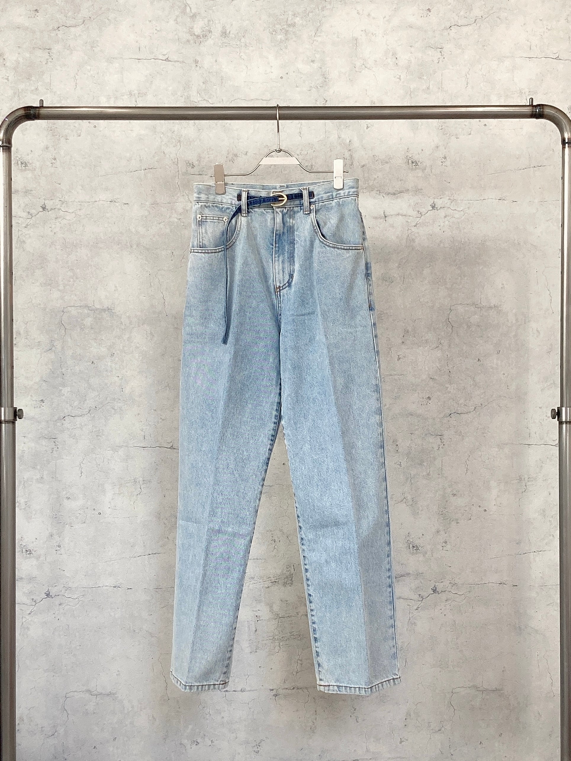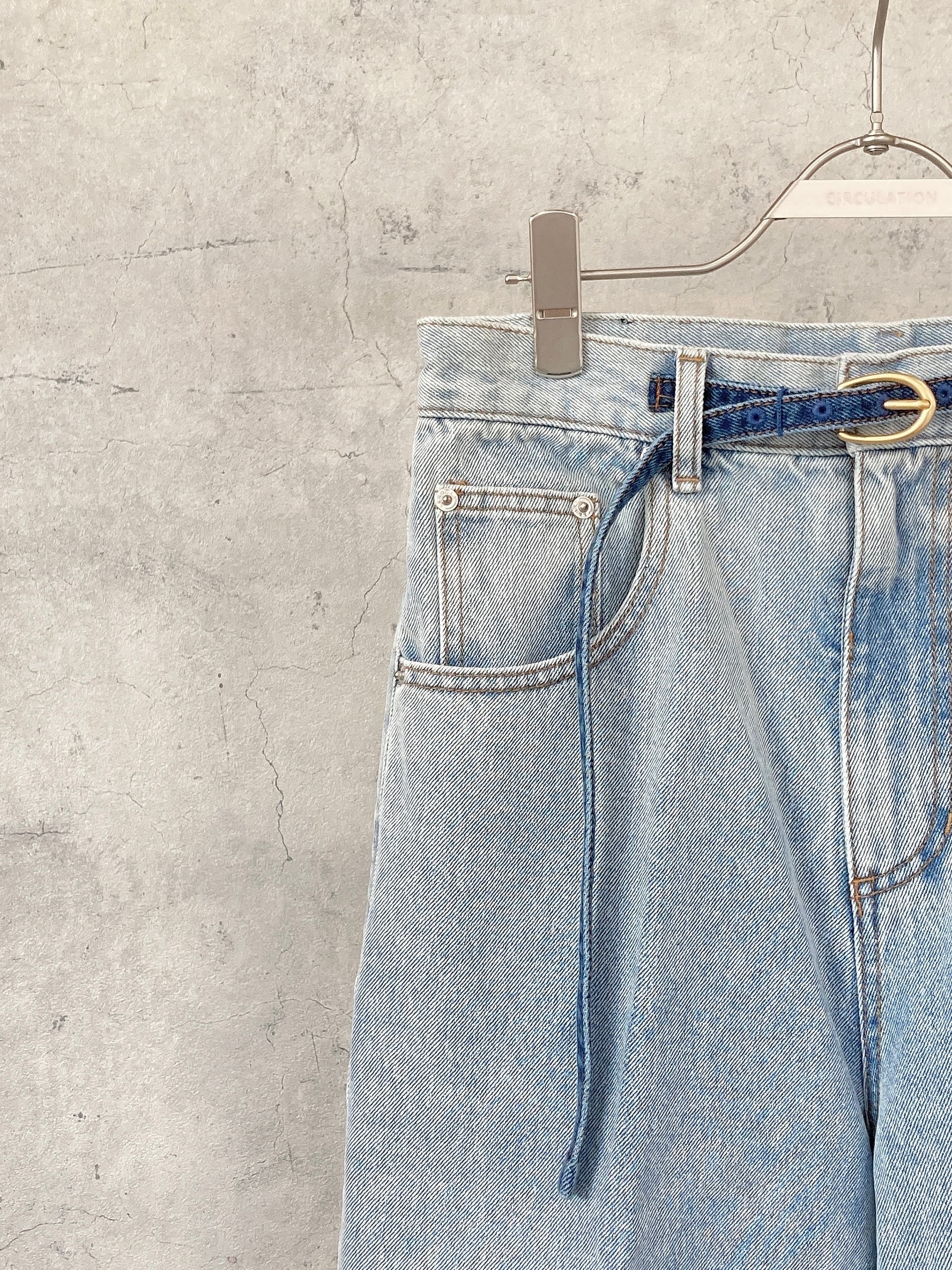 ウエストベルトがポイントのウォッシュデニム。 ハイウエストでウエストからヒップラインにかけてシルエットが非常に綺麗なデニムです。
