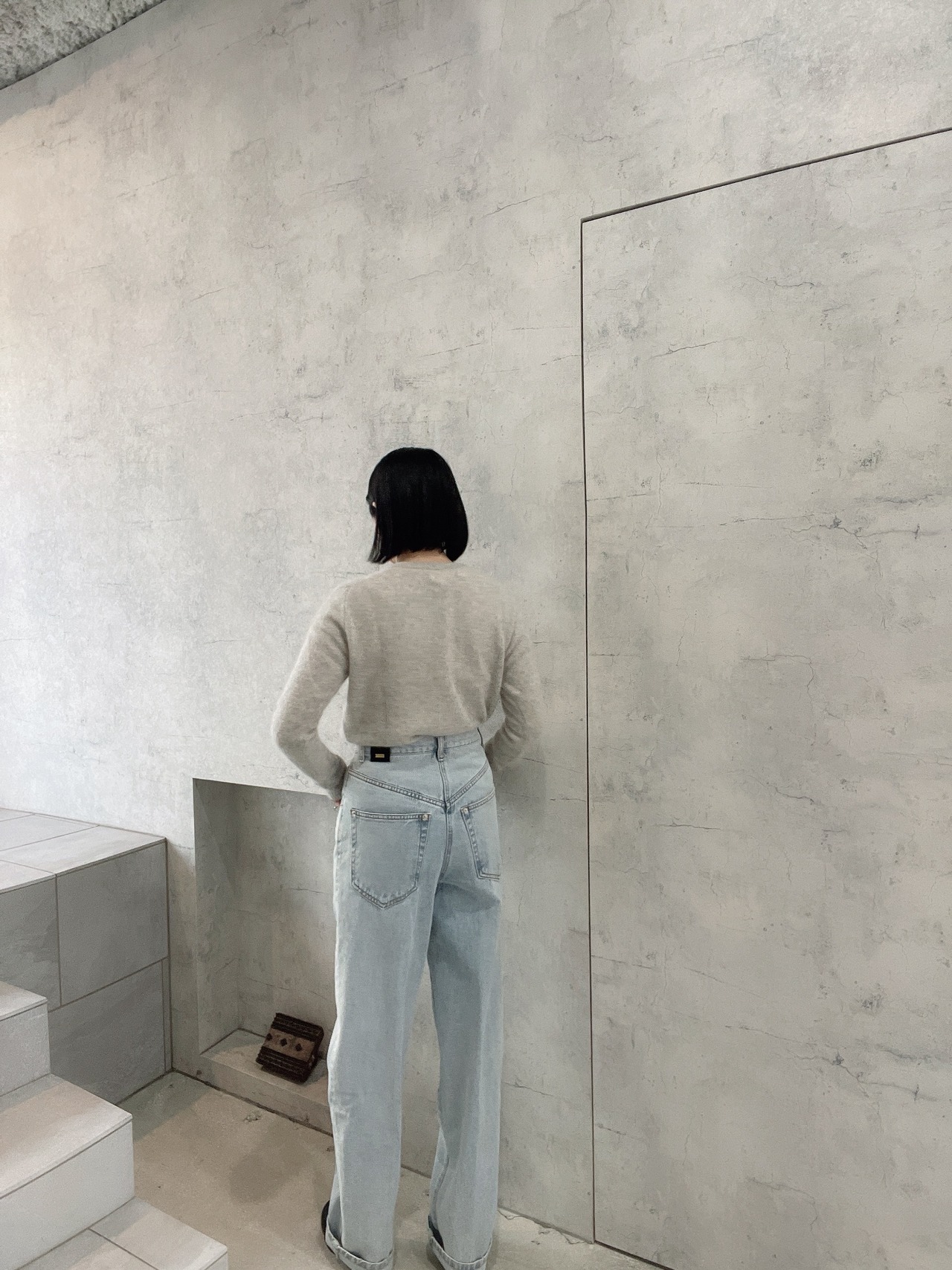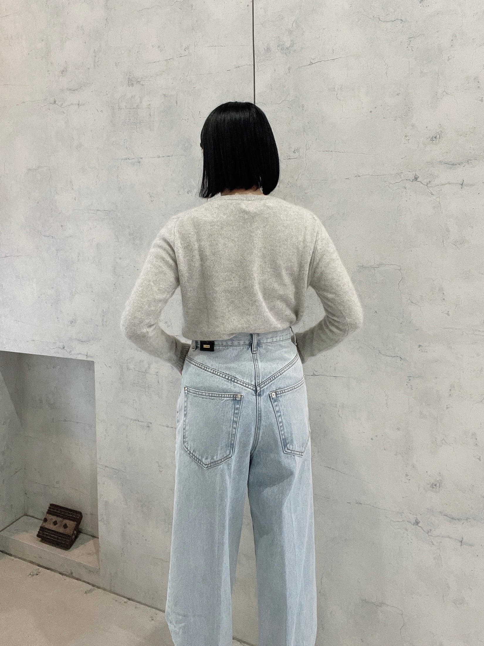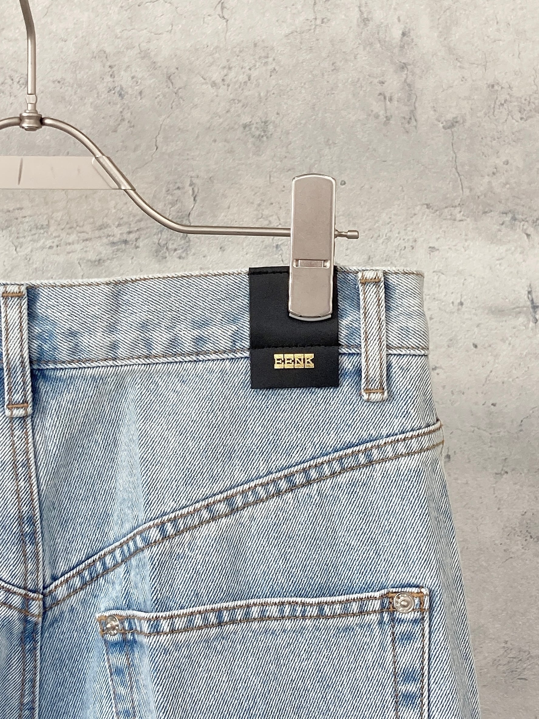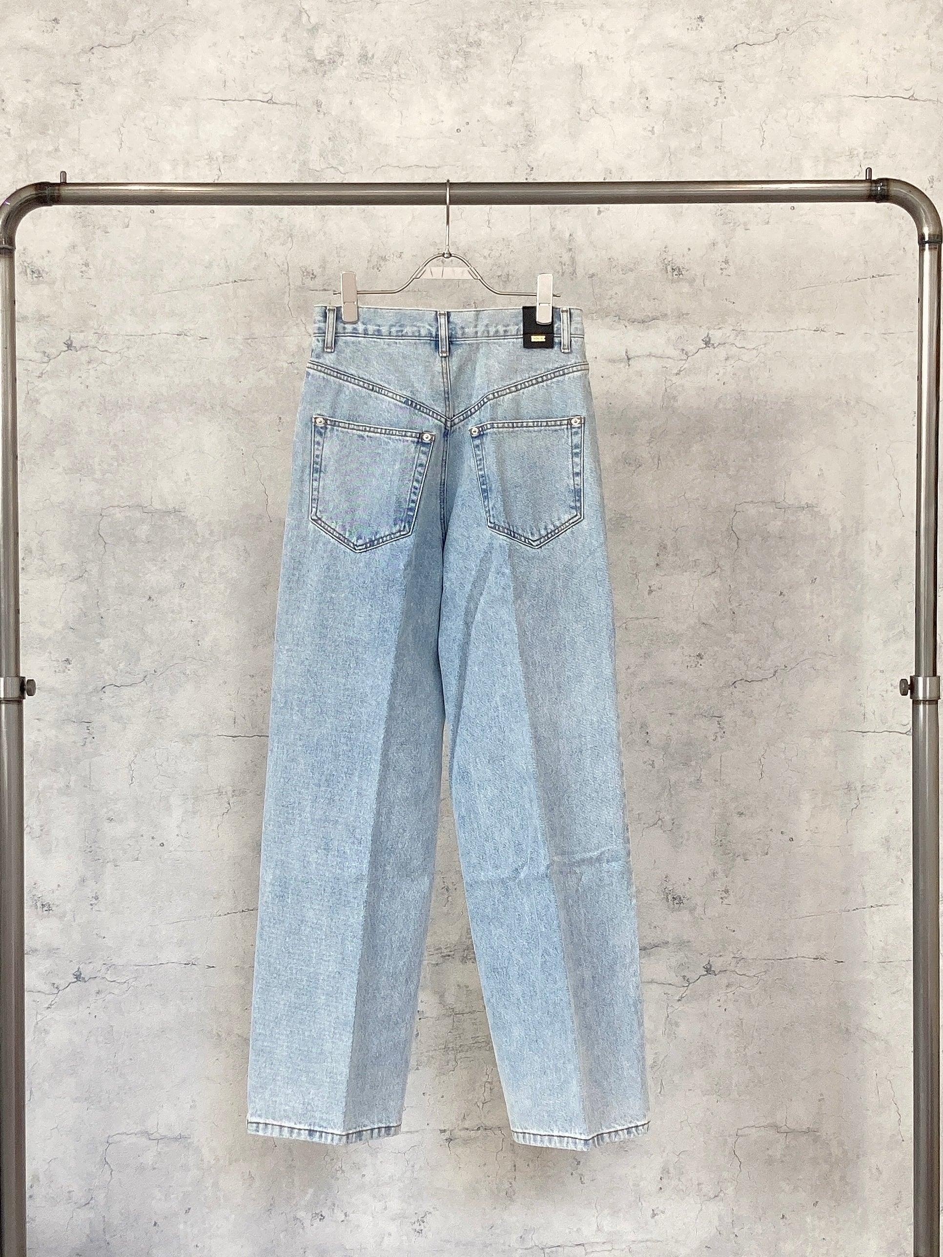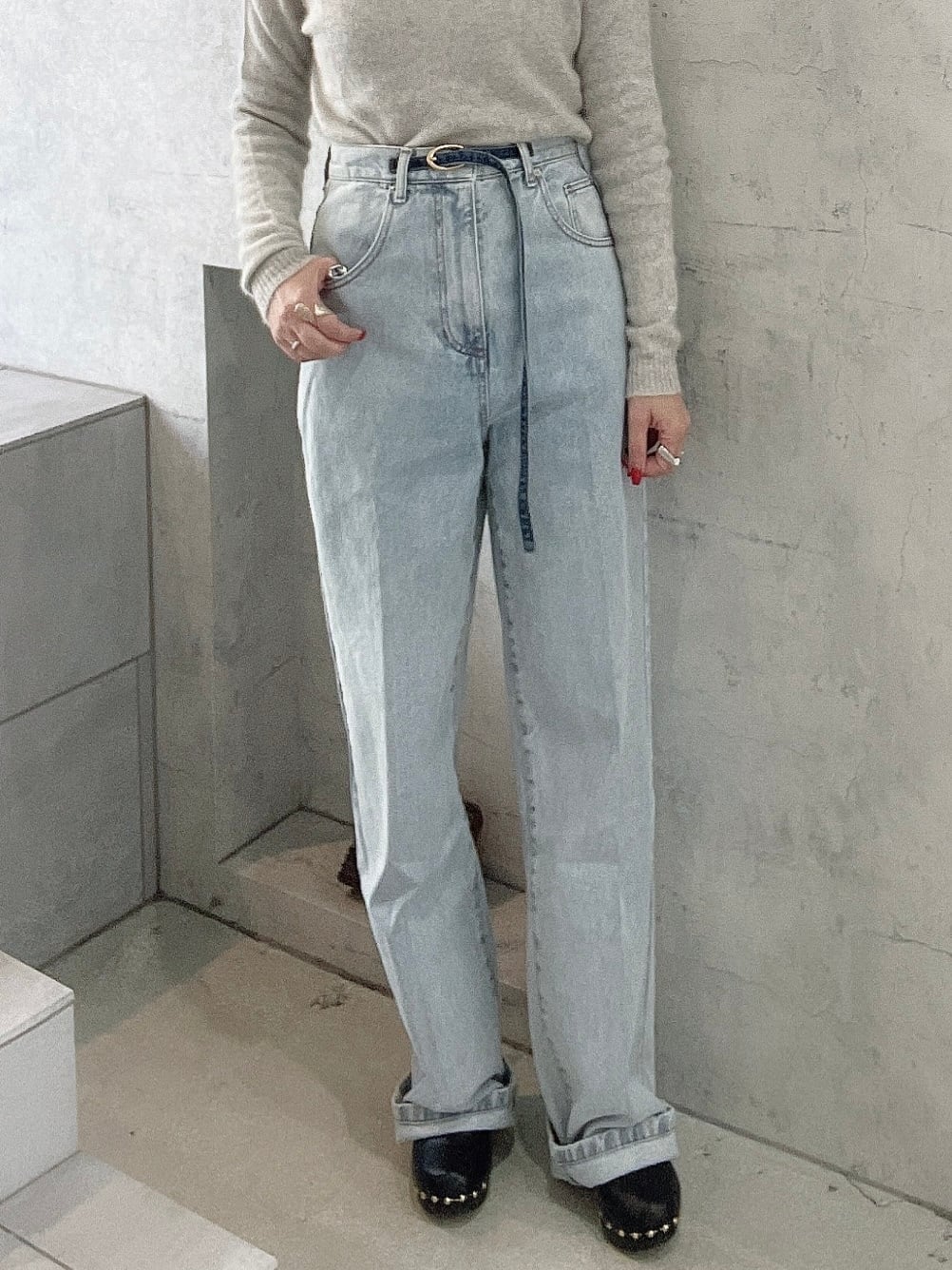 ウエストベルトがポイントのウォッシュデニム。 ハイウエストでウエストからヒップラインにかけてシルエットが非常に綺麗なデニムです。