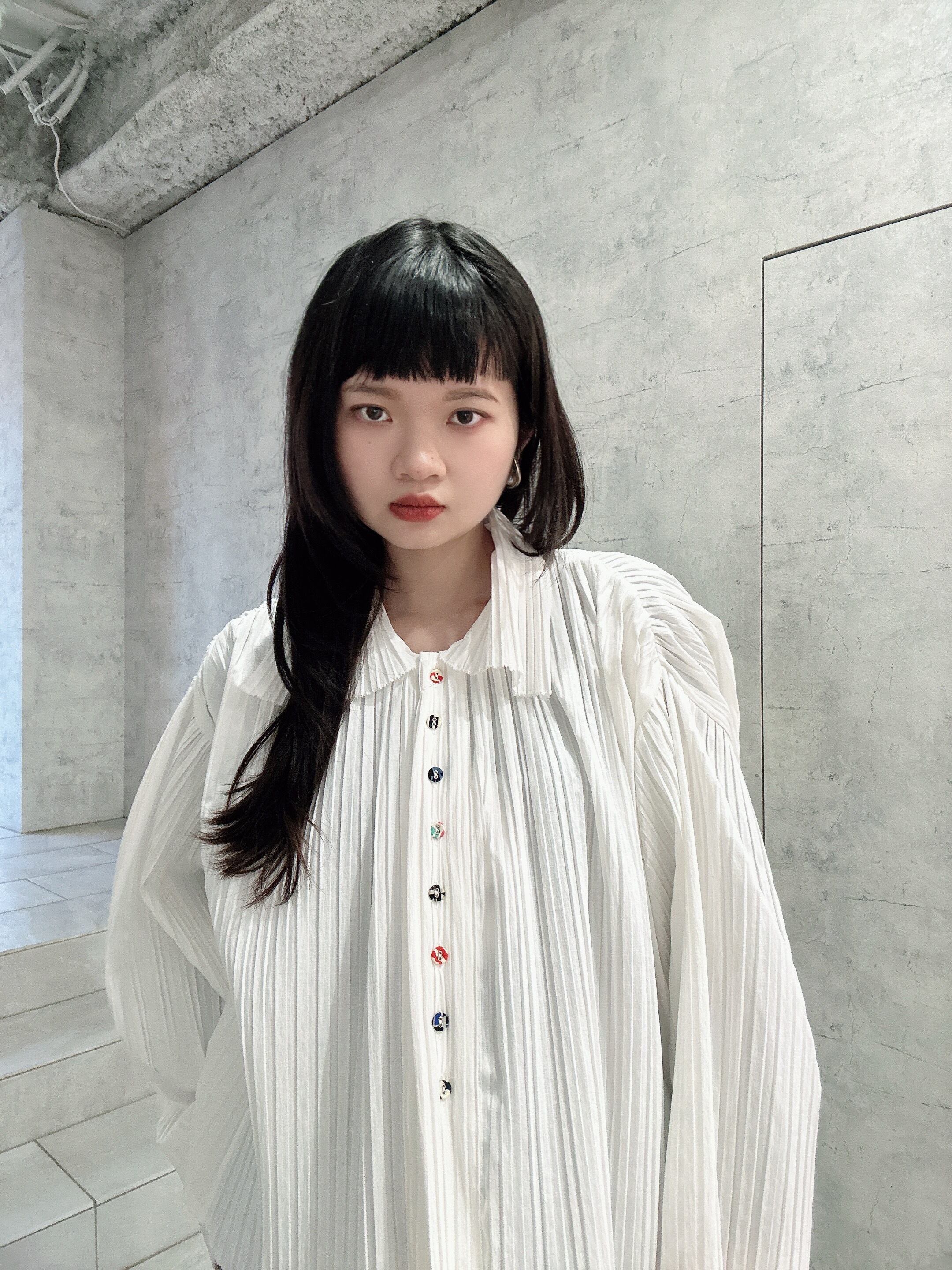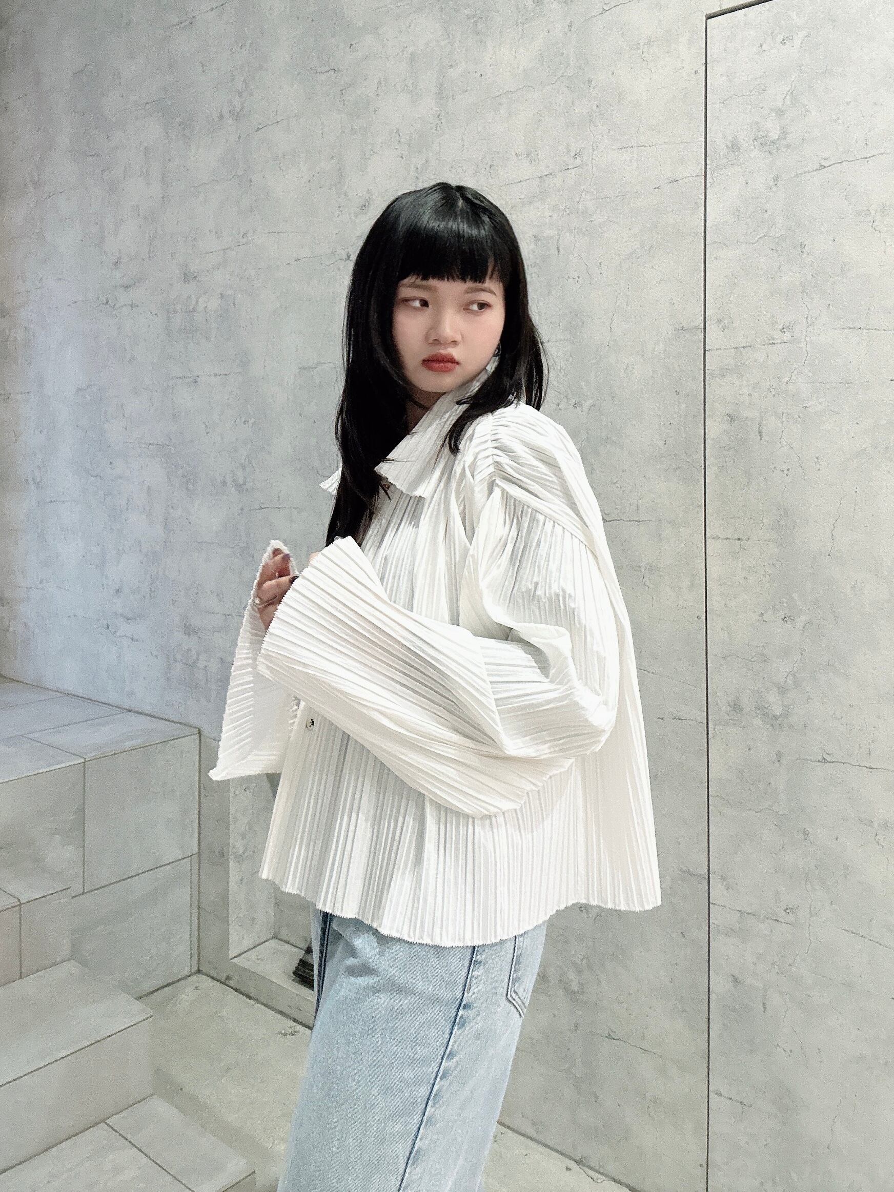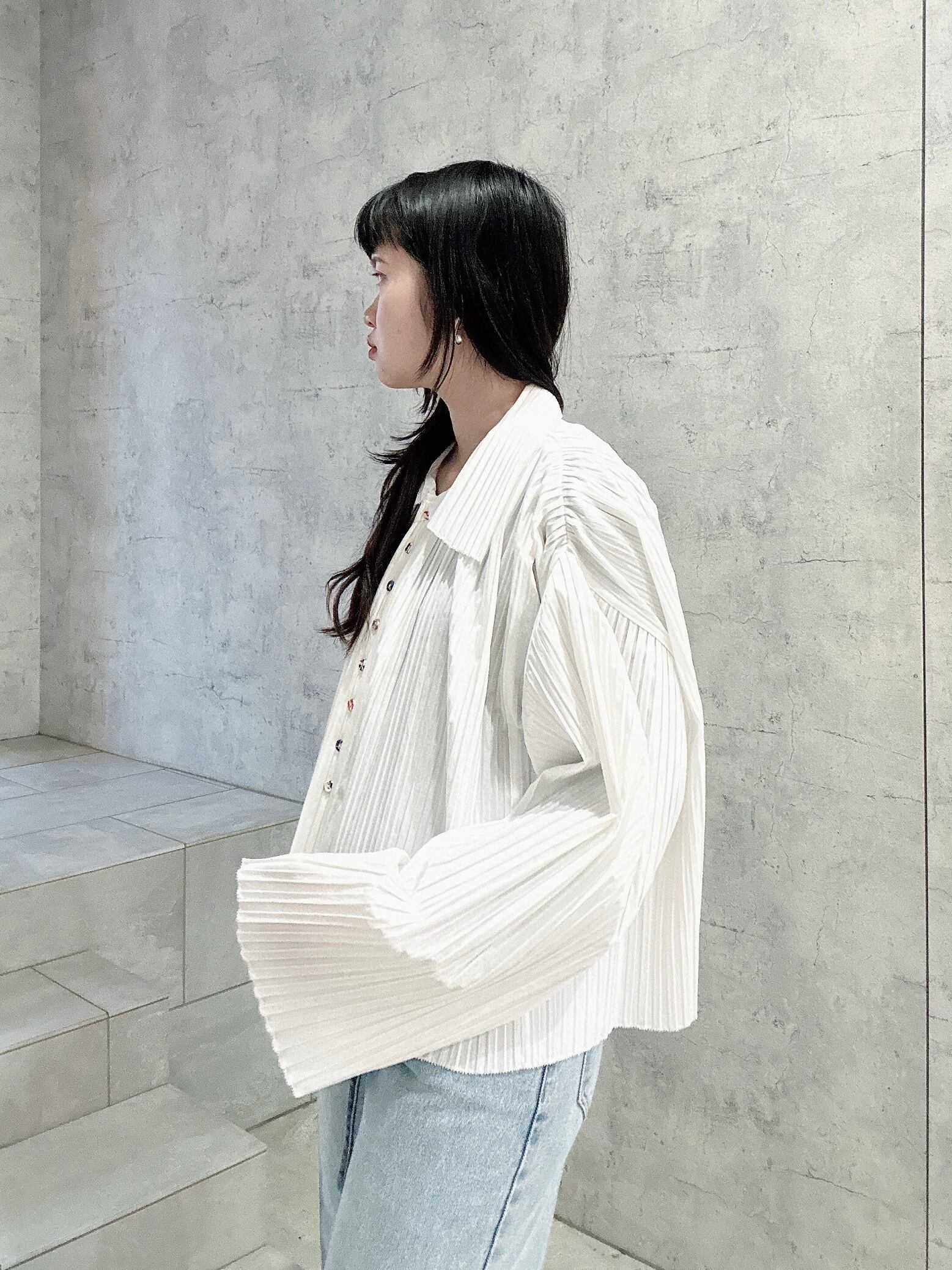 ギャザープリーツ素材を使用し、様々なクルミボタンをつけたシャツスタイルでも差のつく、Showでも注目された1点です。