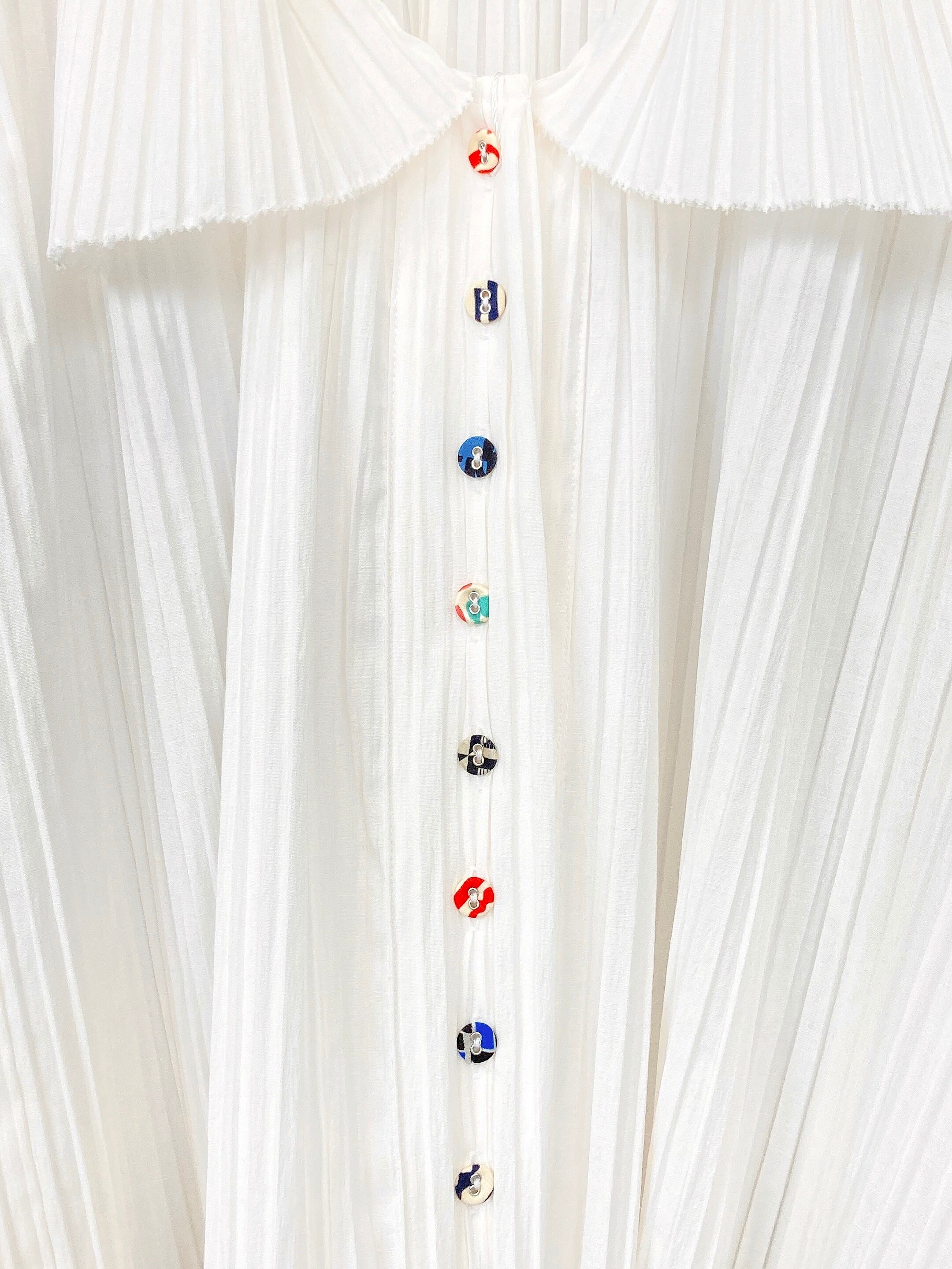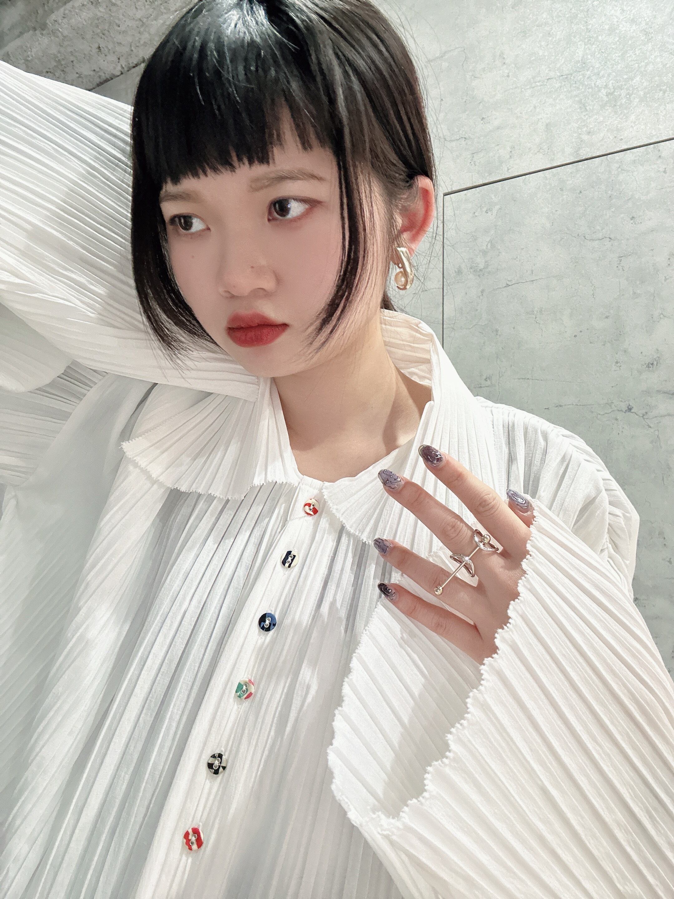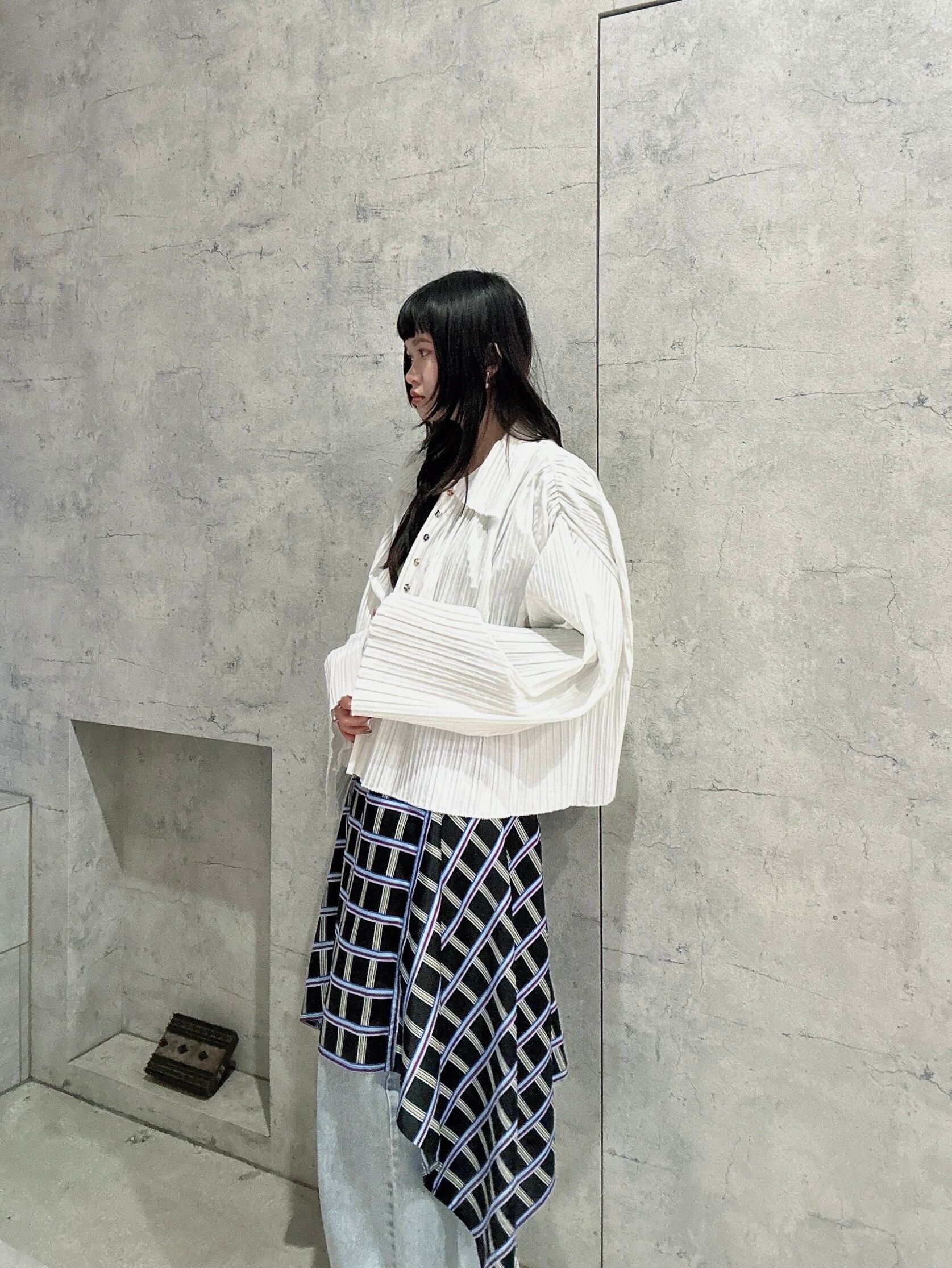 ギャザープリーツ素材を使用し、様々なクルミボタンをつけたシャツスタイルでも差のつく、Showでも注目された1点です。