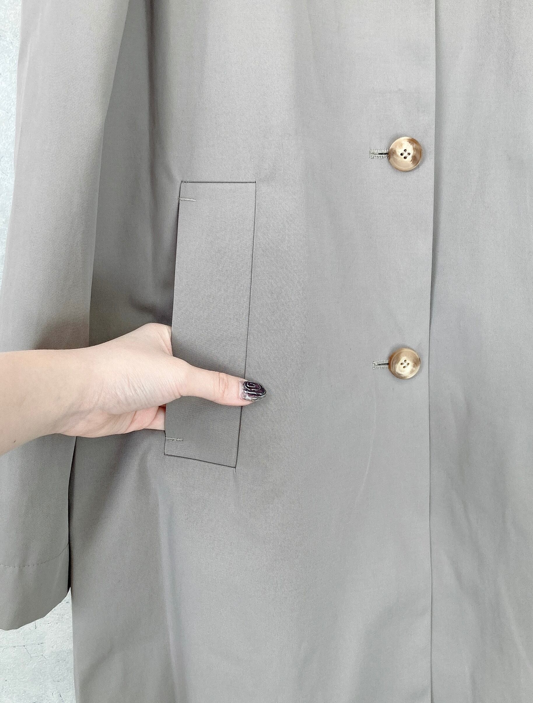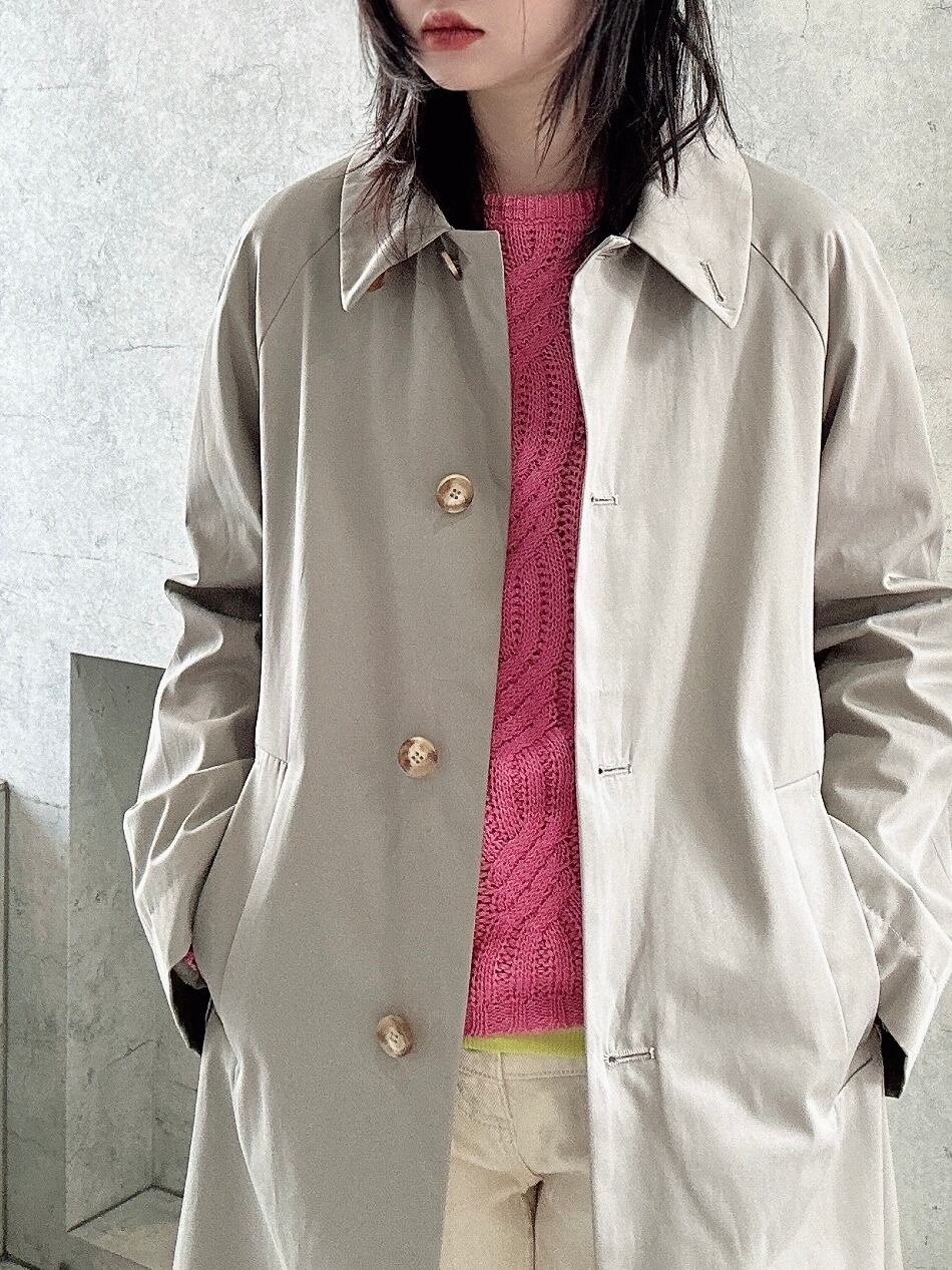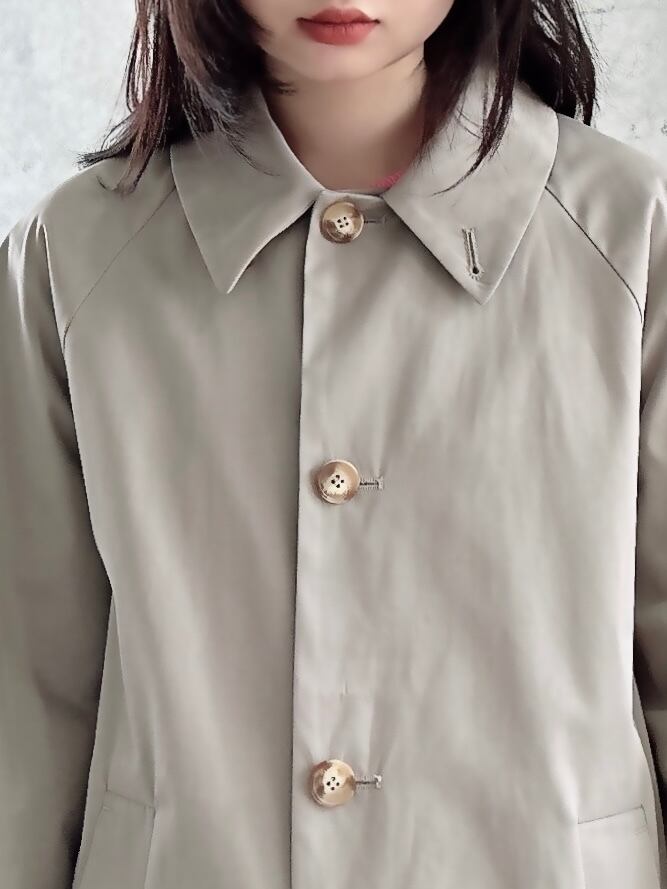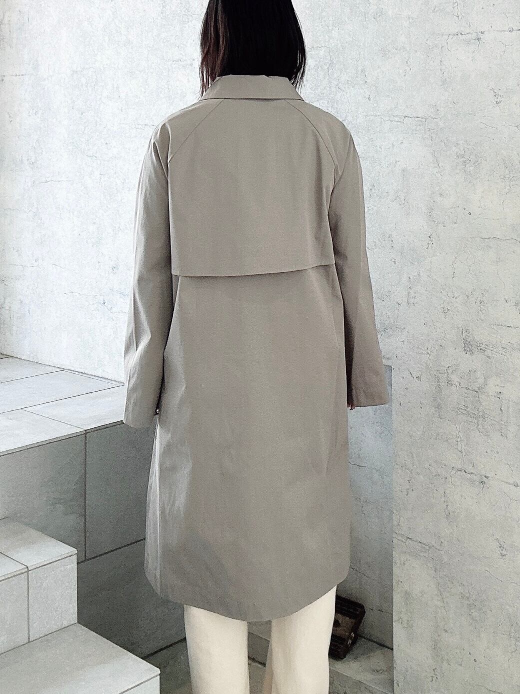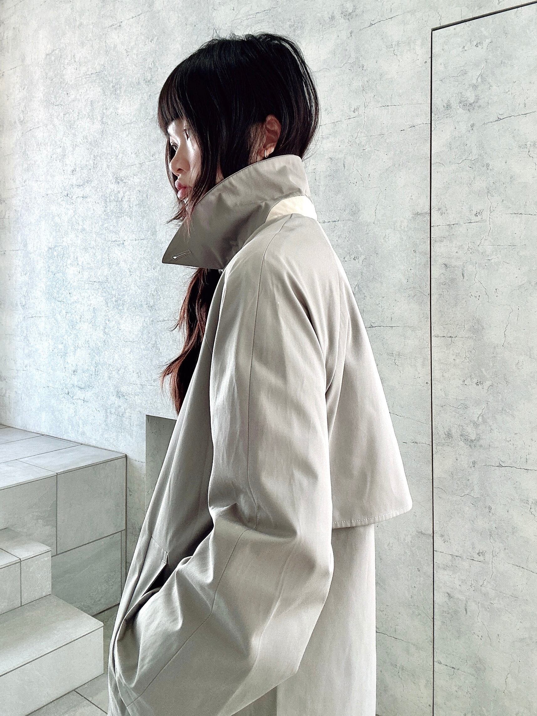 シンプルでありながら台襟のカラーを変えたり、袖の裏地はドット地にしたりと一工程一工程手間をかけられたスプリングコート。襟の裏地にボタンがありスタンドカラーに出来たりと様々な表情で着用出来るようデザインされている、フランスらしいグレージュのスプリングコート。