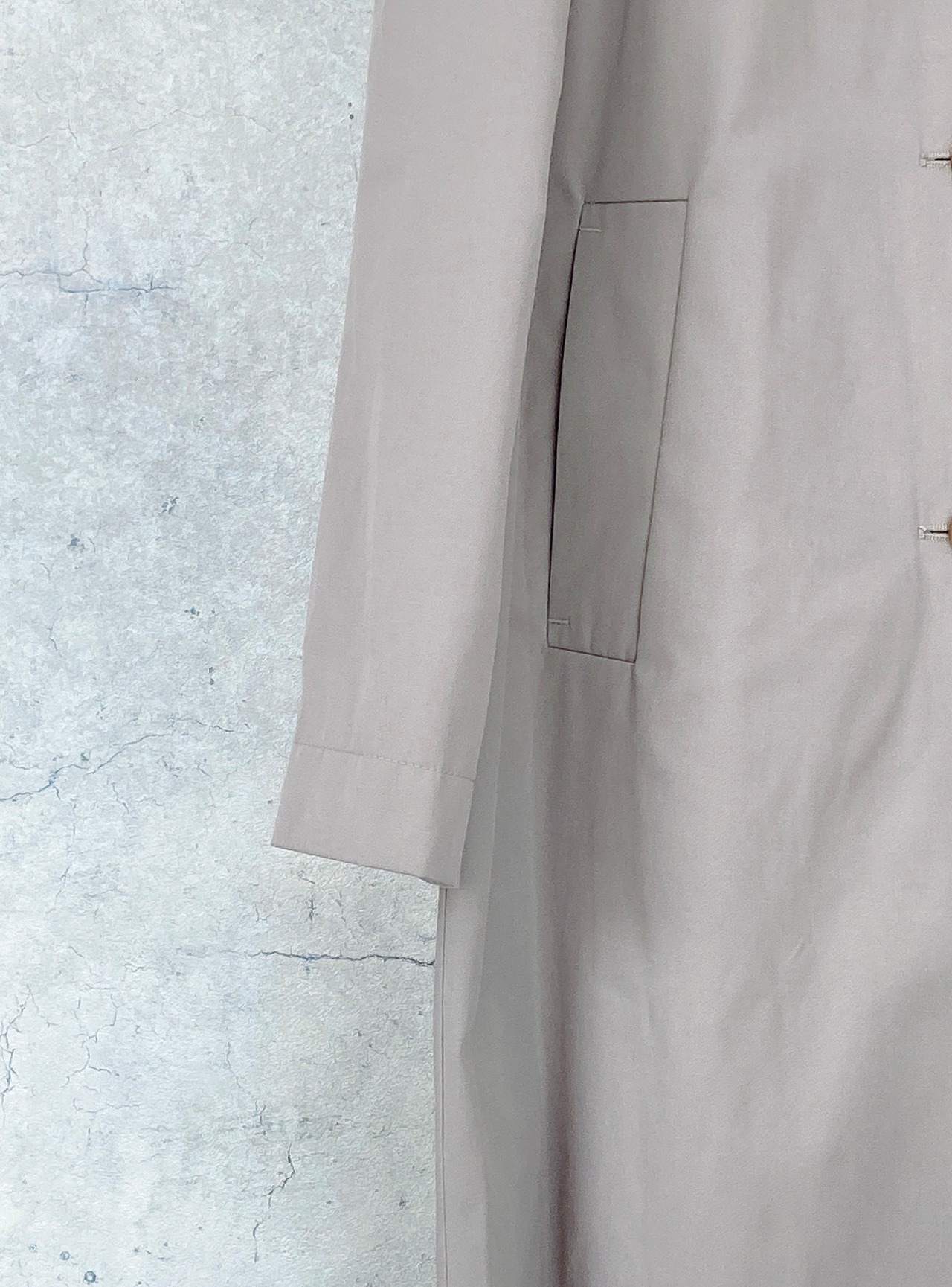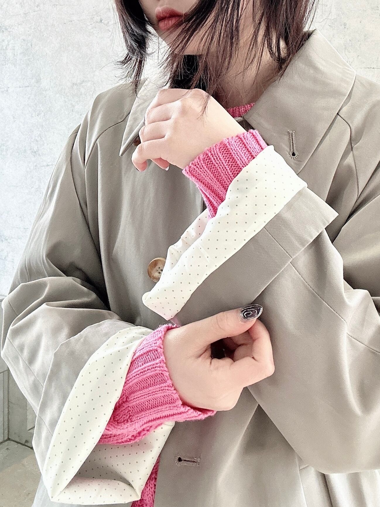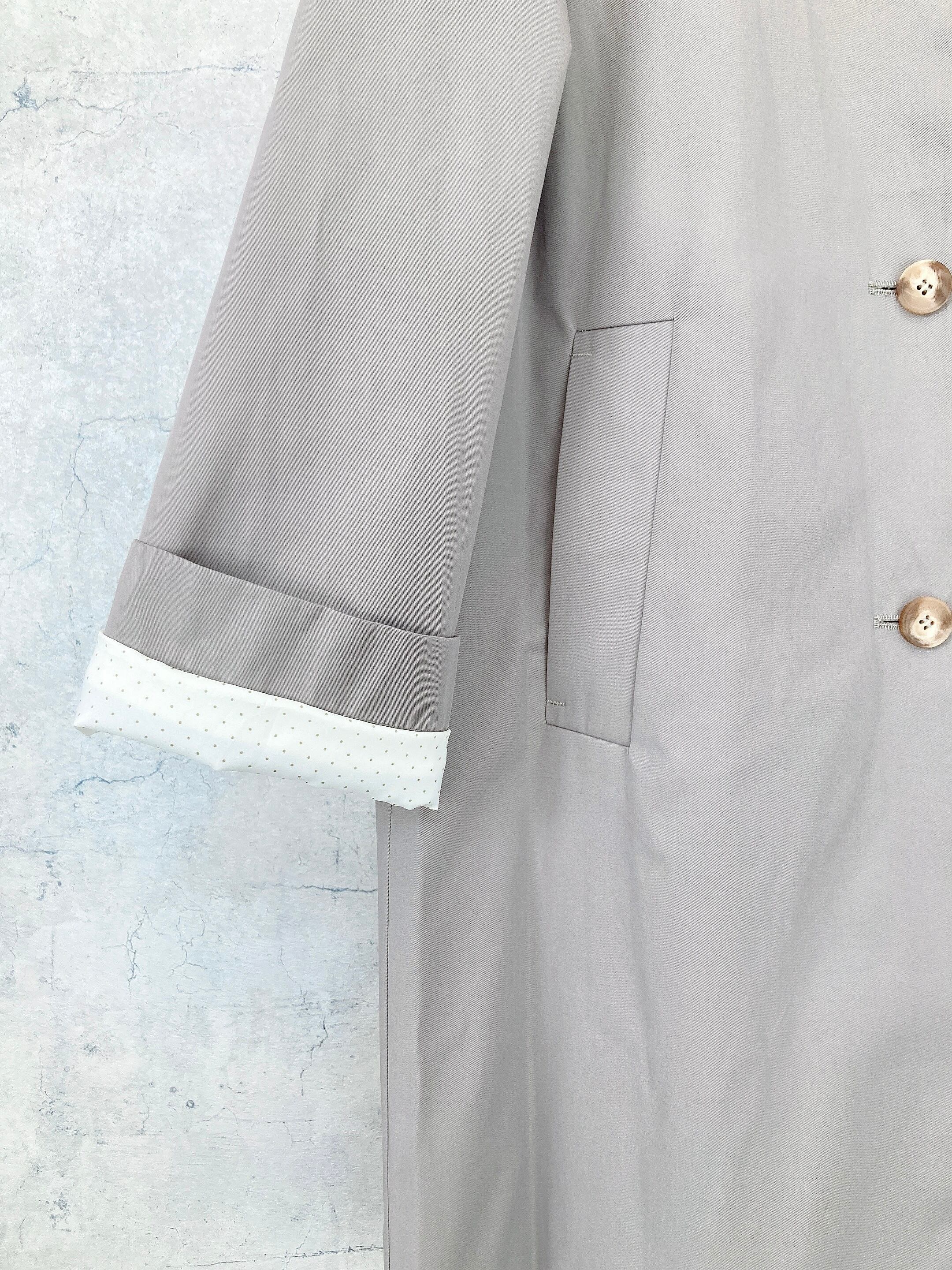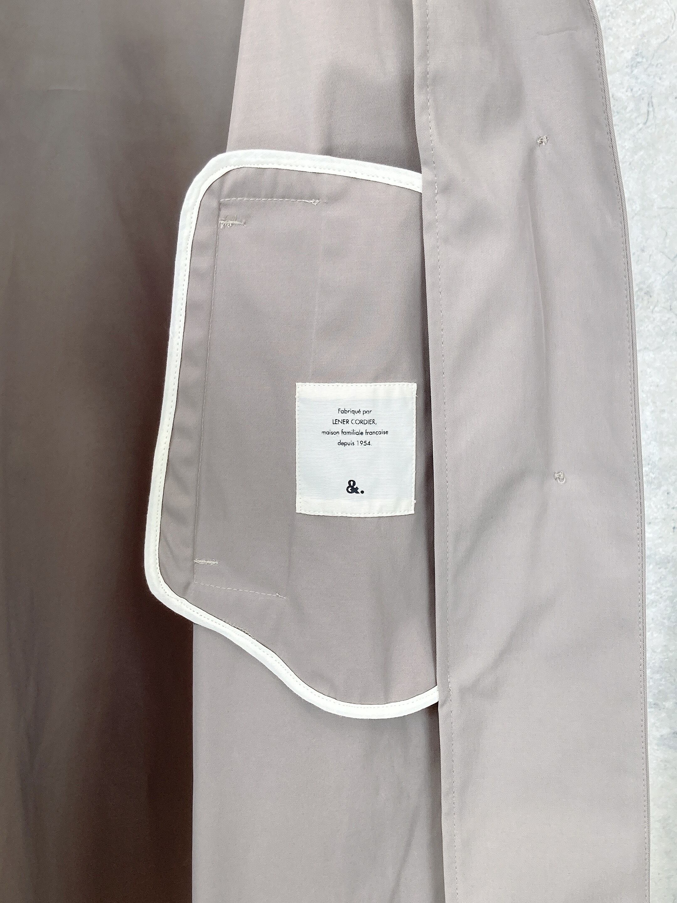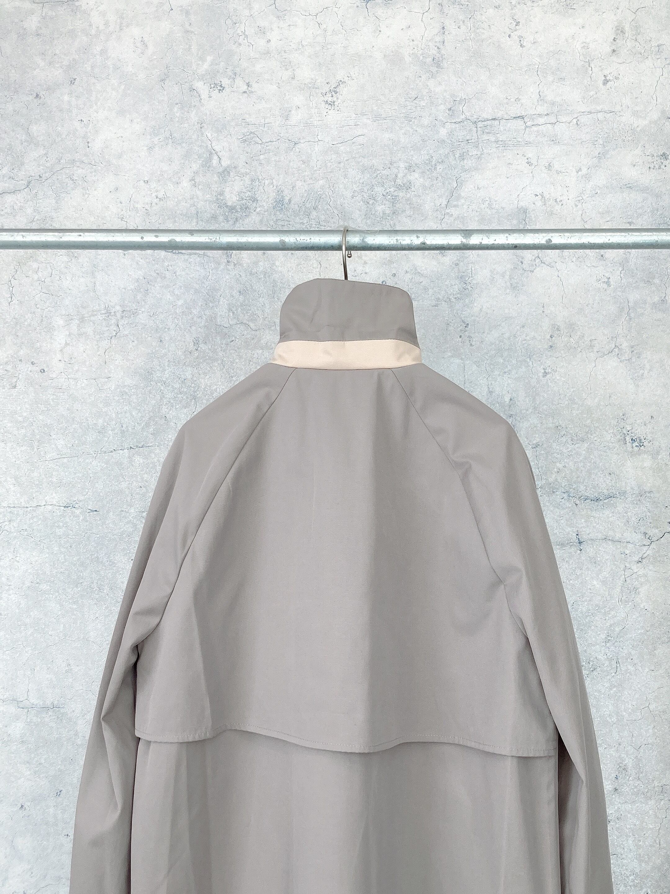 シンプルでありながら台襟のカラーを変えたり、袖の裏地はドット地にしたりと一工程一工程手間をかけられたスプリングコート。襟の裏地にボタンがありスタンドカラーに出来たりと様々な表情で着用出来るようデザインされている、フランスらしいグレージュのスプリングコート。