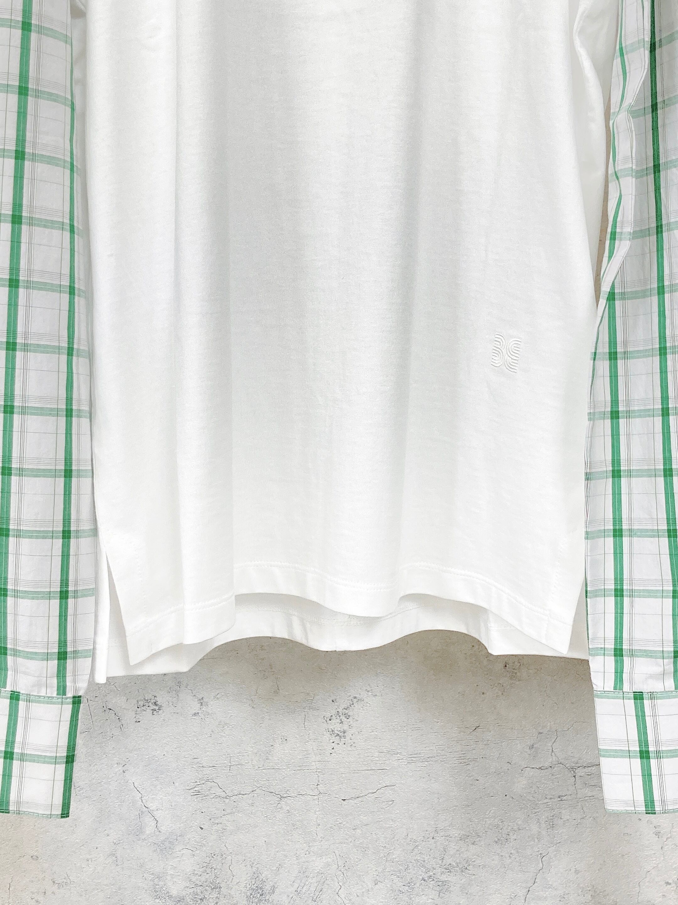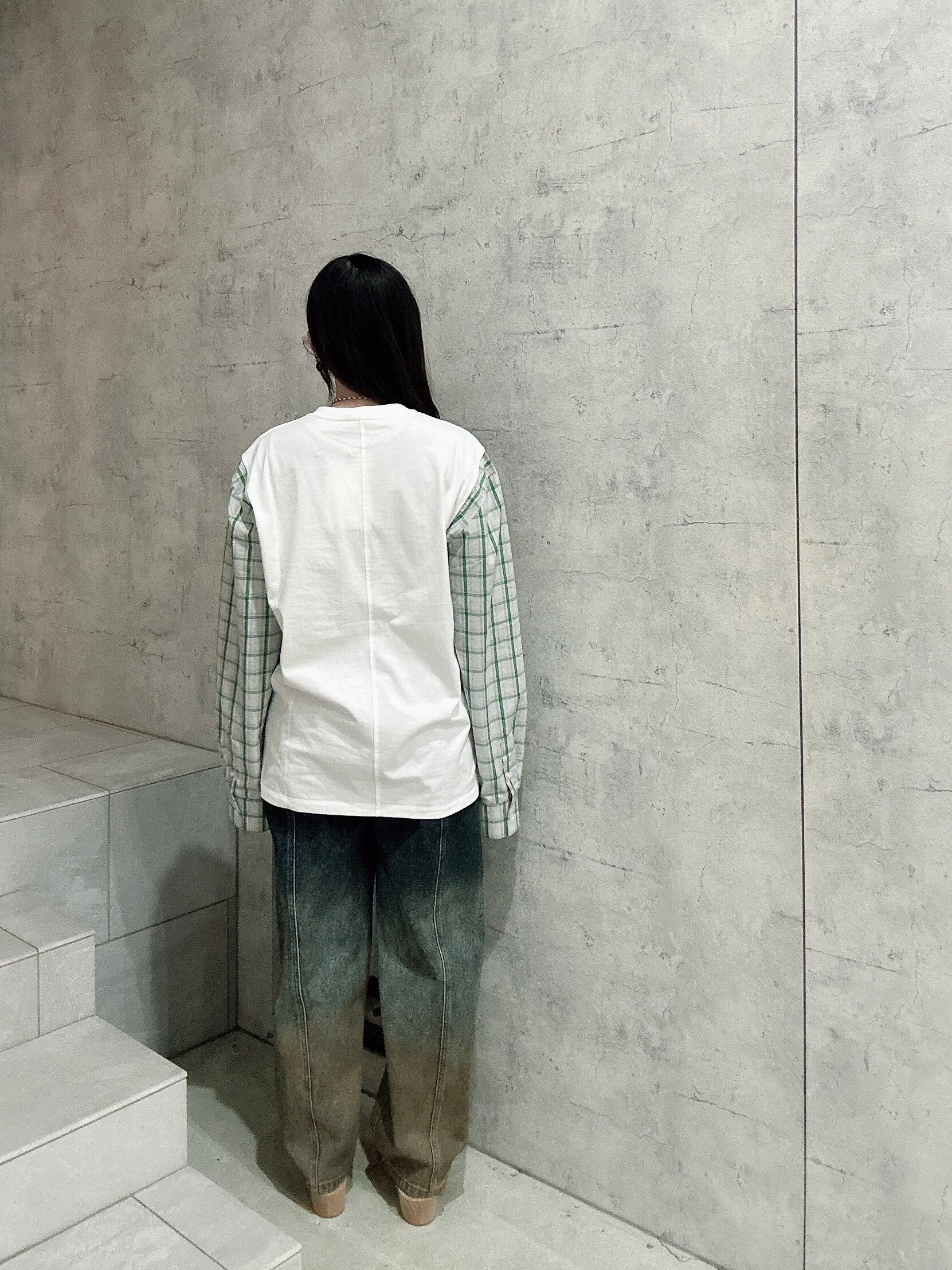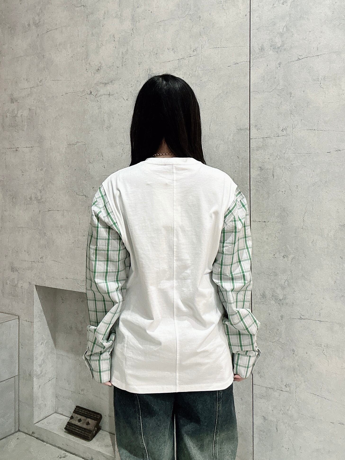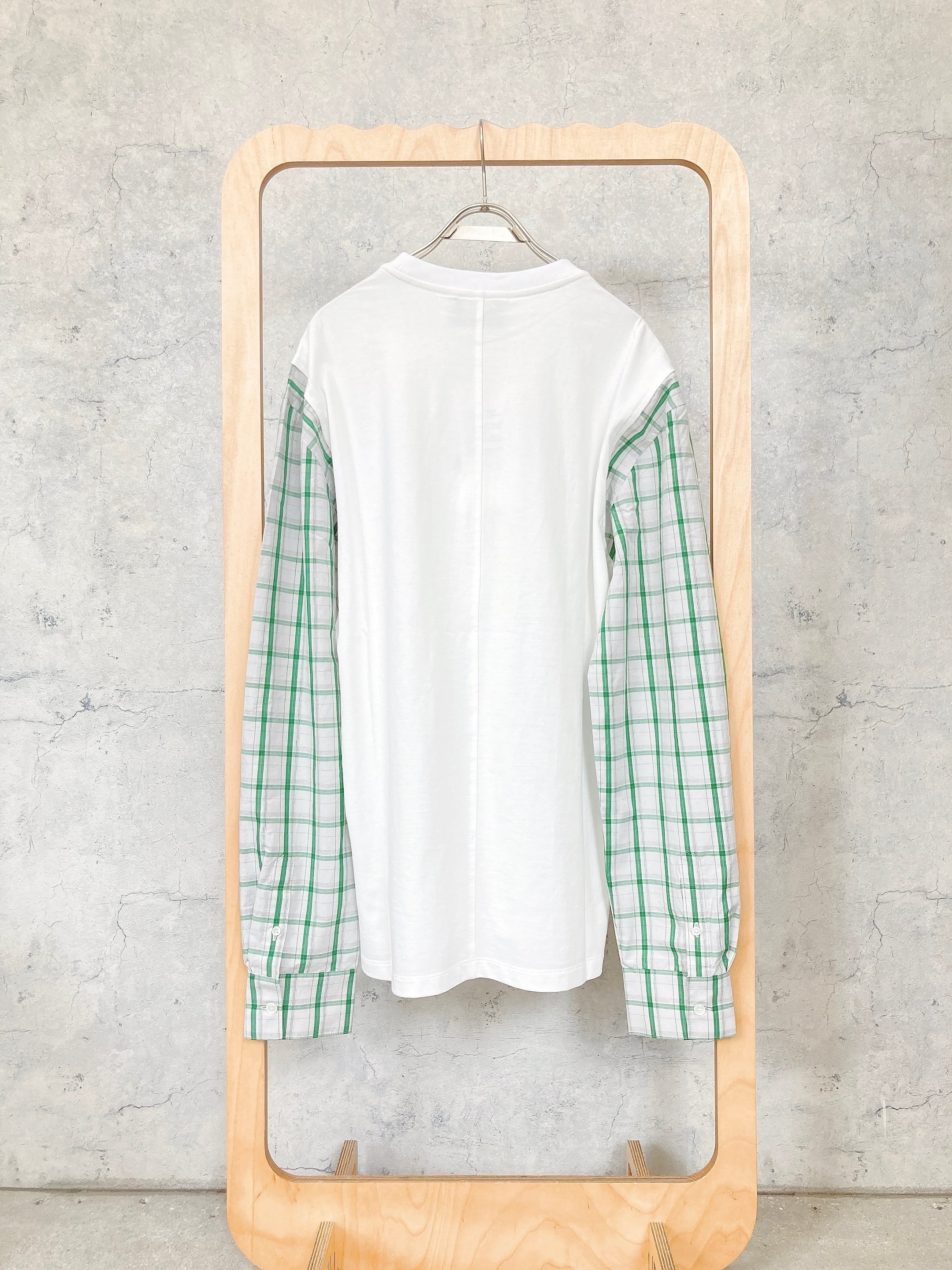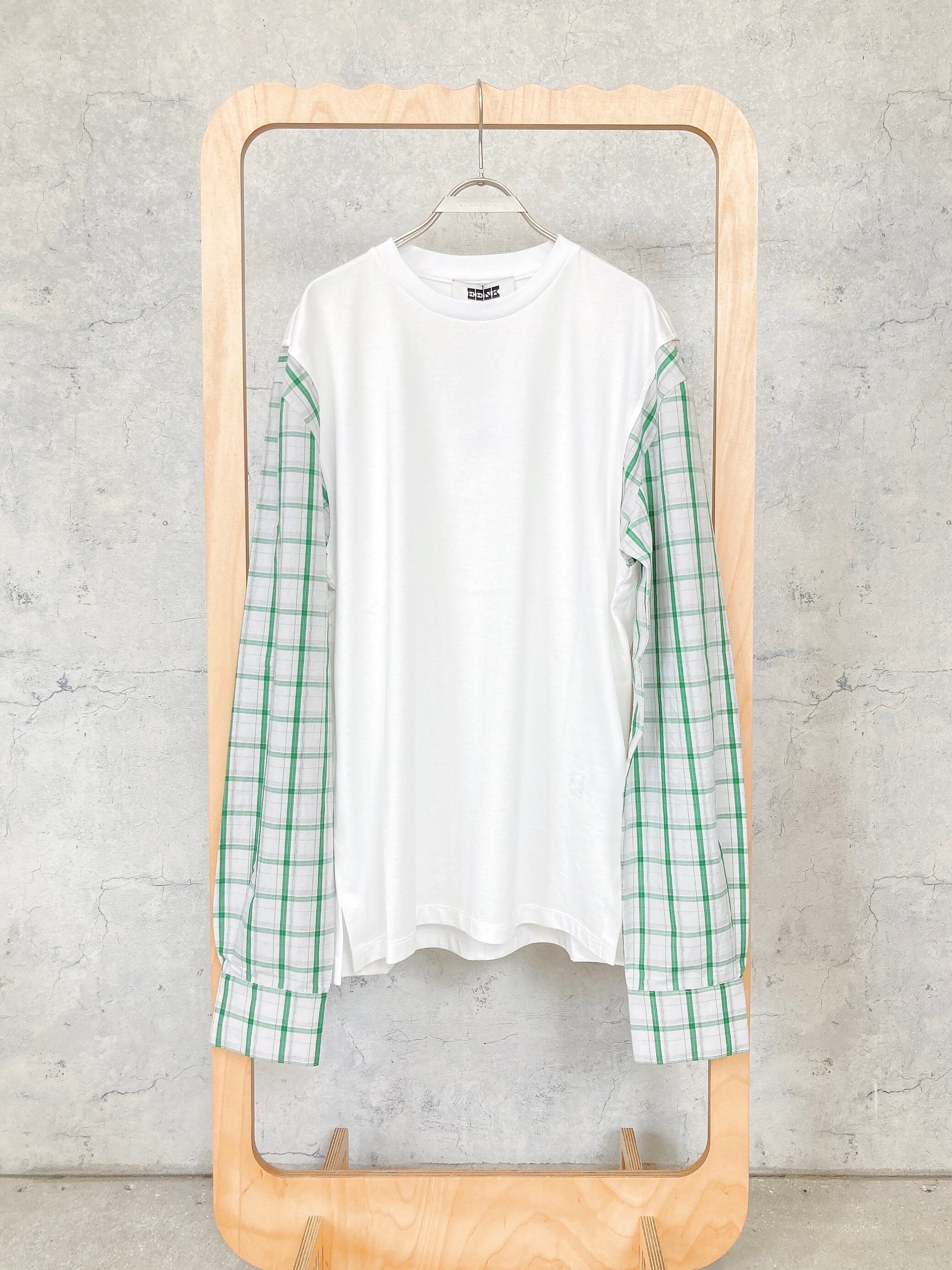 袖がチェックのシャツ布地になったユニセックスのロンT。