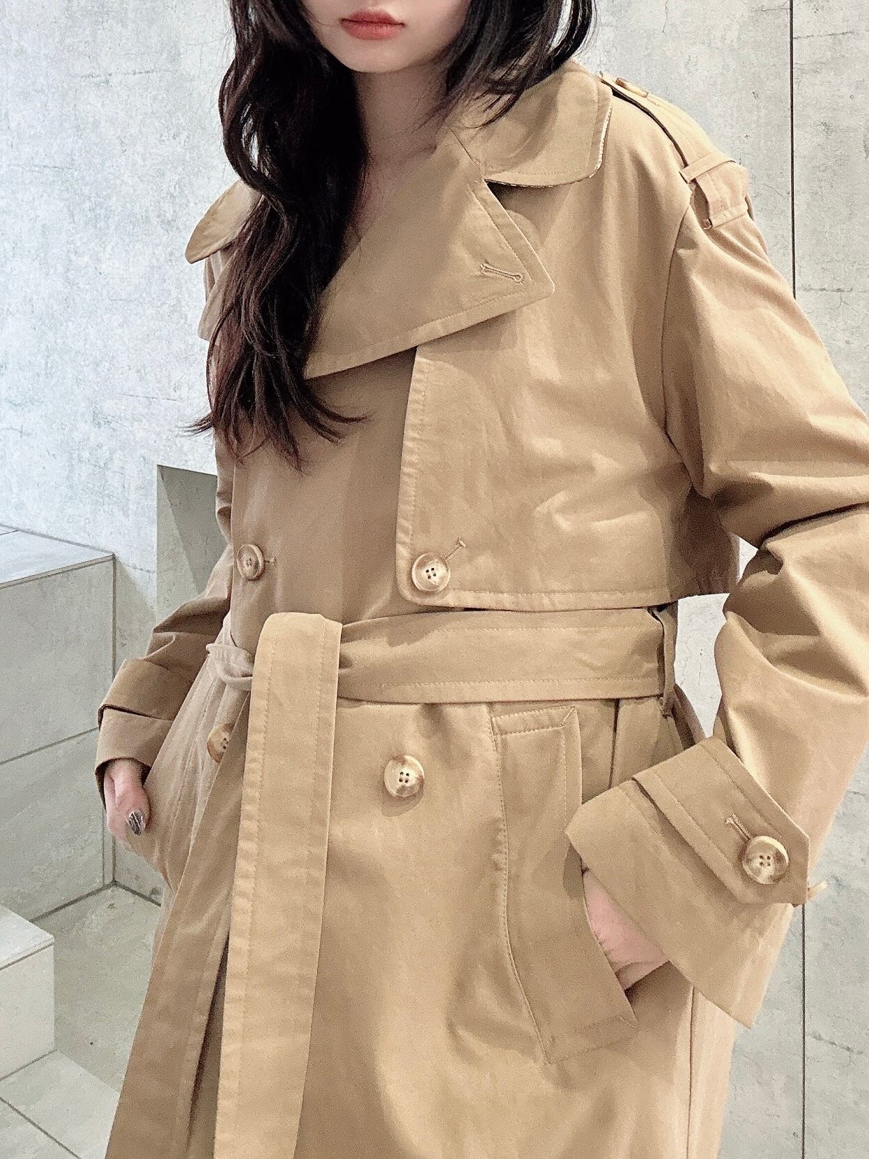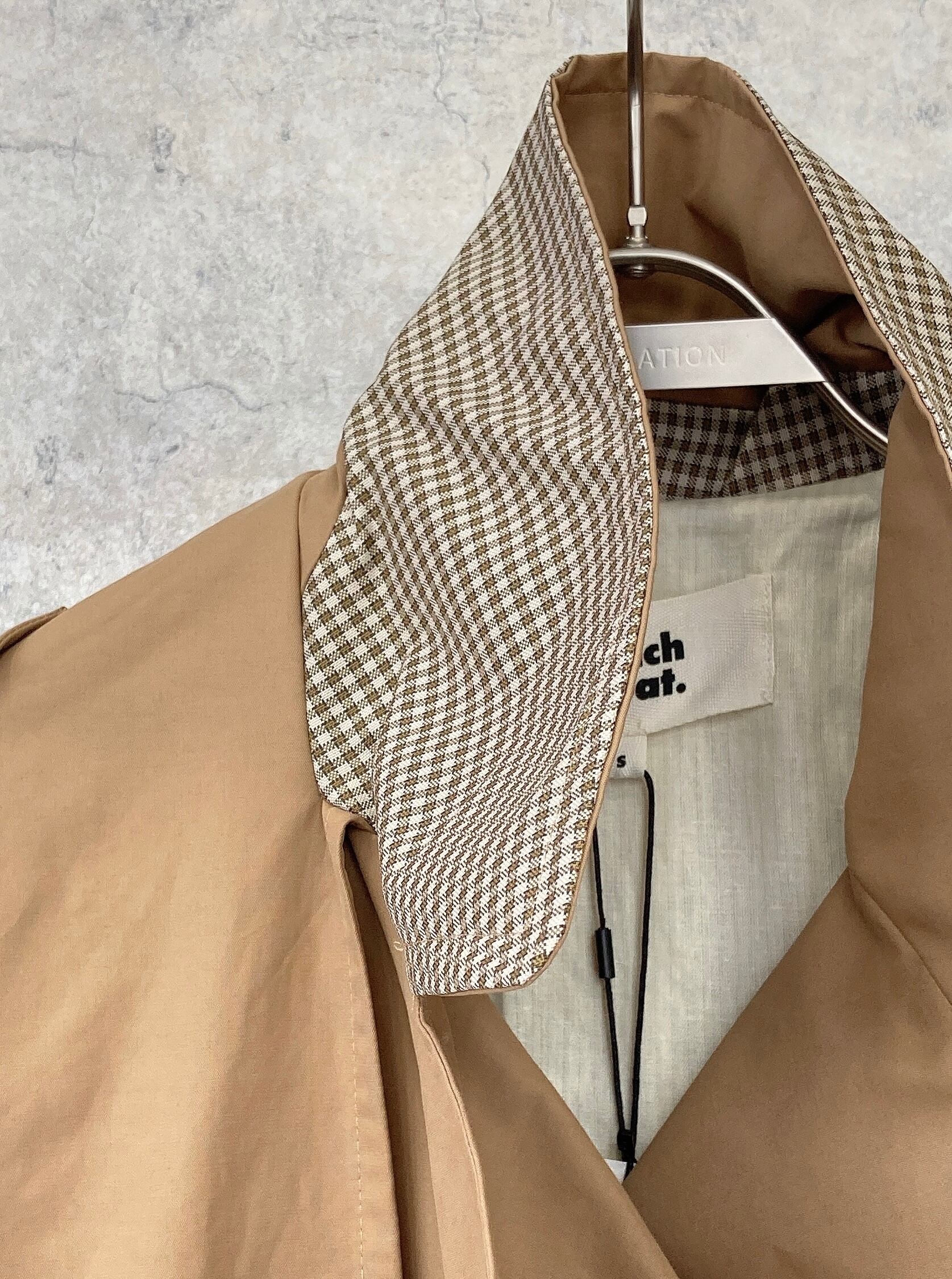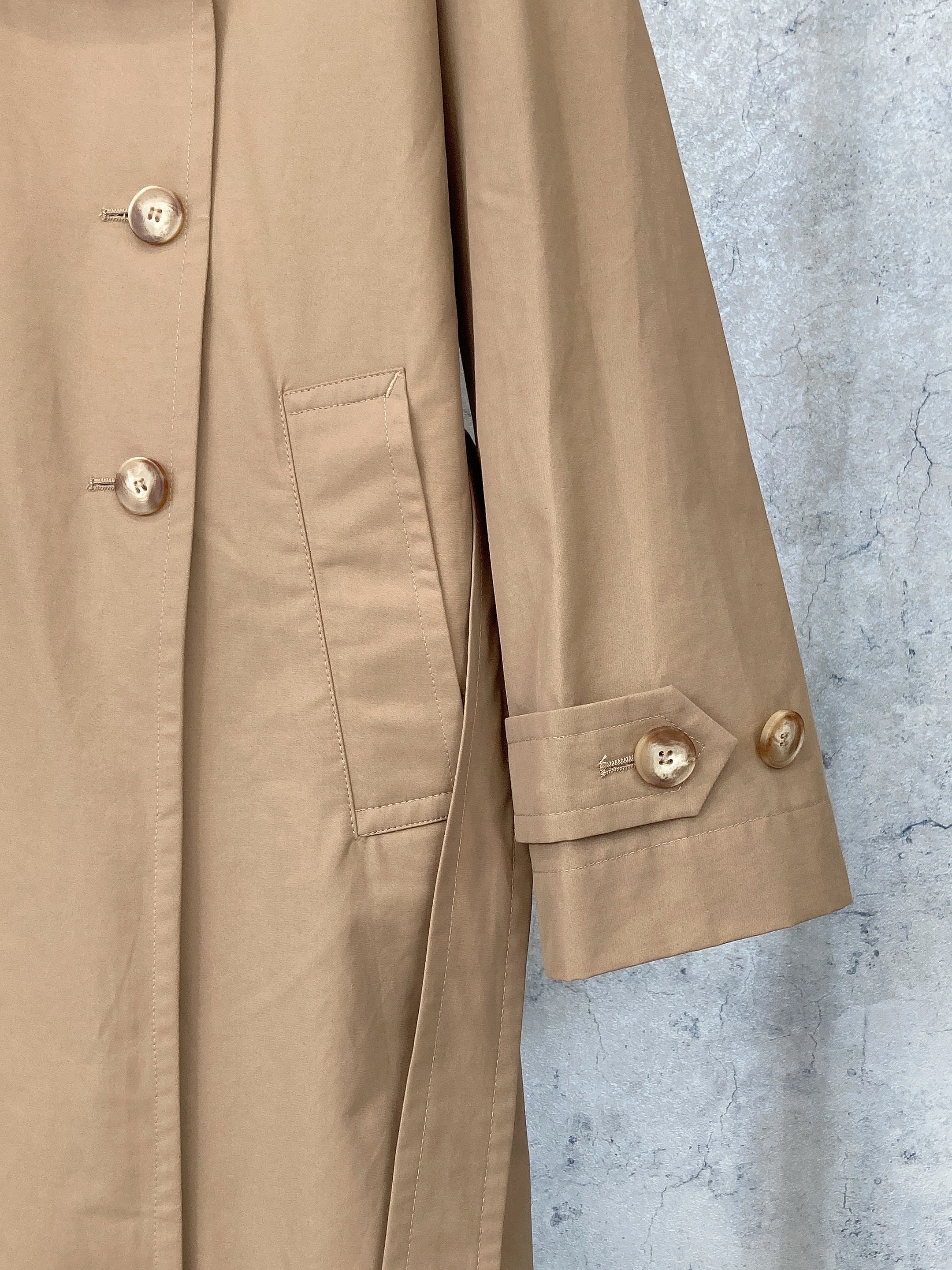 フランスらしい。襟の裏にボタンがありスタンドカラーに出来たりと様々な表情で着用出来るようデザインされている、フランスらしいグレージュのスプリングコート。