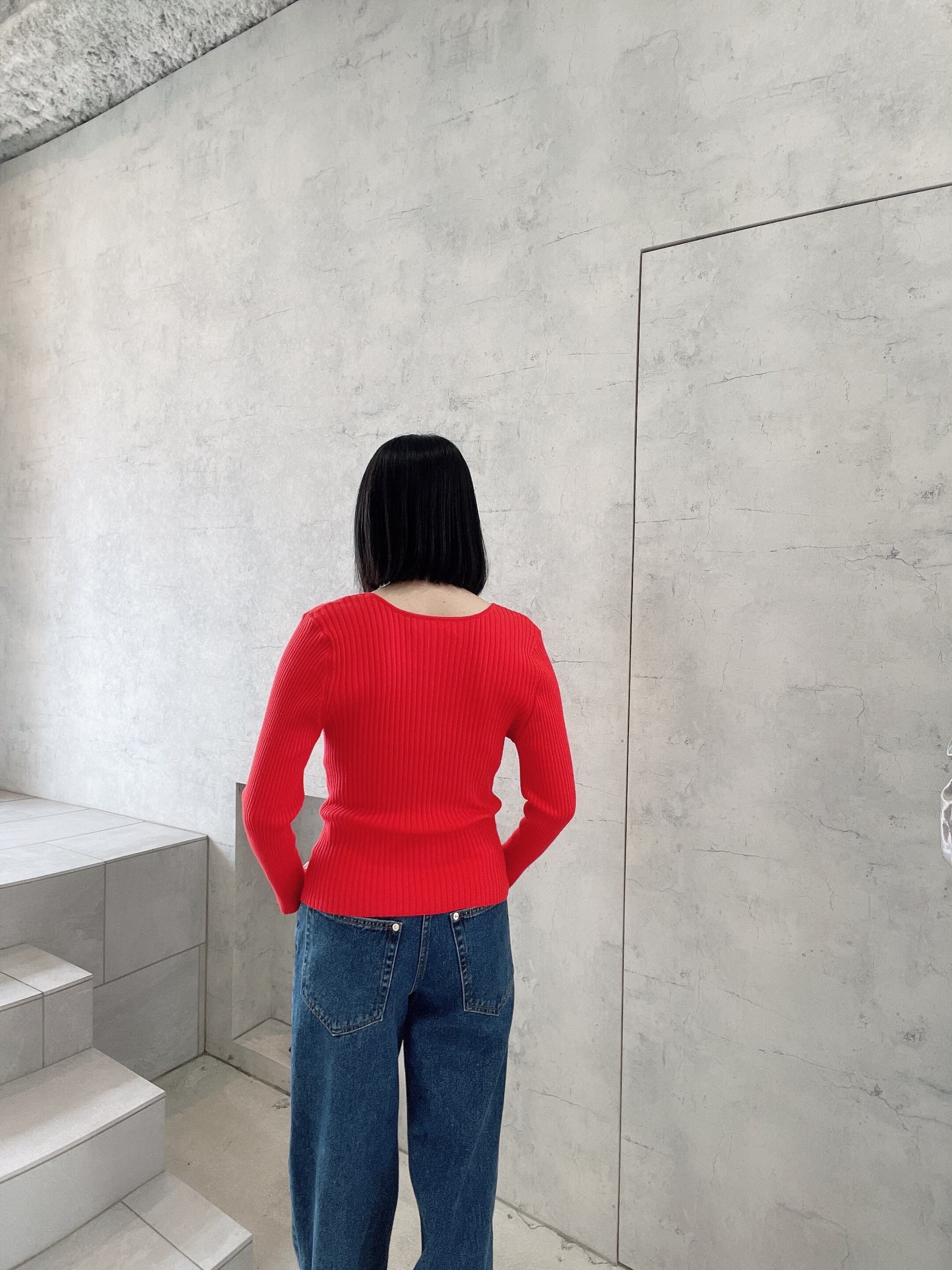 絶妙なTomatoカラーがスタイルのポイントに。