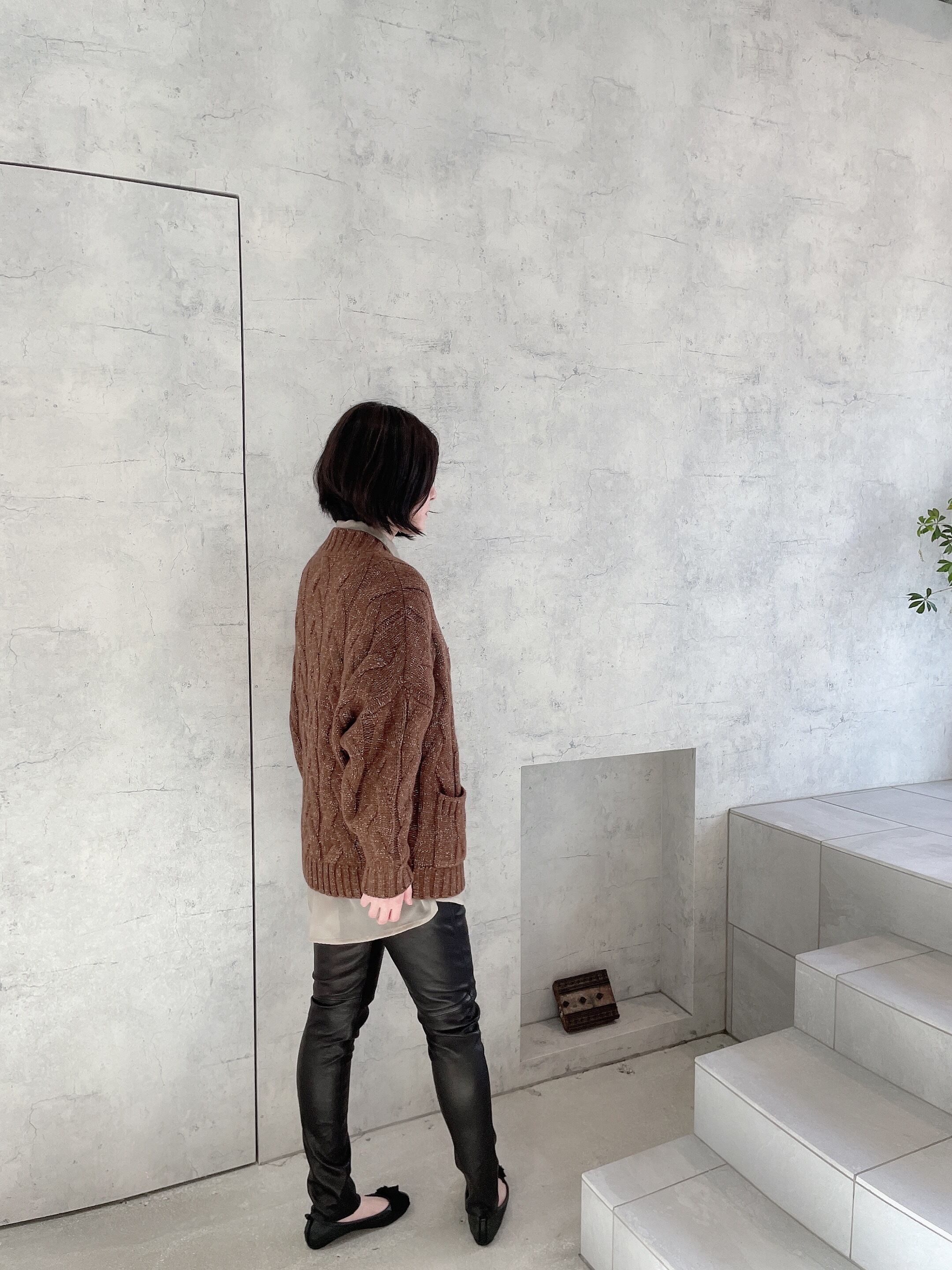 繊細なシルバーのラメ糸に、ヤクウール繊維を絡ませて撚糸した、立体感のあるケーブル編みが今年らしいカーディガン。