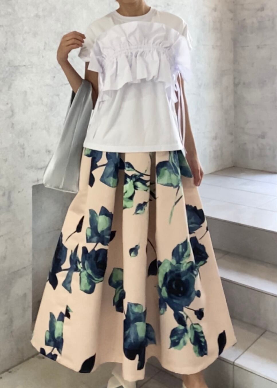 ハリ感たっぷりタフタ素材のフリルとフレンチノースリーブが一枚でこなれ感を演出。