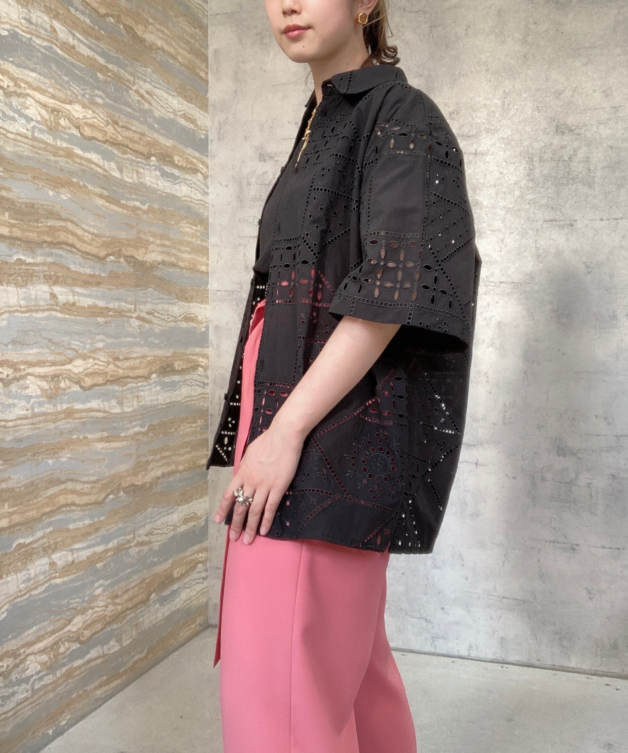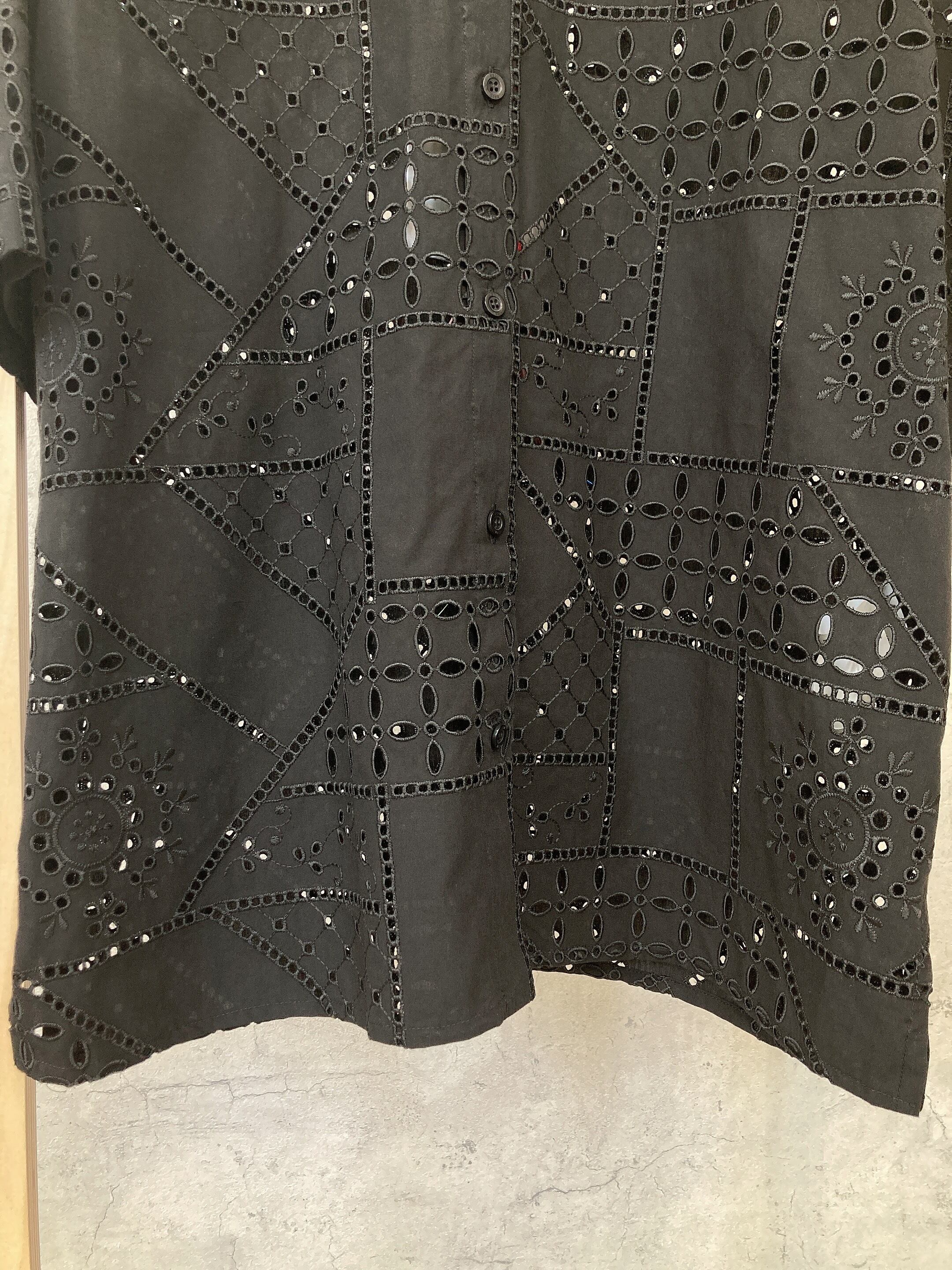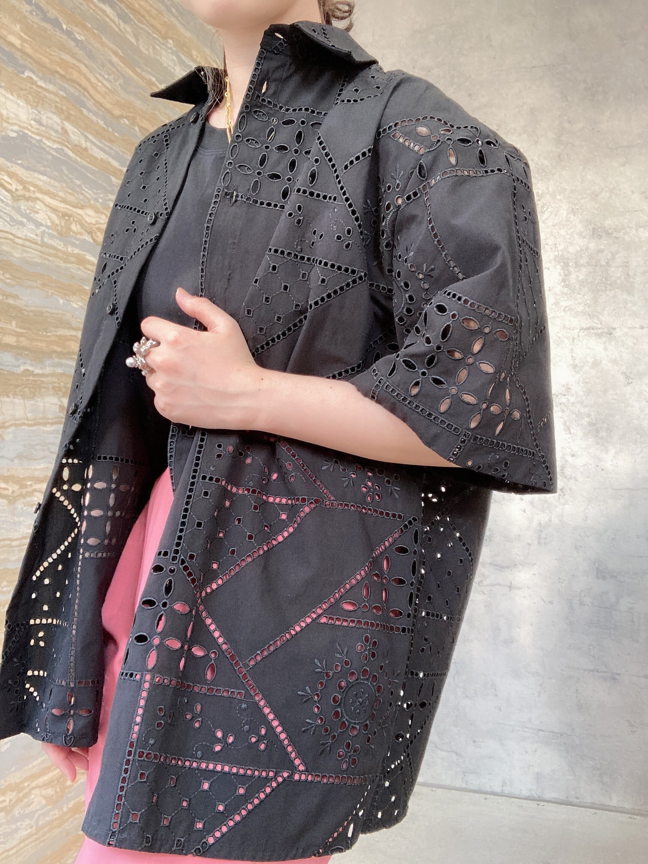様々なアイレットレースを幾何学的にパッチワークを施したユニークなデザイン。軽やかなコットン素材を用いているのでカジュアルな印象も。また幾何学模様のパッチワークなので可愛くなりすぎない大人っぽさも演出してくれます。