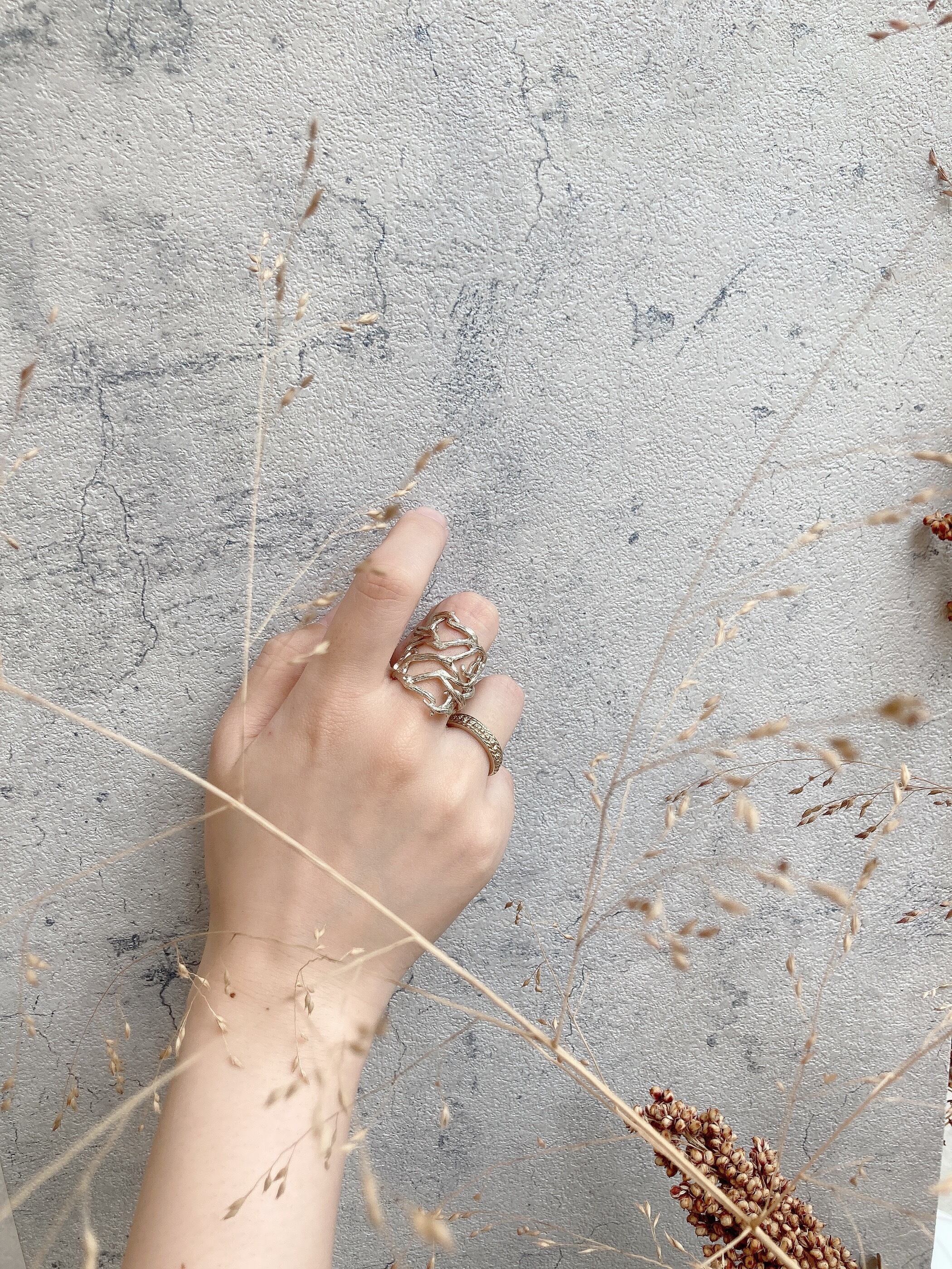 軽やかな枝モチーフは、一つでも差がつくデザインで、華奢なリングと合わせてメリハリのある華やかな印象になる魅力的な一品。