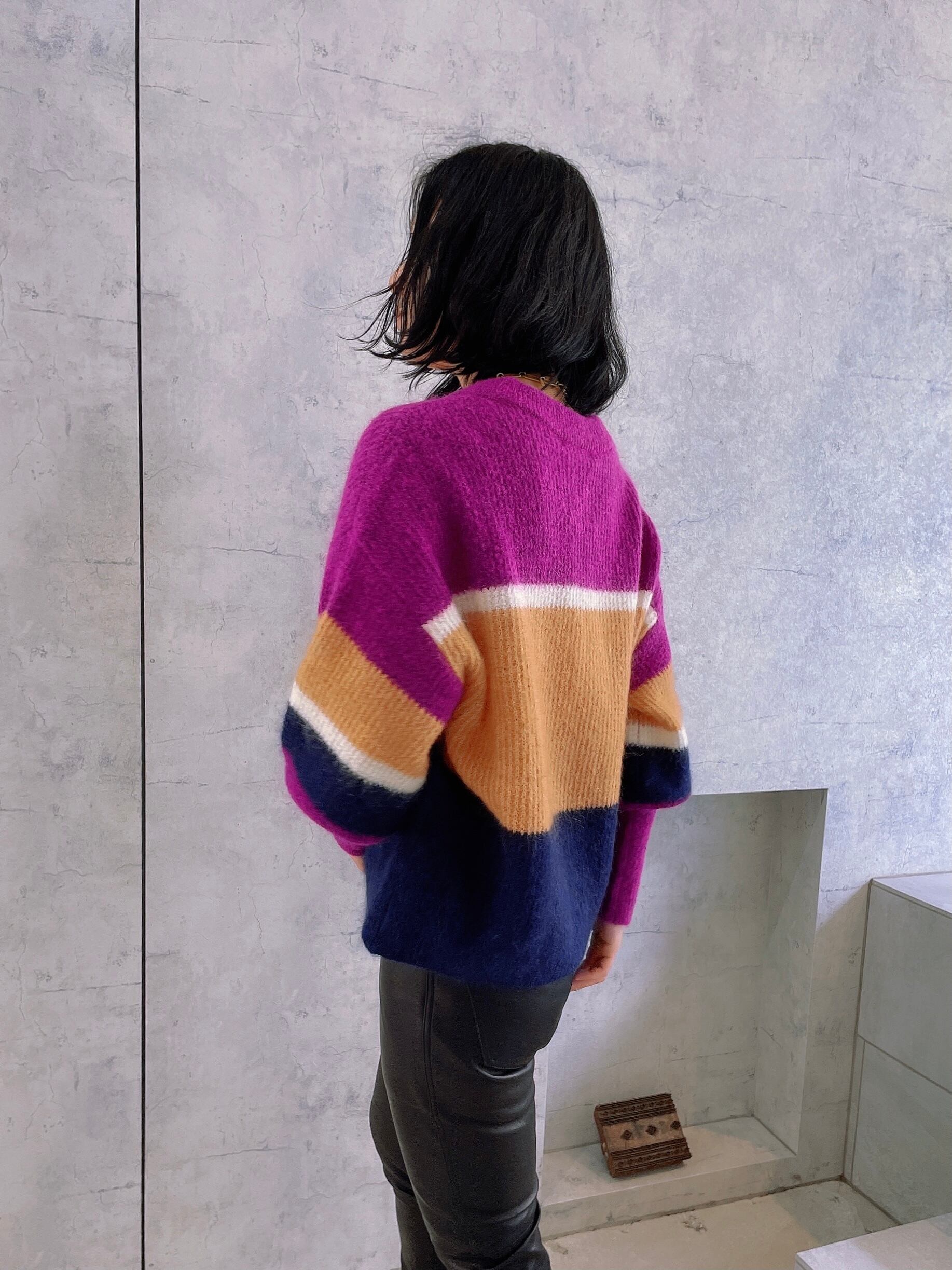 1枚で様になる袖コンシャスなボリュームニットはキャッチーなカラーリングをピック。