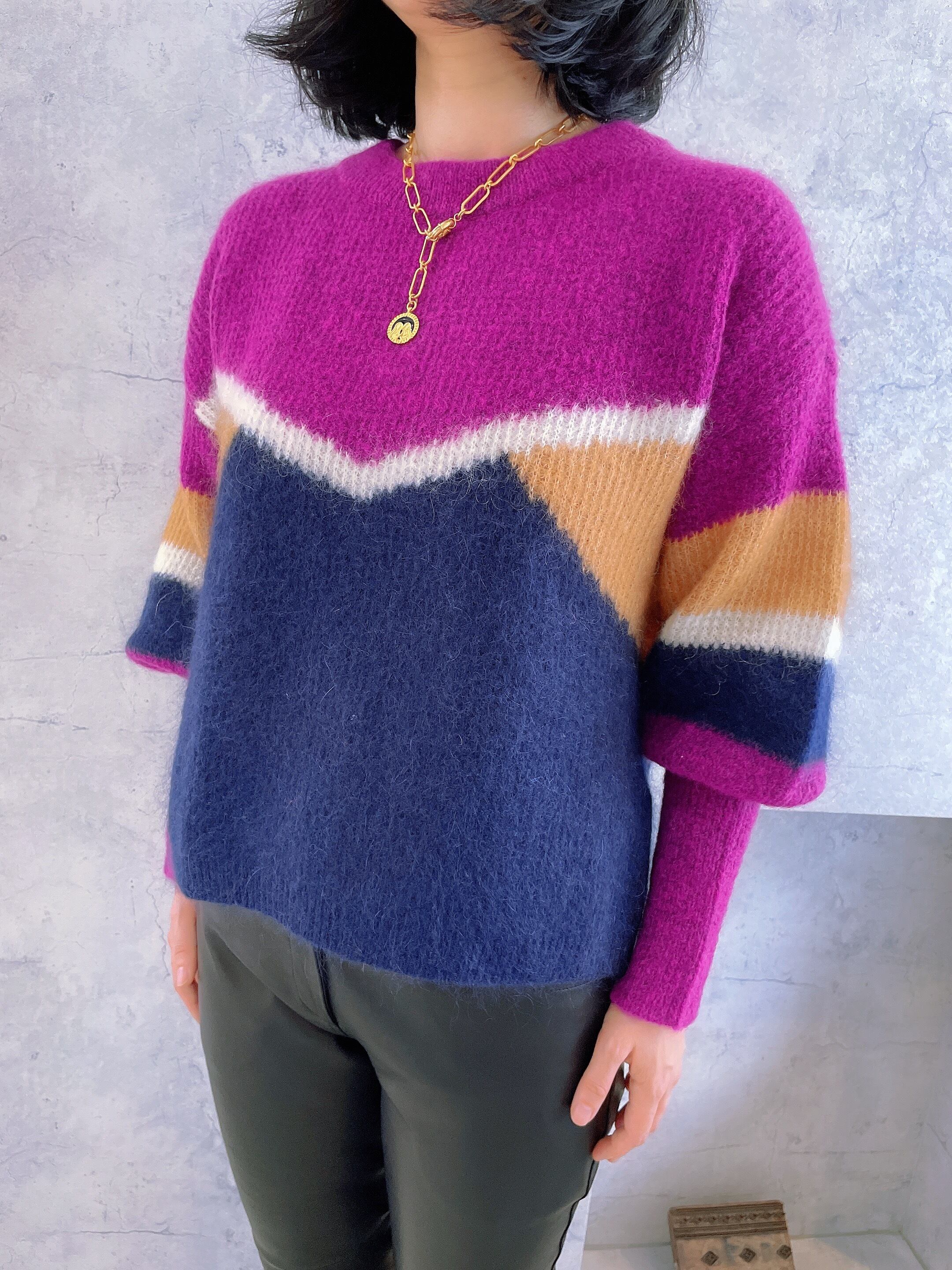 circulation送料無料【Maison Haussmann メゾン・オスマン/フランス】 配色ニット ニット 変形ボーダー パフスリーブ NO. MH TMHPV115