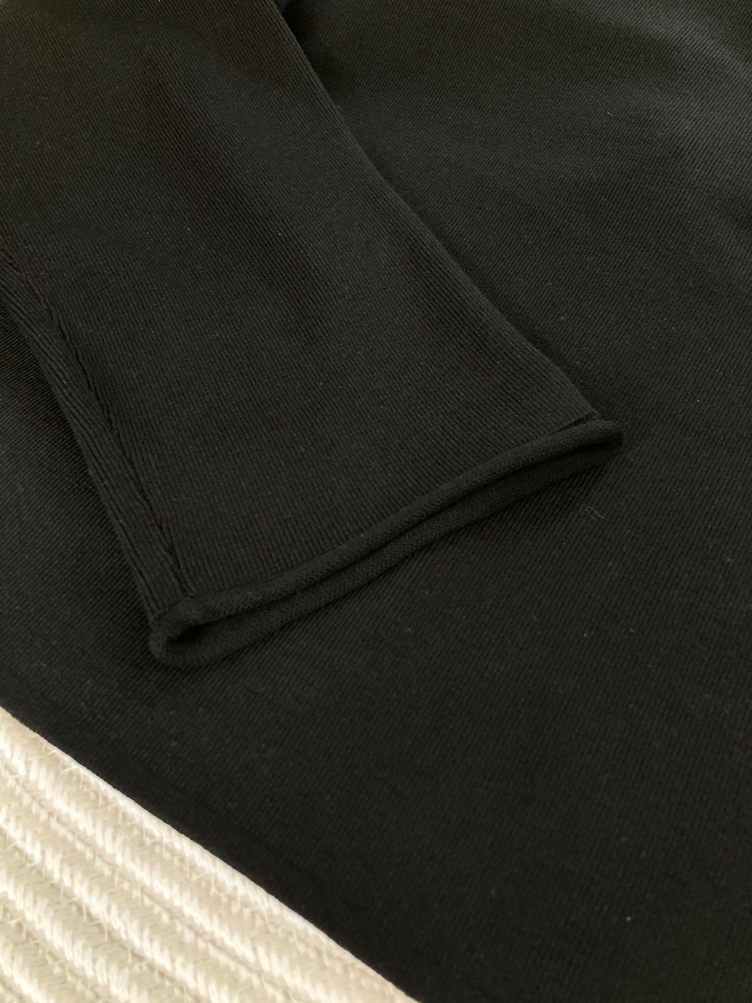 バックは、ネックにねじりをいれ背中から裾まで開いている事でインナー次第で雰囲気を変えて楽しめるデザインとなってます。