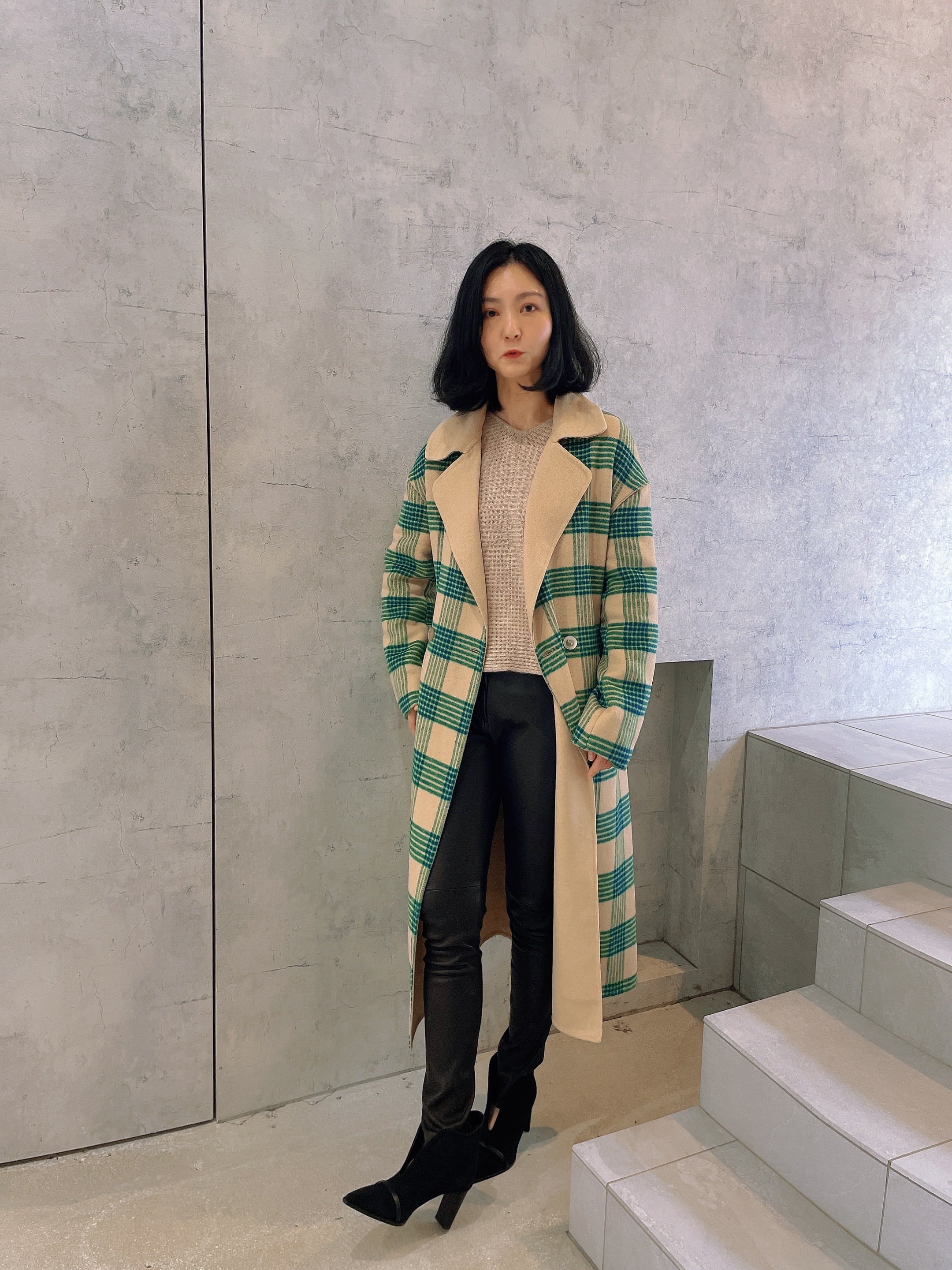 目を惹く艶やかなグリーンのチェックに落ち着いたシックなベージュとの組み合わせはスタリッシュな雰囲気をコーディネートにプラス。