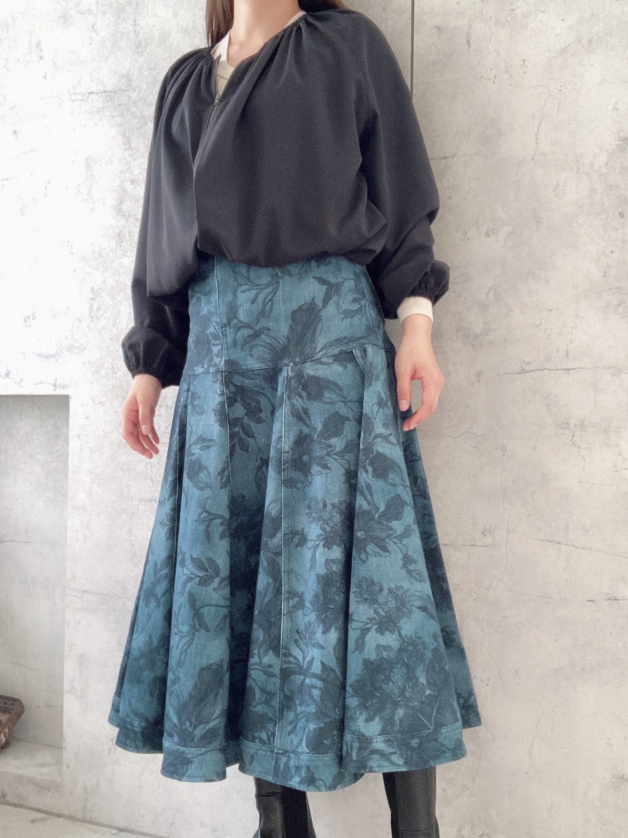 Aラインが綺麗なシルエットなので、シンプルなトップスと合わせるとよりエレガントな印象をあたえてくれます。