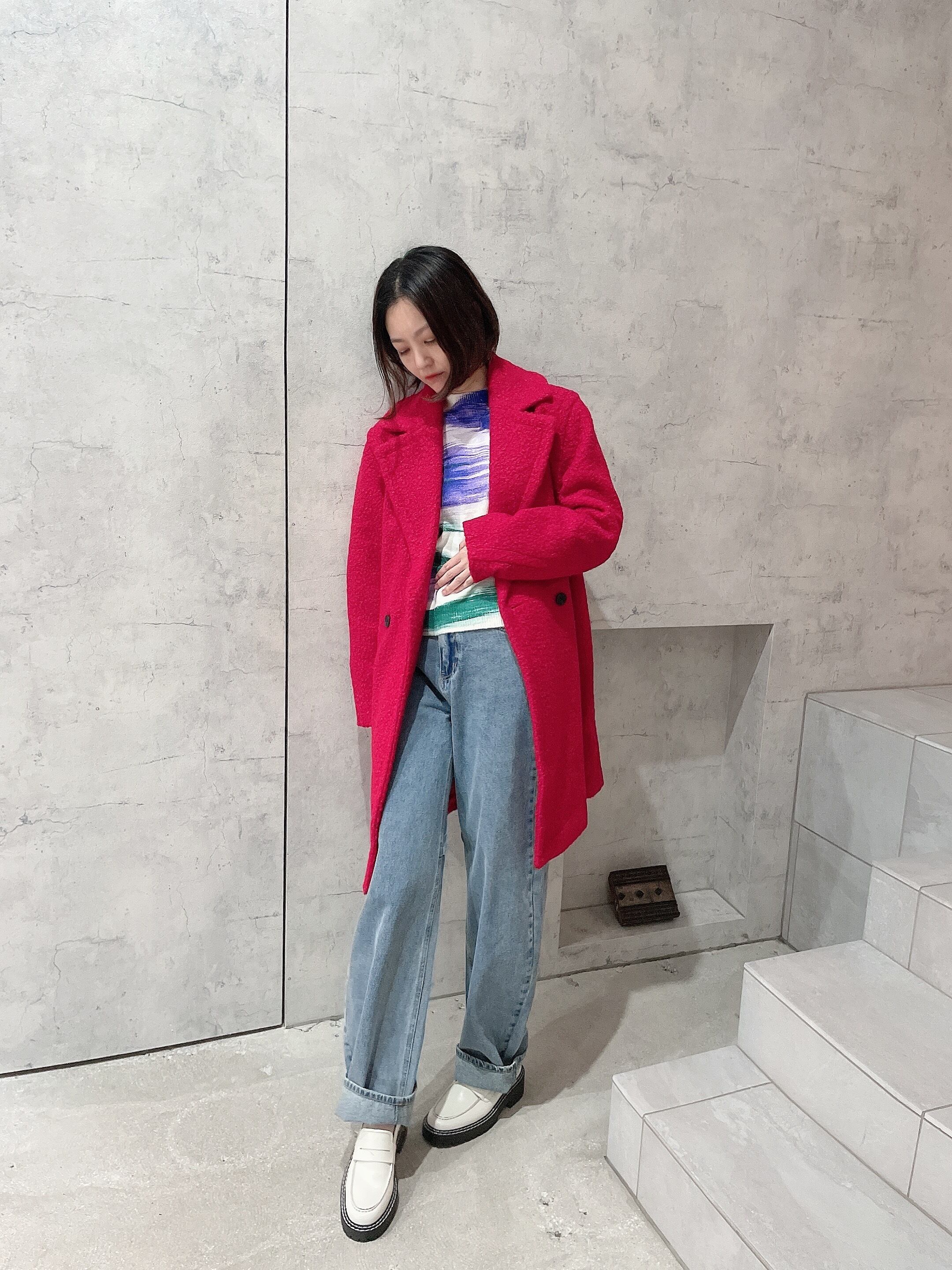 コクーンシルエットのボアコート。裾がすぼまったラインのシルエットのコートであるため,着膨れしにくいアイテムとなっております。セミレングスコートはジャケット感覚でも着用でき幅広いスタイリングに。またチェリーがかったREDカラーが赤すぎないヨーロッパならではのカラーです。