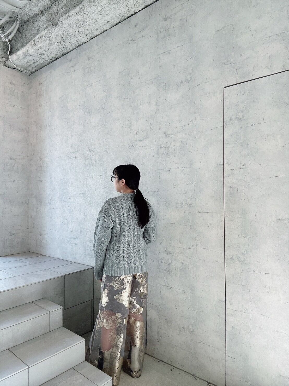 暖かさと保温性、通気性にも優れた稀少なヤクの毛で編みたてたトラッドなケーブル編みセーターにメタリックな加工を施した、ベーシックだけれど古臭くならない、ずっと愛用いただけるセーターです。ヤク独特の少しハリ感のある質感がミドルゲージながらスタイリングをすっきりとクリーンに見せてくれます。