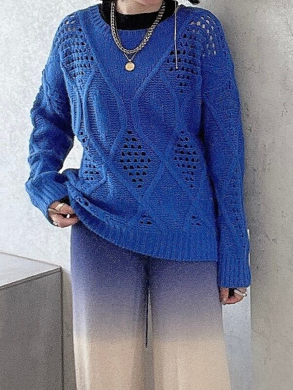 ローゲージでありながらメッシュ編みで全体をすっきりと見せてくれます。1枚では勿論Yシャツ合わせなどインナーが透けて見え、よりスタイルアップしてくれるのも嬉しいポイント。