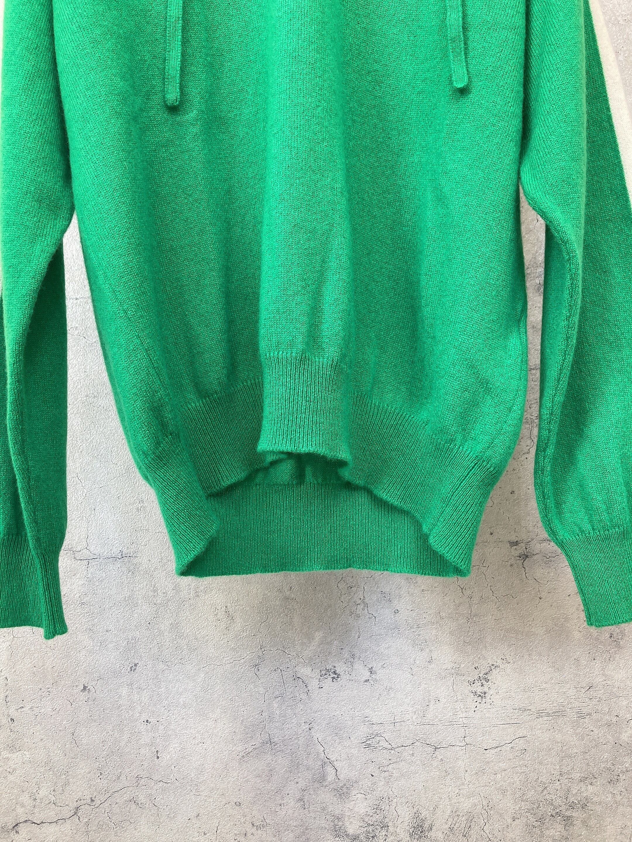 鮮やかなグリーンにWhiteなロゴがインターシャ製法で施されたフーディーニット。