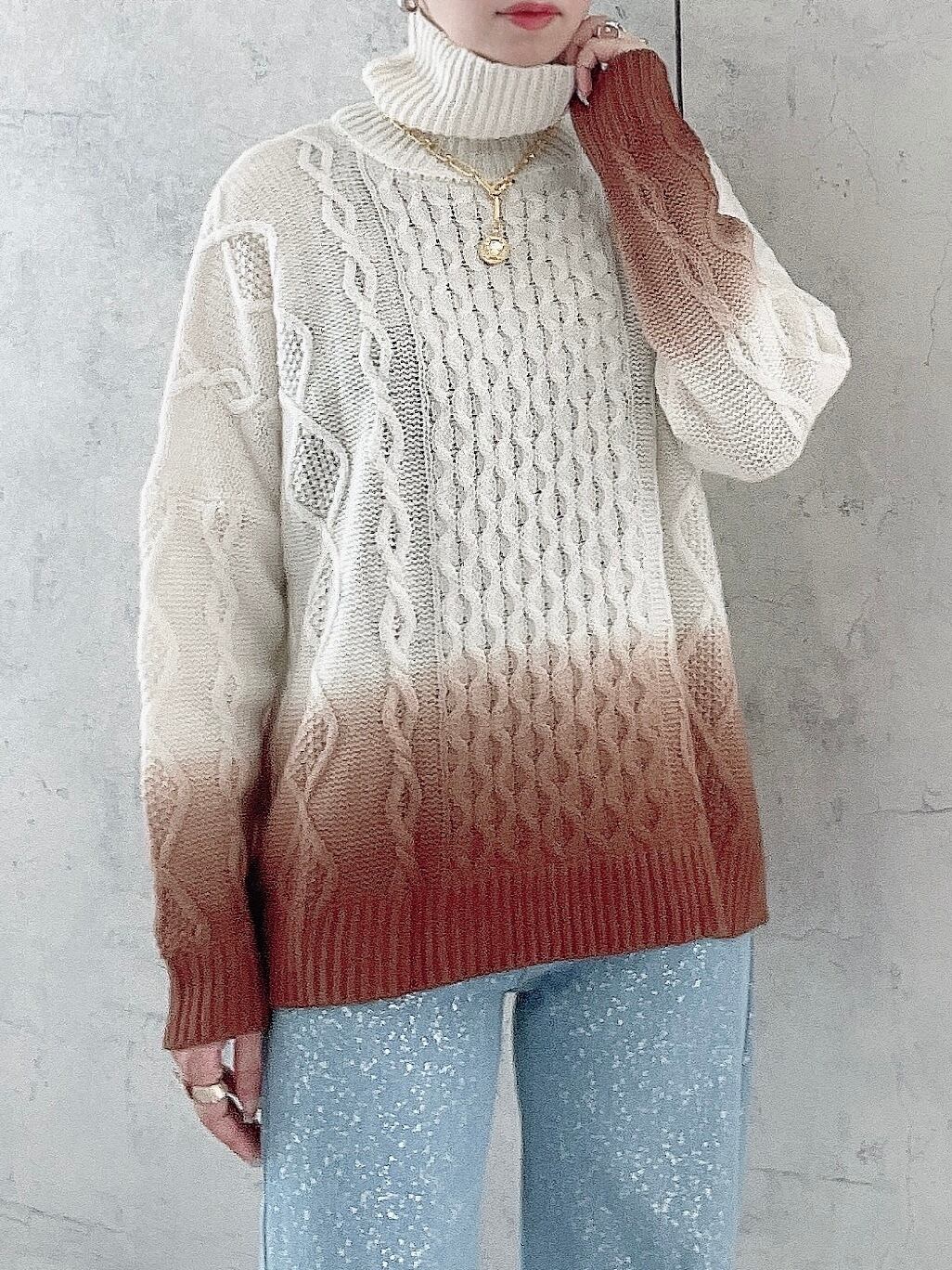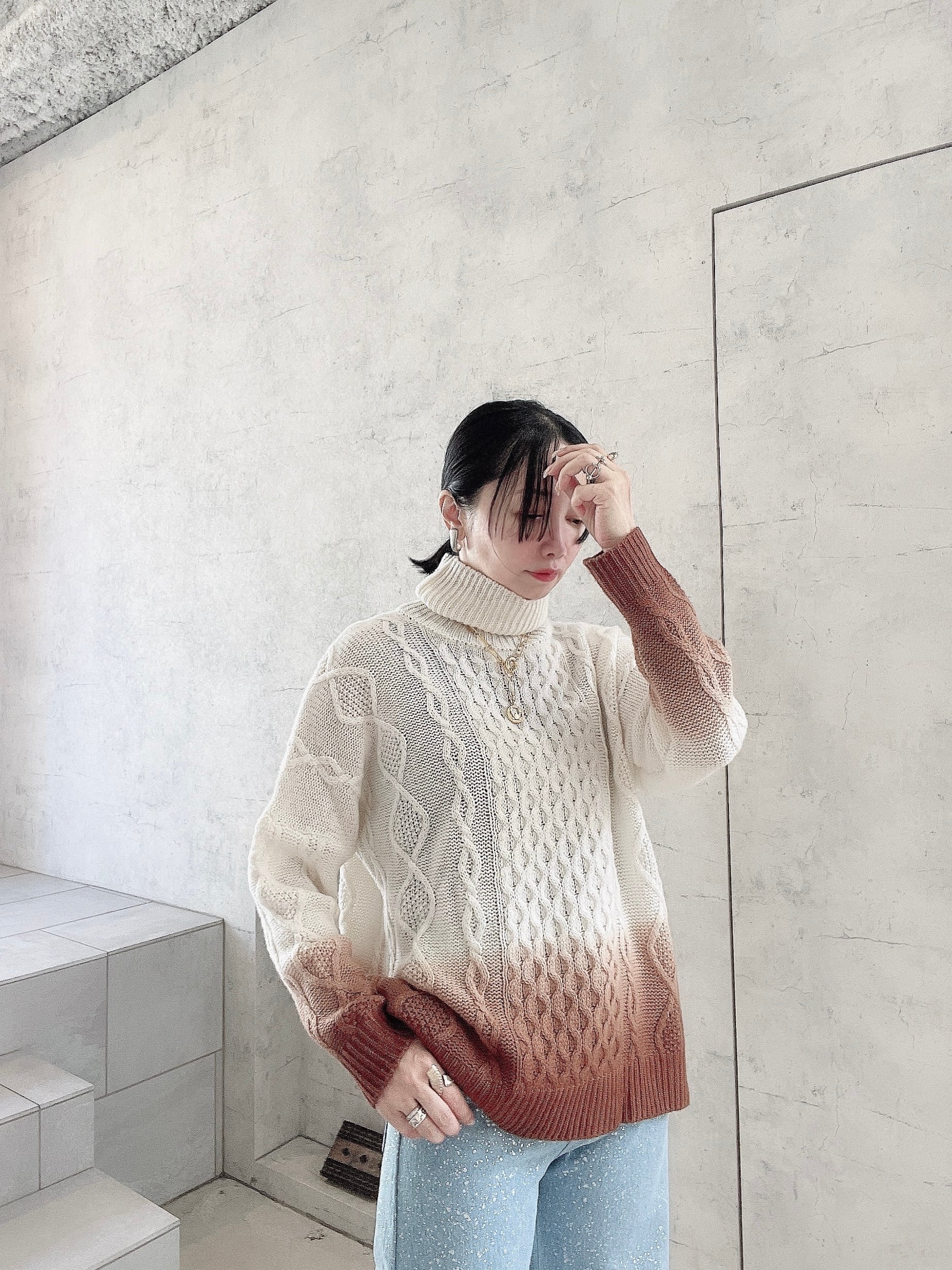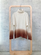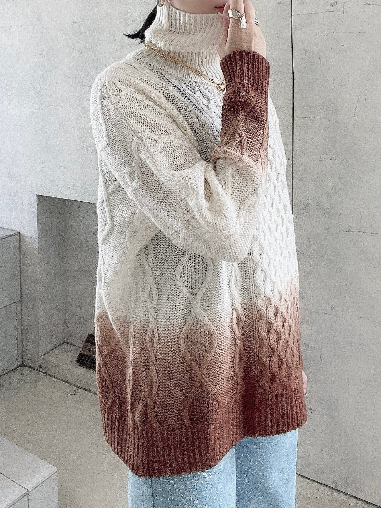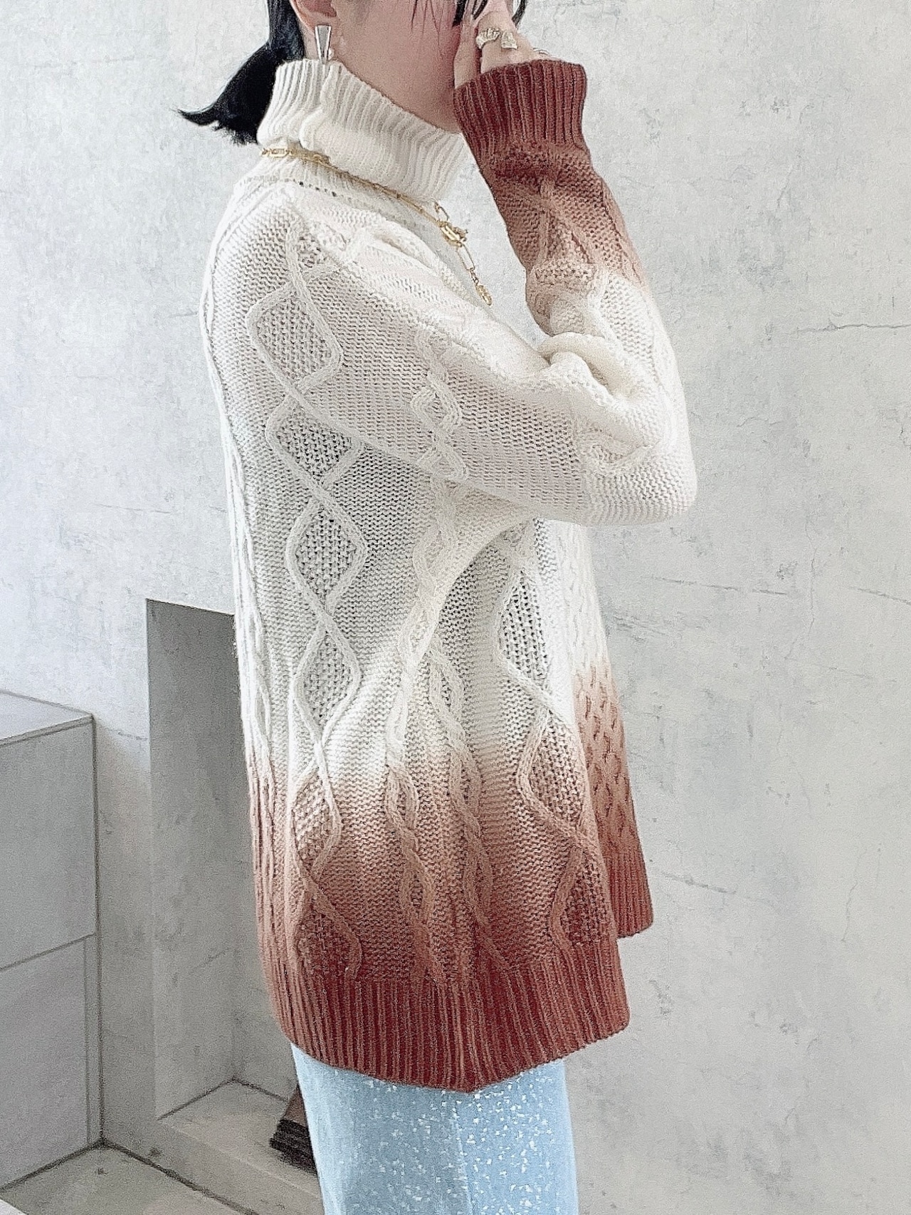 グラデーション染色の施されたタートルネックニット。カプチーノのようなカラーがフランスらしいカラーリング。