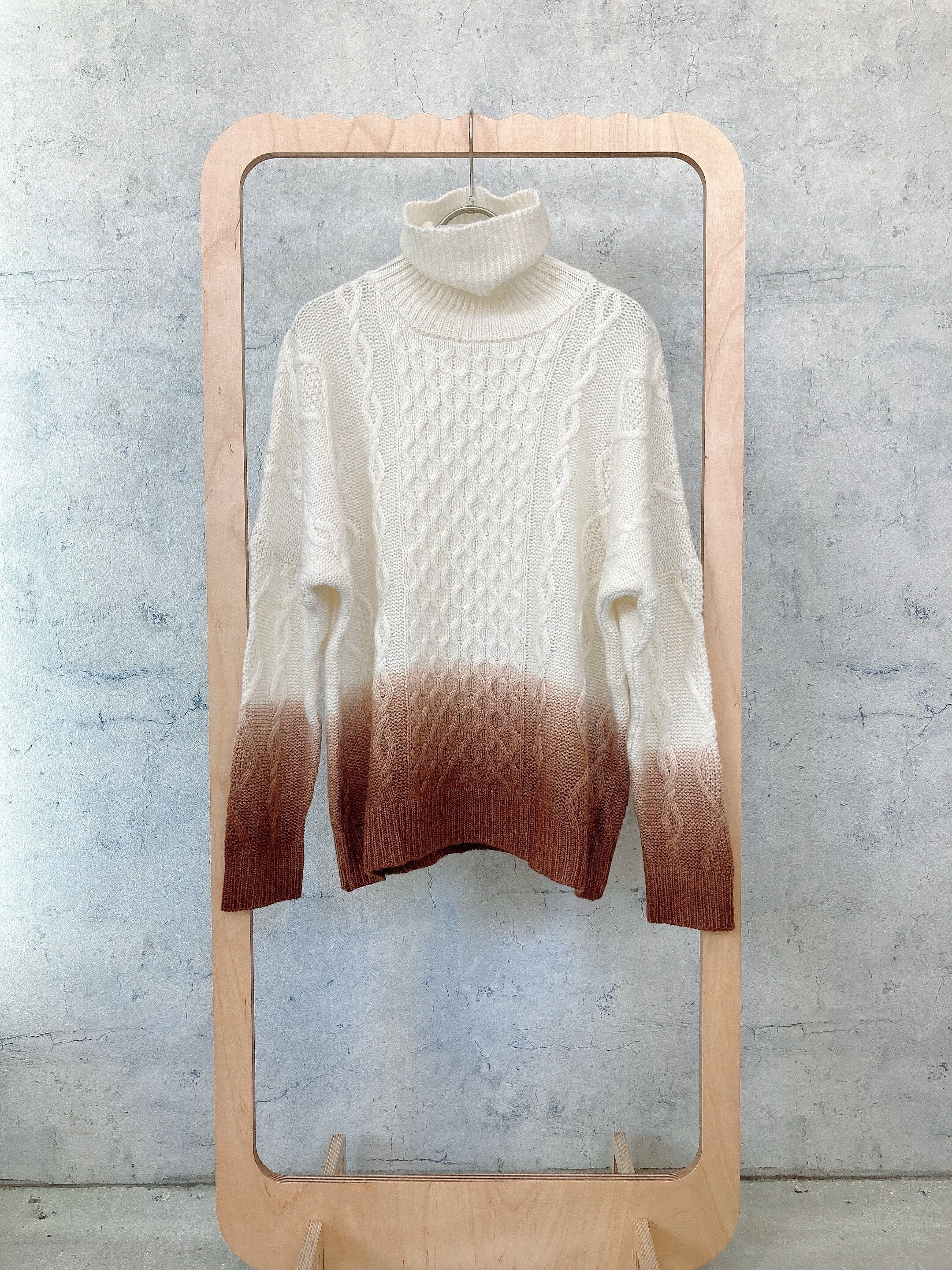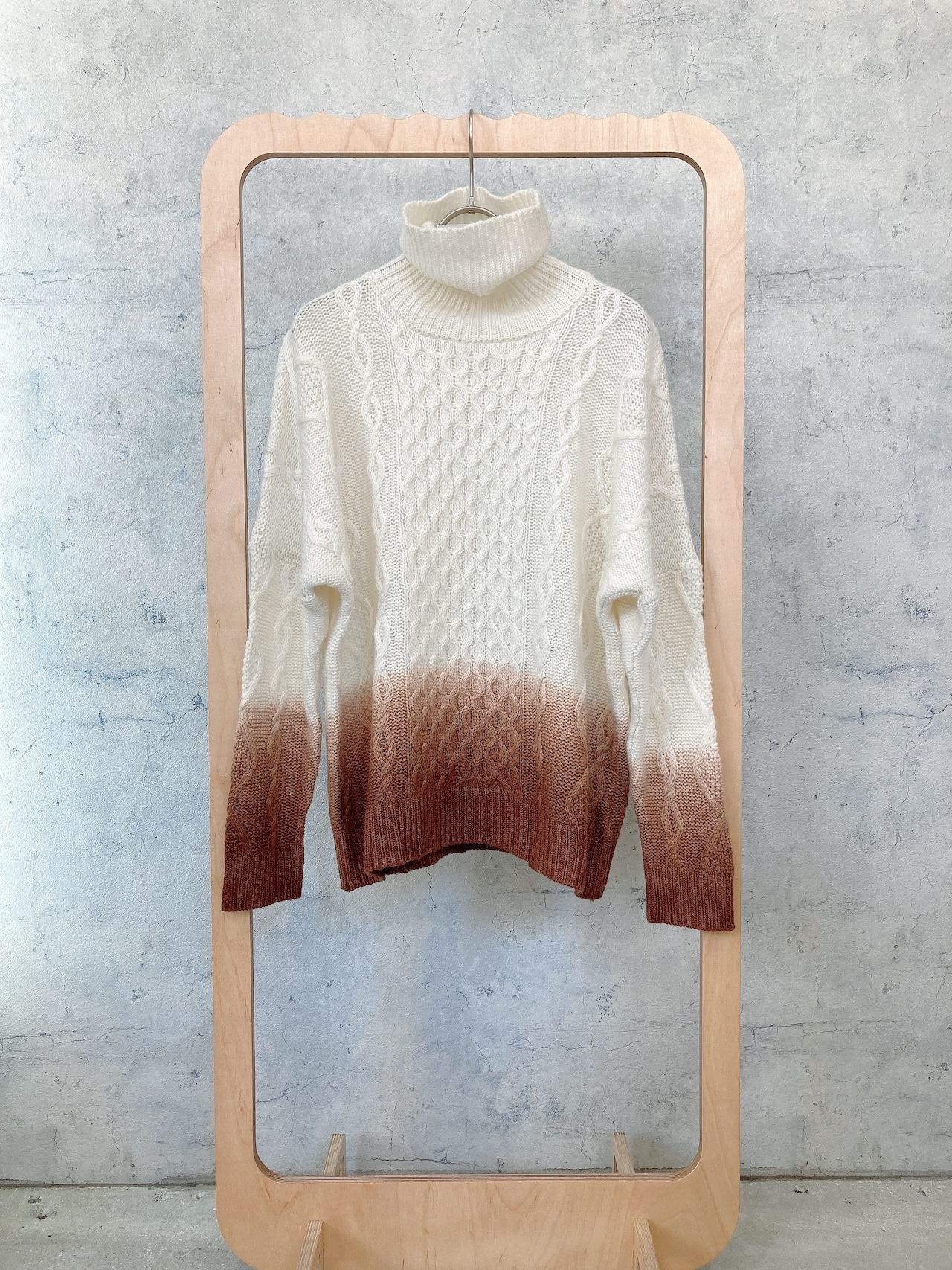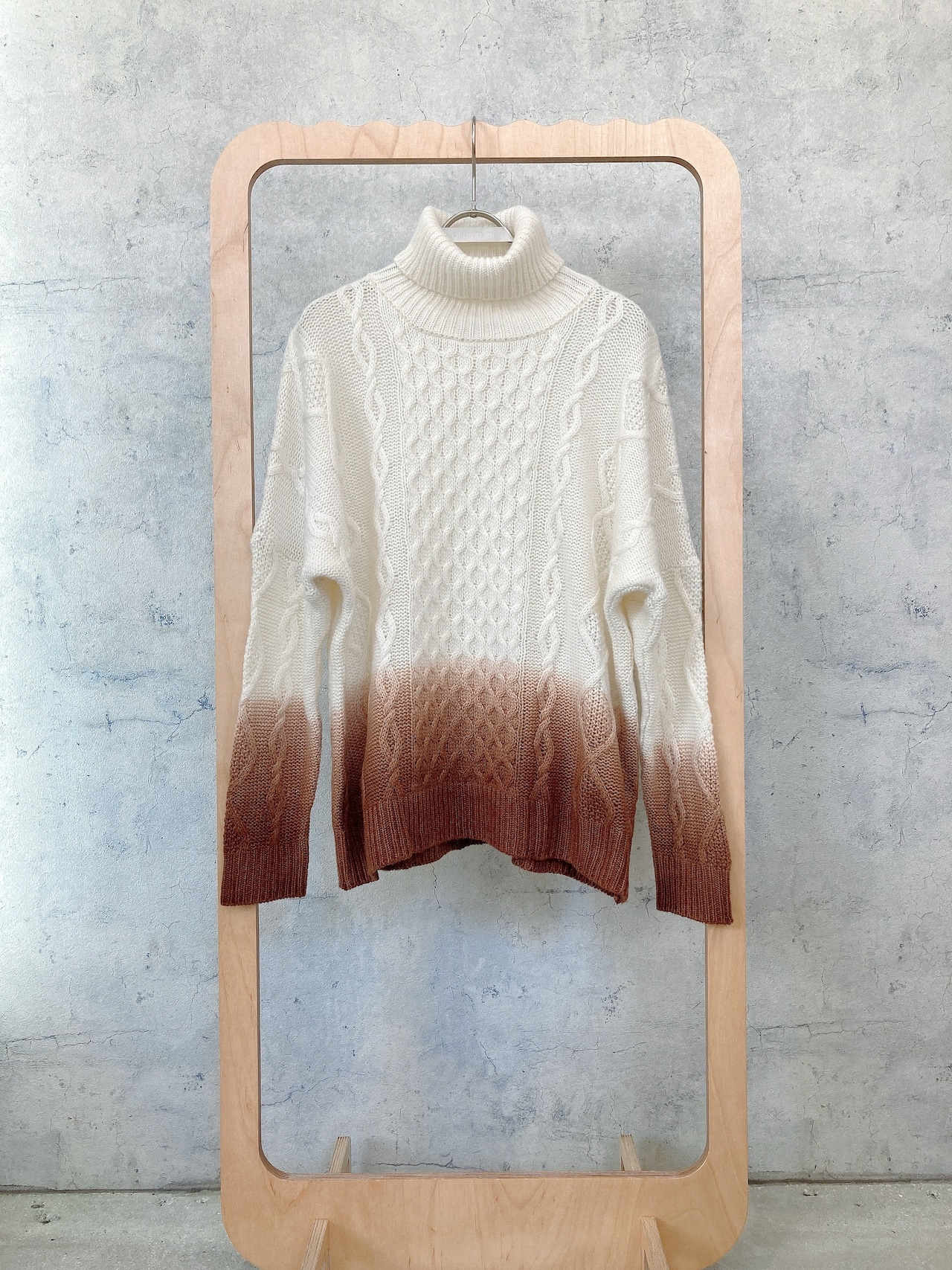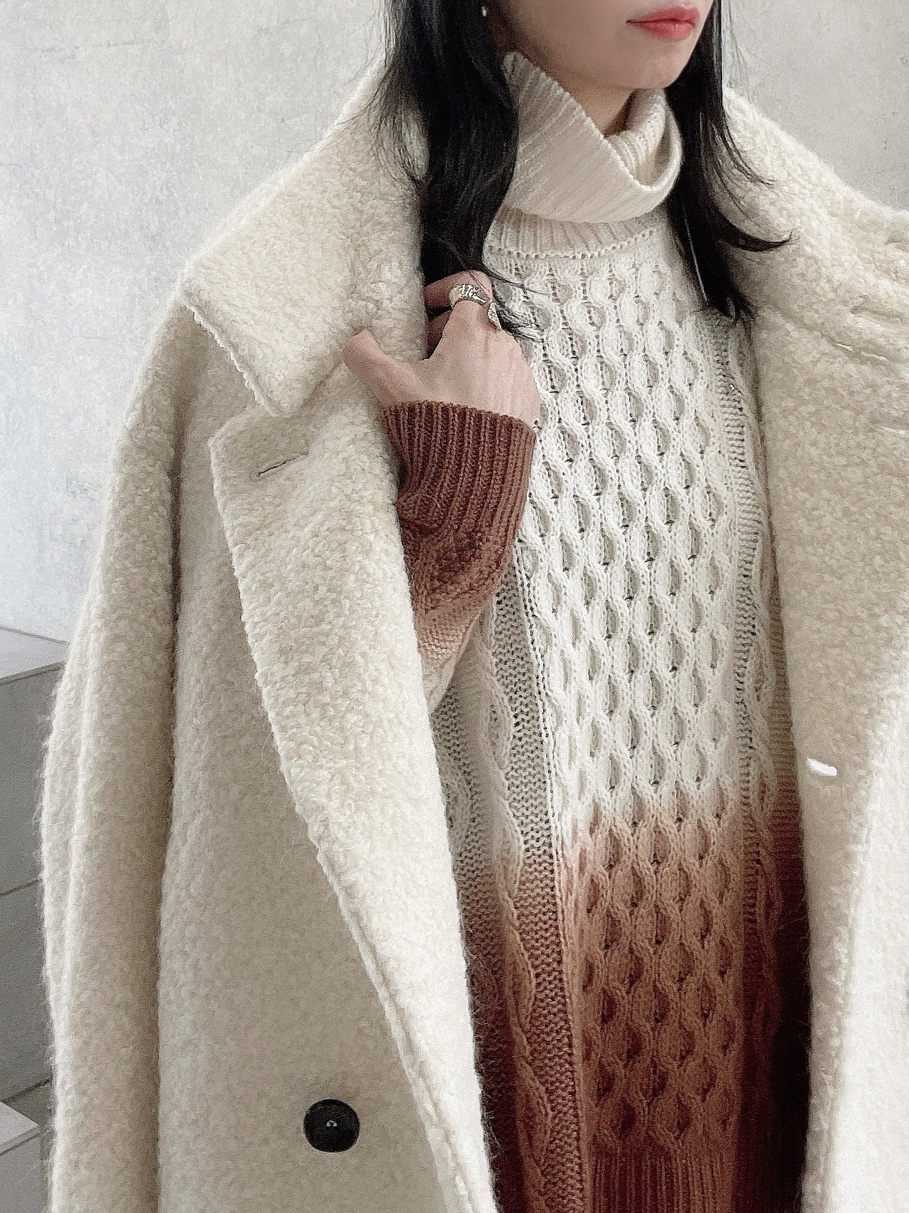 グラデーション染色の施されたタートルネックニット。カプチーノのようなカラーがフランスらしいカラーリング。