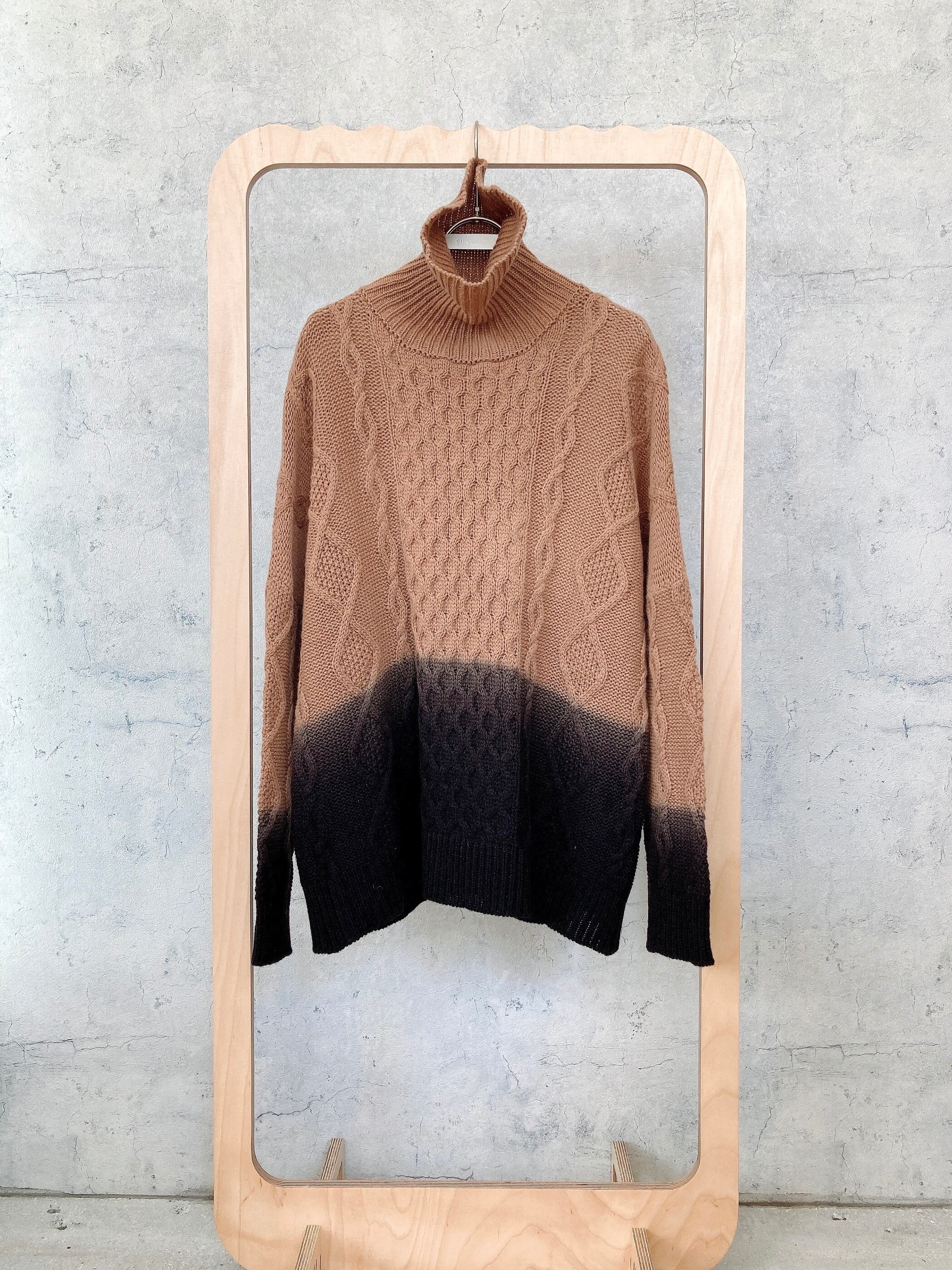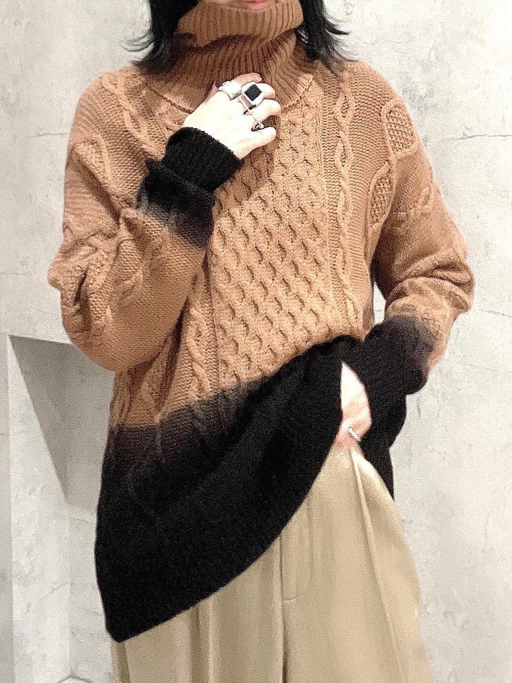 グラデーション染色の施されたタートルネックニット。チョコレートCookieのようなカラーが馴染みながらもスタイルのポイントに。