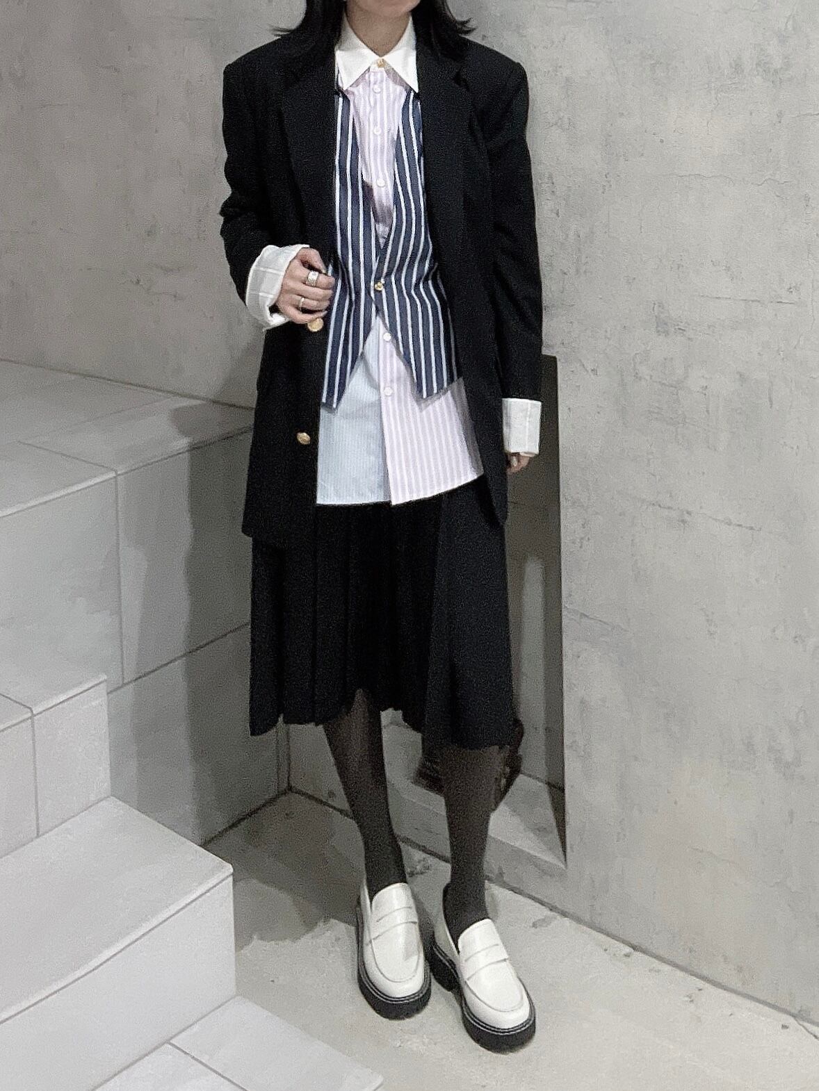 丈の長さもひざ下であり、プリーツの広がりも広がりすぎずIラインに落ちるため、トップスとバランスのとりやすいボトムスでです。